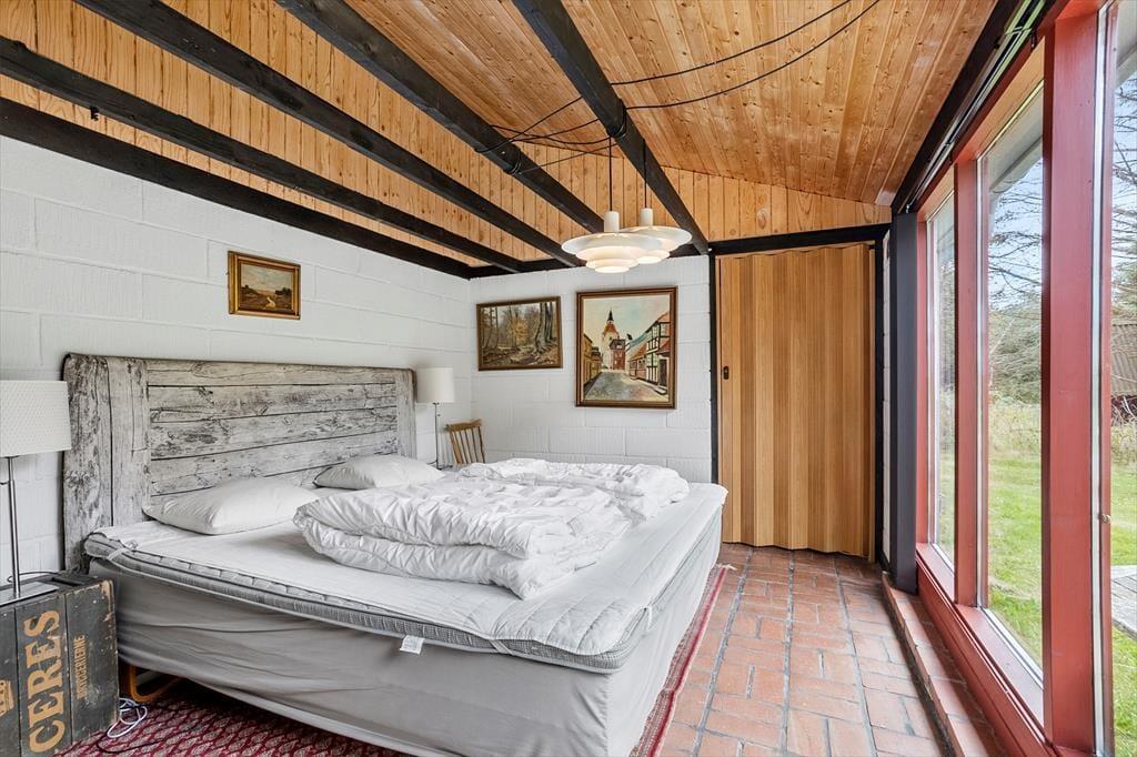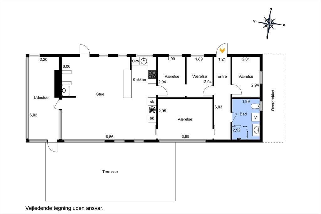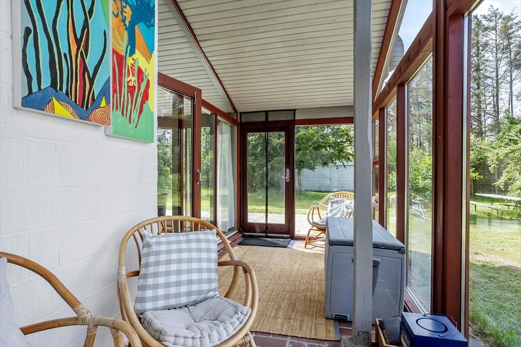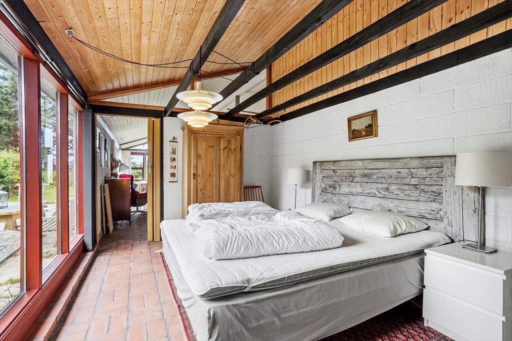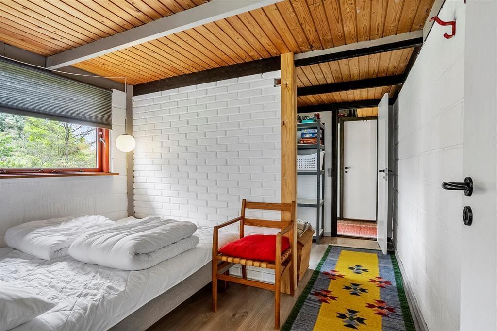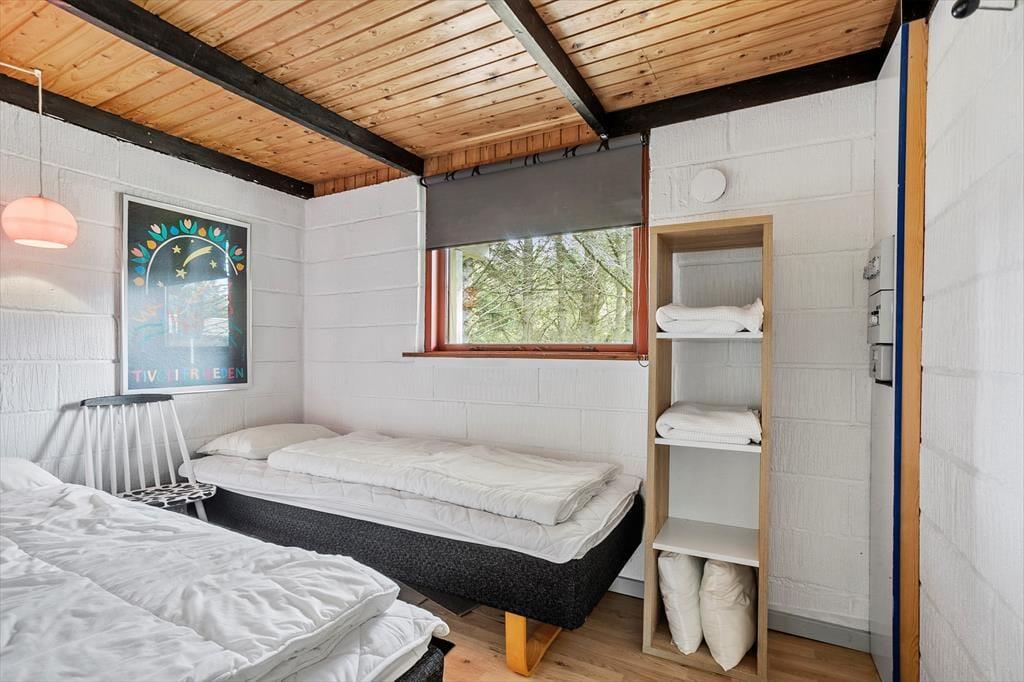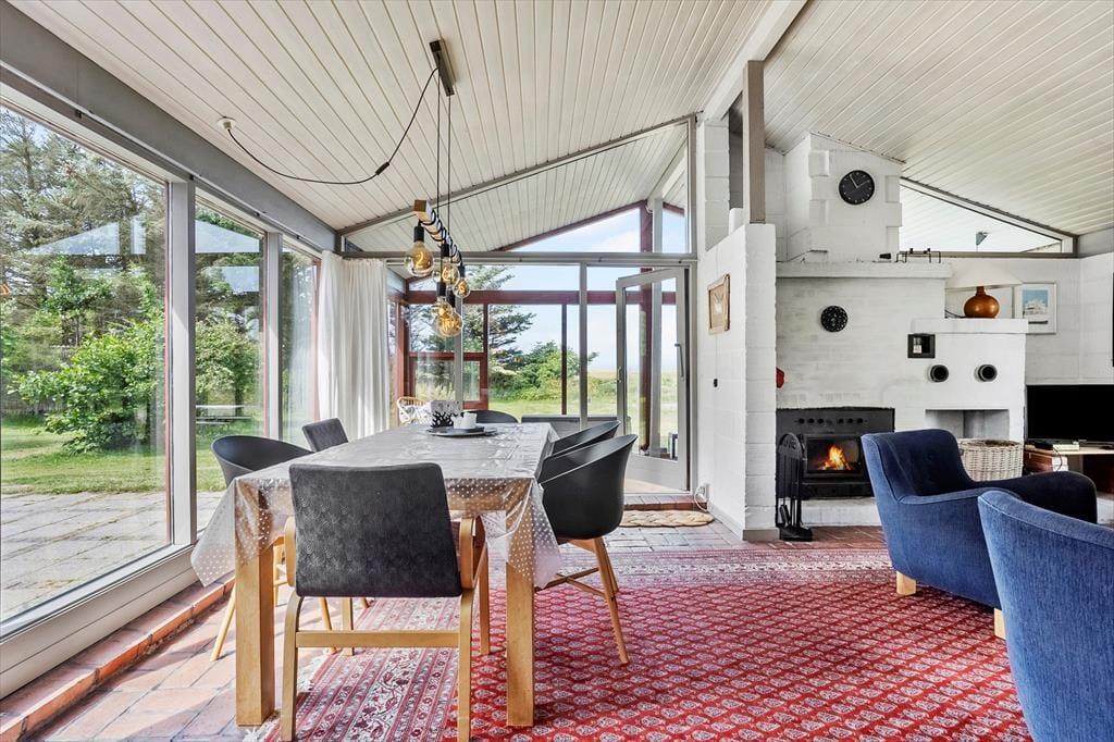 Det 110 m2 store sommerhus har med tre soveværelser og et badeværelse en fornuftig planløsning til seks personer. Huset fungerer fint som base for en børnefamilie såvel som en flok venner, der trænger til at holde ferie og have god tid til hygge og socialt samvær. Når der skal laves mad, behøver I ikke at gå glip af det gode selskab, for køkkenet ligger i åben forbindelse med stuen. Nær sofaarrangementet er der en indbygningspejs, og spisebordet er placeret, så I har et fint kig ud mod landskabet mod vest. Det grønne omgivelser kan også nydes fra udestuen, der har loft til kip og en lys atmosfære præcis ligesom resten af opholdsafdelingen.