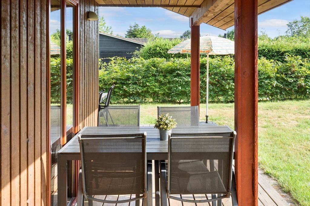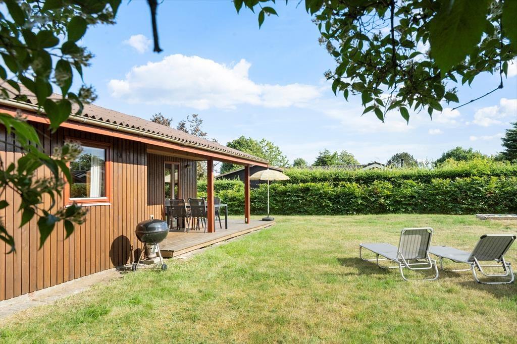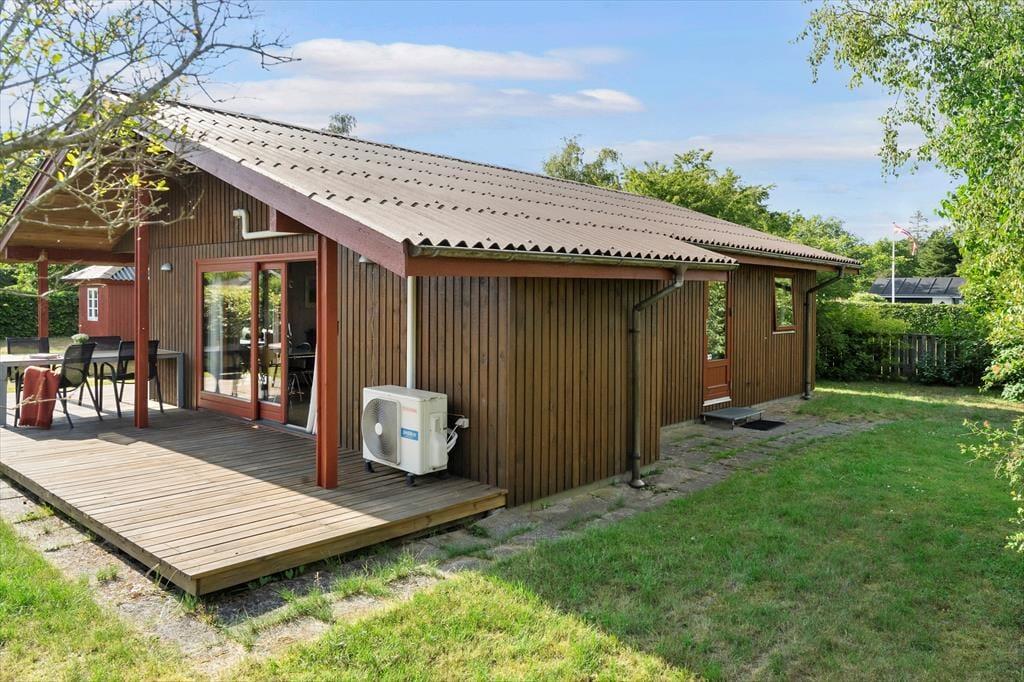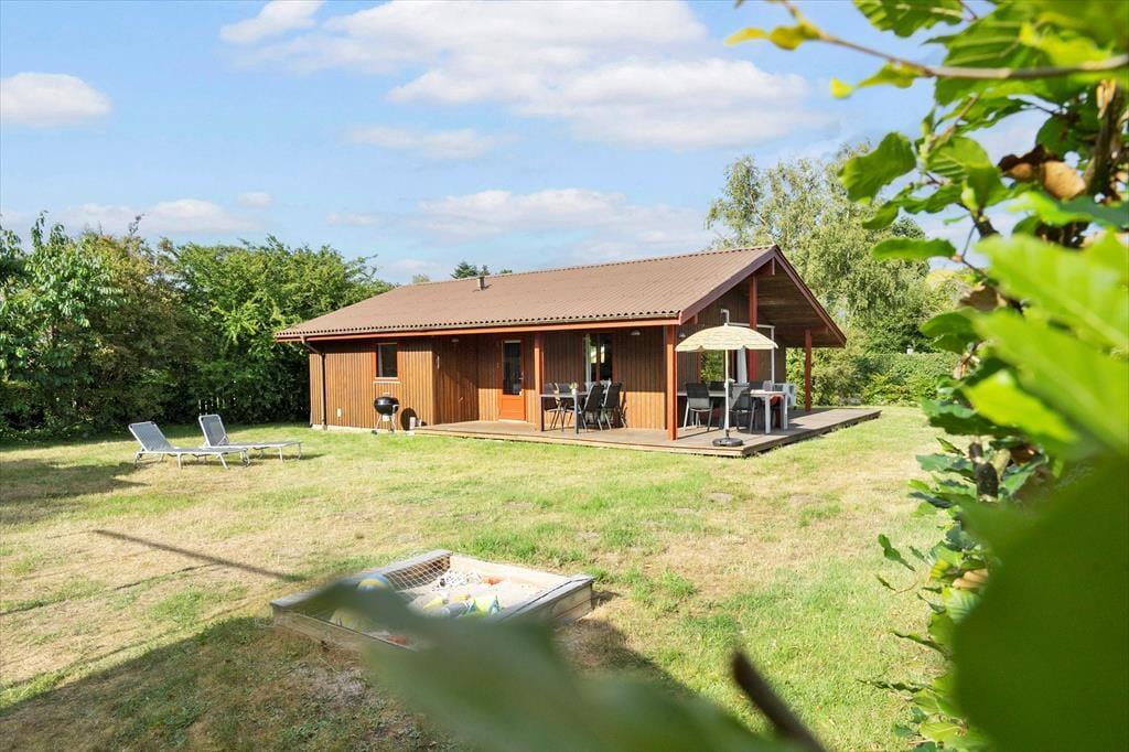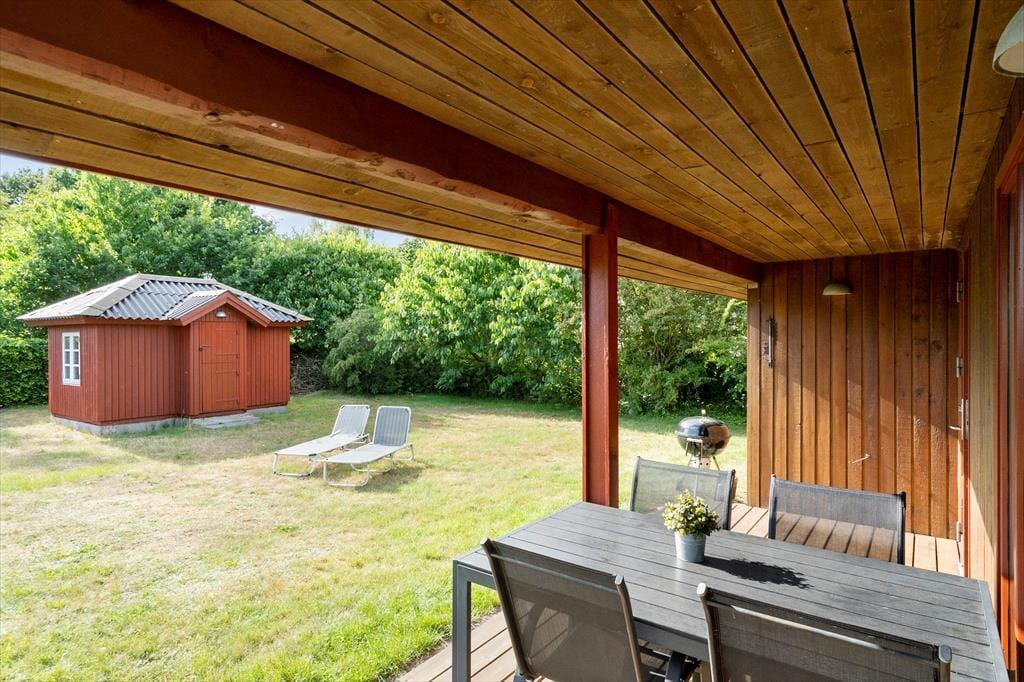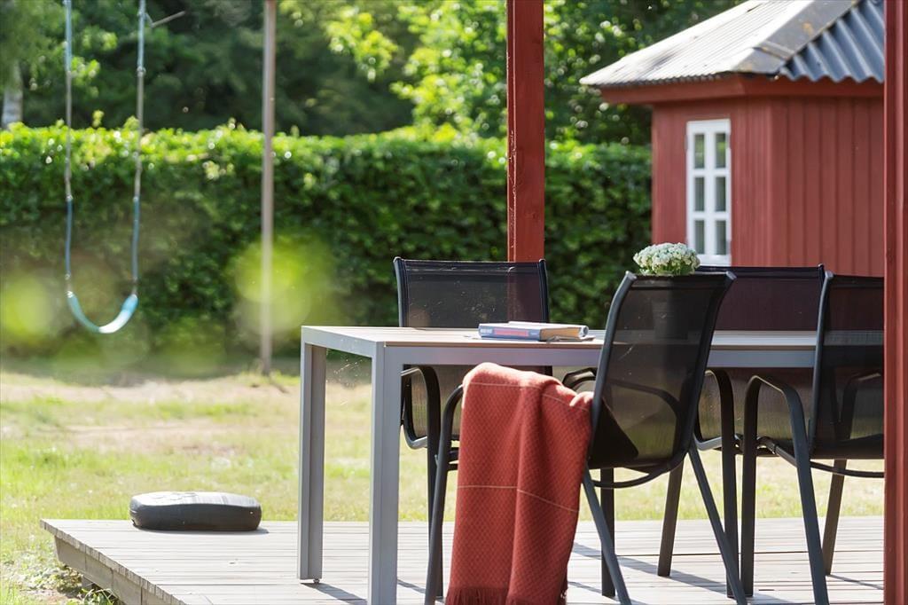 Sommerhuset ligger på en dejlig grund med en børnevenlig have, der er lukket og tryg for familiens yngste. Her er der både sandkasse og gyngestativ, så børnene har masser af plads til leg, mens de voksne kan finde roen på terrassen. Rundt om huset løber en stor træterrasse, hvor du kan følge solen hele dagen. Fra morgensolen til grillmiddage i aftenskumringen bliver terrassen det naturlige samlingspunkt, hvor udelivet får lov til at fylde. Den lukkede have og de mange små hjørner giver privatliv og en rar fornemmelse af at være helt tæt på naturen.