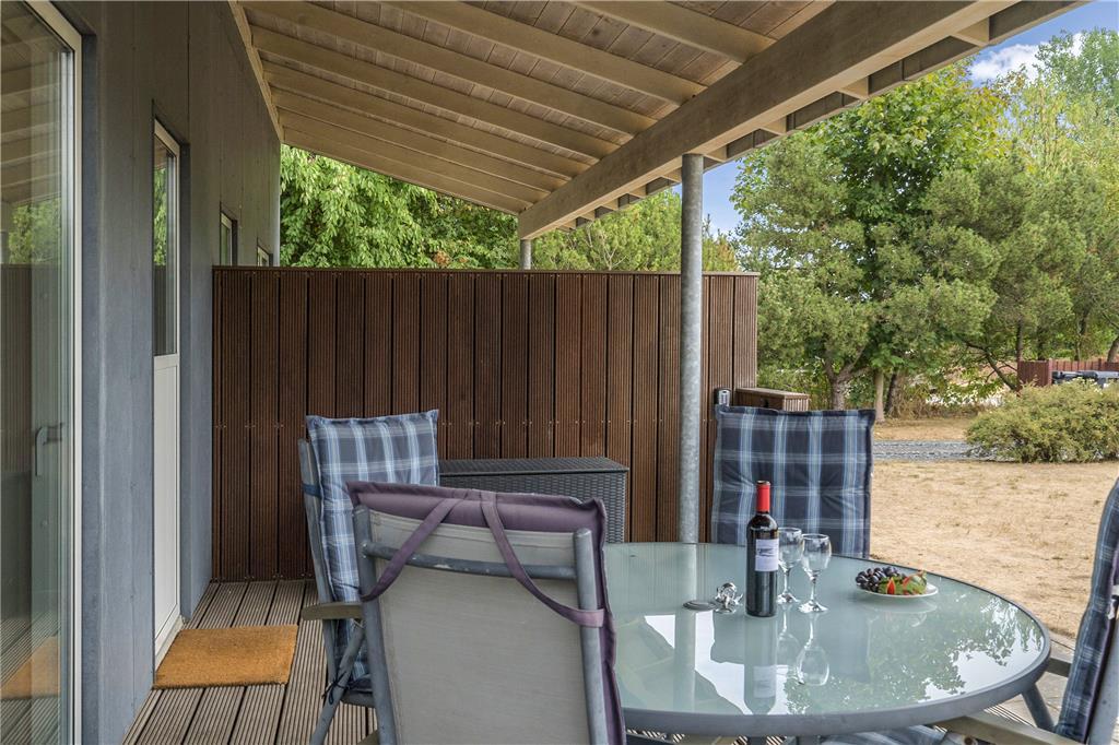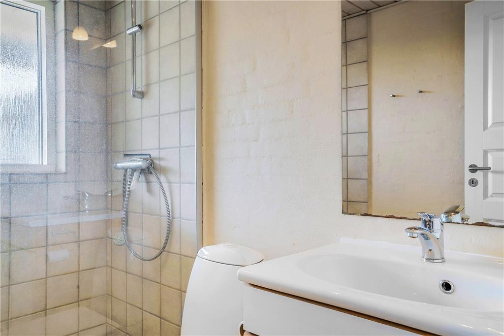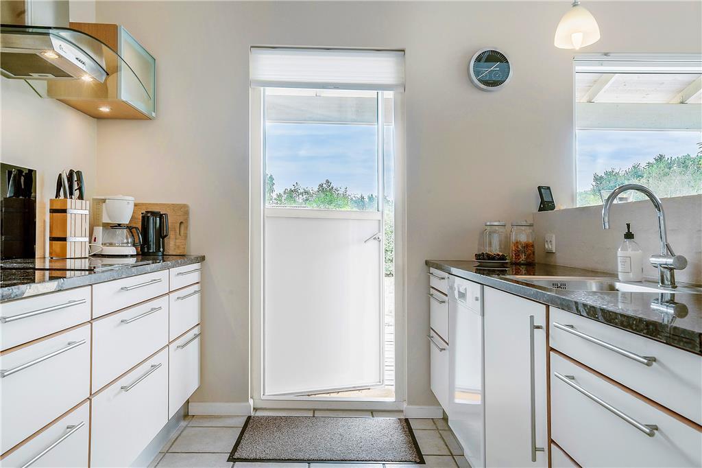 Udelivet er en vigtig del af ferien, og her er sommerhusets store træterrasse det oplagte sted at tilbringe dagen. Den har både en åben og en overdækket del, så du kan nyde solen fra morgenstunden eller finde skygge midt på dagen. På terrassen kan du dække op til grillaftener, læne dig tilbage i en liggestol eller blot nyde en stille stund med udsigten til haven. For børnene er der sandkasse og gynge, så de trygt kan lege, mens de voksne slapper af. Den udendørs bruser er perfekt efter en tur i havet, og de grønne omgivelser giver plads til både leg, afslapning og hyggelige stunder i det fri.