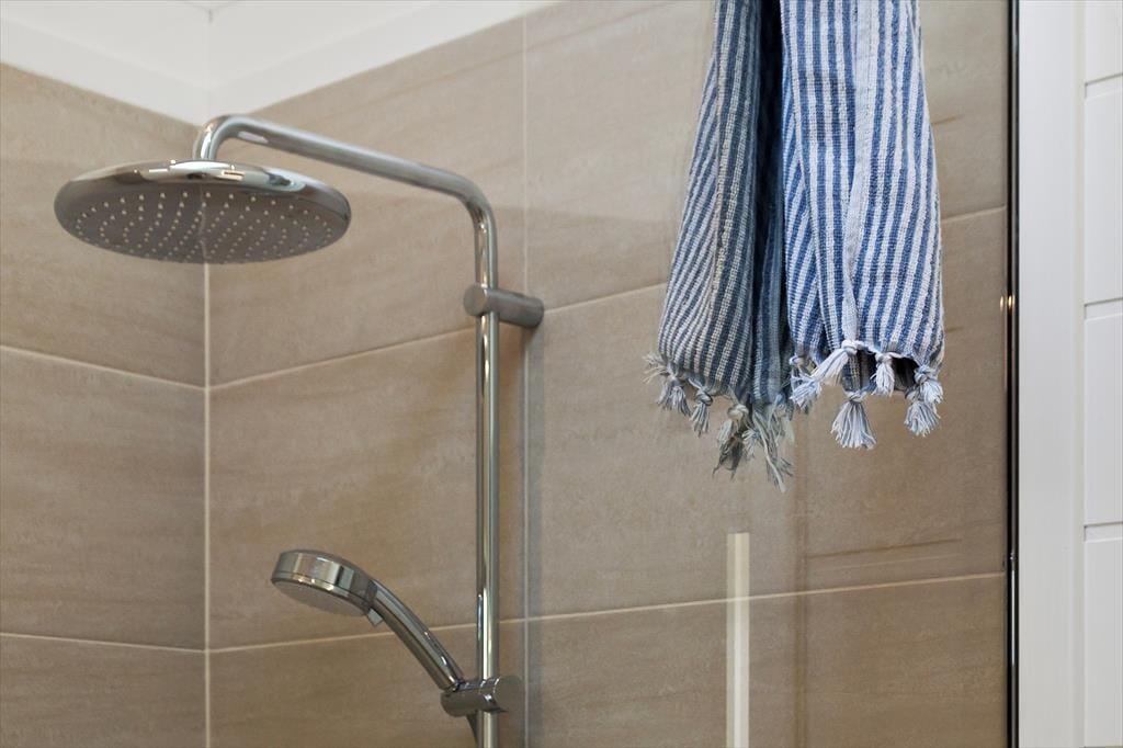 Fra fordelingsgangen er der adgang til det andet badeværelse, der også har en fin størrelse, brusekabine og samme lyse fliser, der gør badeværelset indbydende og funktionelt.