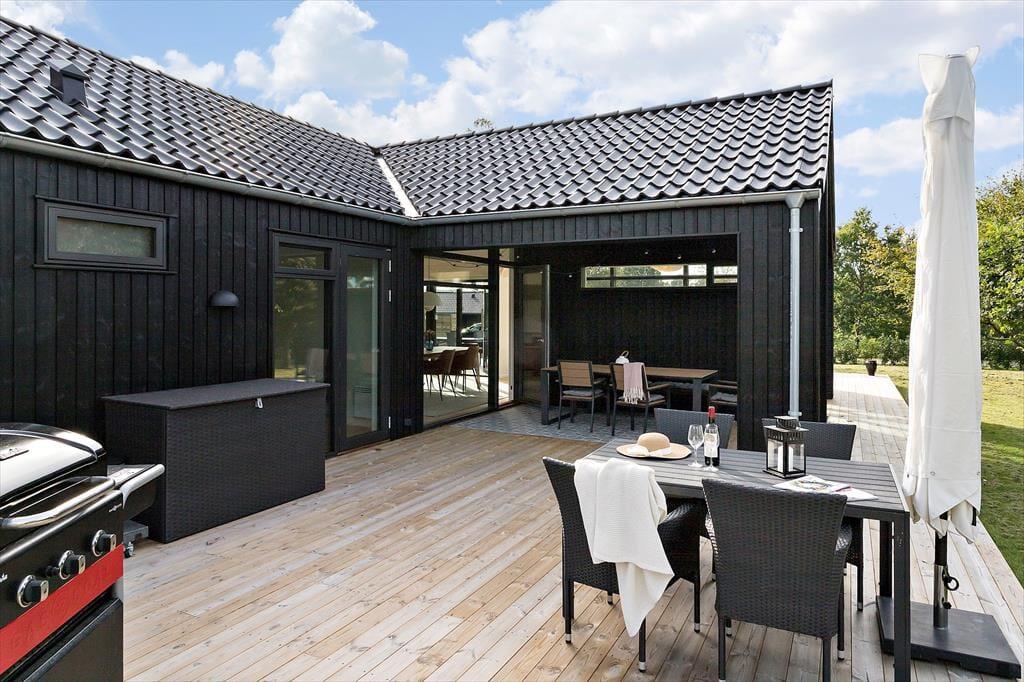 Sommerhuset ligger i et roligt sommerhusområde, men er omkranset af hæk, træer og stakit, så man kan være ugeneret i haven og nyde roen på terrassen. I haven er en stor græsplæne, så den er åben og har plads til leg. Omkring huset er en forhøjet træterrasse, der giver gode muligheder for at tage sine måltider og hyggen med udenfor. Den sydvendte terrasse er stor og åben med direkte udgang fra køkkenet, så når vejret tillader det, er det ideelt at tage sine måltider med ud og sætte sig i de gode havemøbler. Terrassen fortsætter rundt om huset, hvor der er en overdækket udgang fra køkkenet og mere læ, når der er brug for det. På denne terrasse er der også gode havemøbler samt en grill, hvor feriens måltider kan tilberedes.