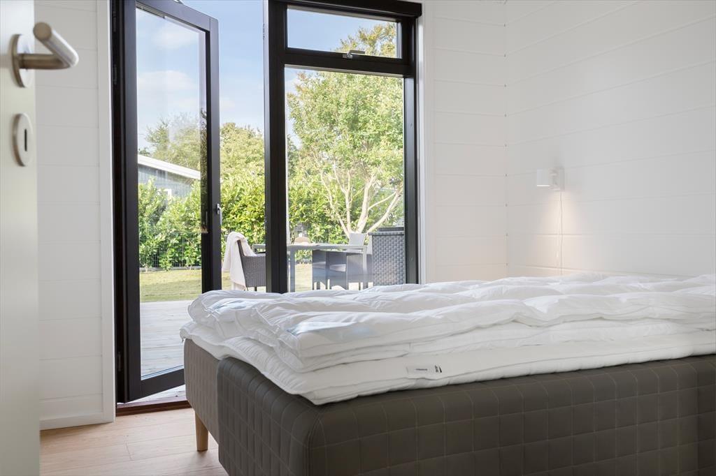 Soveværelserne er lyst indrettet med komfortable dobbeltsenge og skabsplads. På et af soveværelserne er der dog to enkeltmandssenge, som kan adskilles. Alle værelser har store gulv til loft vinduer og en havedør ud til den østvendte have eller vestvendte terrasse. De store vinduer, lyse vægge og det flotte træplankegulv er gennemgående i hele sommerhuset, hvilket gør det til et gennemført og dejligt hus at være i.