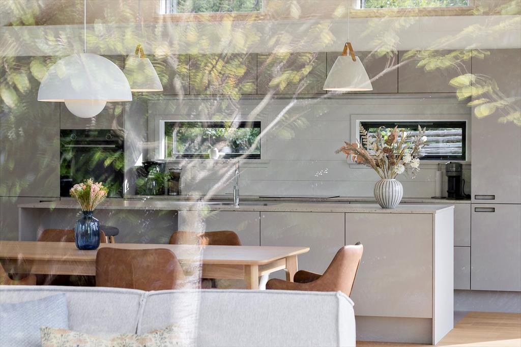 Køkkenet er i et enkelt og stilrent design, hvor der er højt til loftet og ikke mindst masser af skabs- og bordplads. Her er alle de nødvendige faciliteter til rådighed i køkkenet, bl.a. opvaskemaskine, køleskab med frys og ovn. En køkken-ø gør det muligt at stå i køkkenet og samtidig være med i samtalerne ved spisebordet, eller man kan sætte sig på køkken-øens barstol og hjælpe med at snitte grøntsagerne.