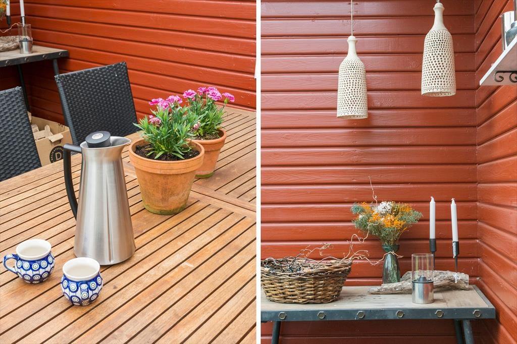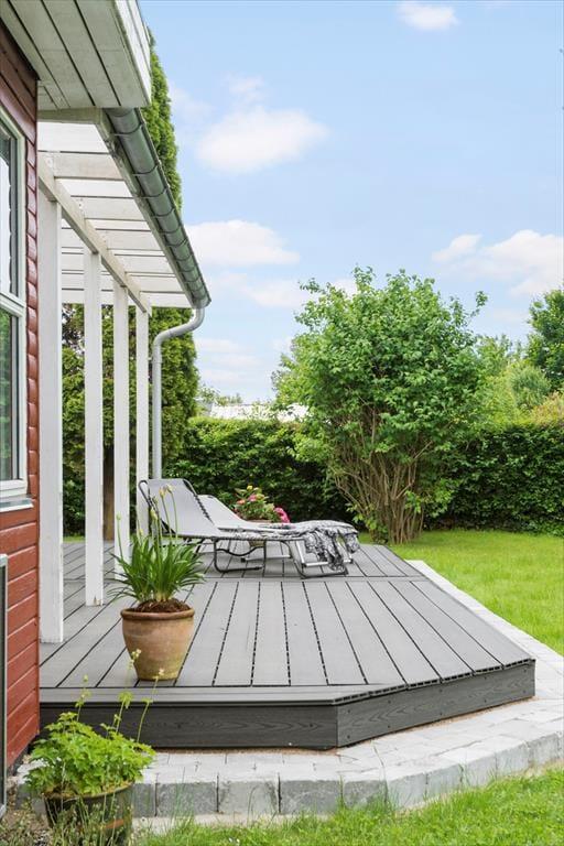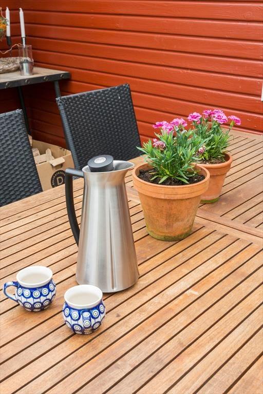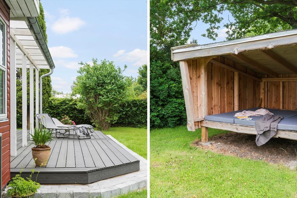 Huset har en delvis overdækket terrasse, så udelivet kan nydes i alt slags vejr. På terrasserne er der fine havemøbler, parasol og to liggestole, hvor der er mulighed for at slappe af med en god bog.