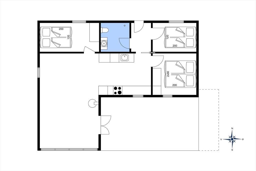 Huset har tre soverum, som alle har gode dobbeltsenge. Badeværelset har et toilet og en bruser, samt gulvvarme. Fra stuen er der udgang til terrasserne.