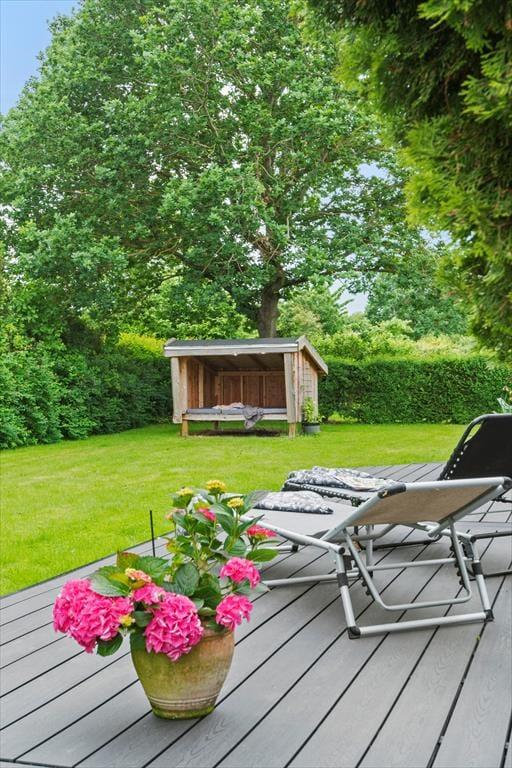 Huset har en skøn have hvor børnene kan lege dagen lang, og på terrassen finder I en grill, hvor feriens måltider kan forberedes.
