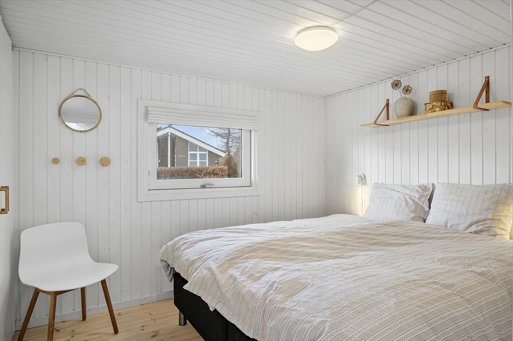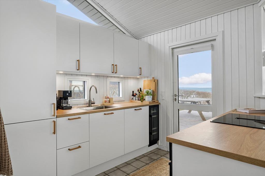 Indenfor fortsætter oplevelsen af lys og luft. Opholdsrummet er indrettet, så havet hele tiden er med i baggrunden, og de store vinduer lukker både udsigt og dagslys helt ind i rummet. Her samles I naturligt, hvad enten dagen starter stille eller rundes af i roligt tempo. I stuen står et tv med Chromecast, så du nemt kan finde en film eller serie frem, mens stemningen forbliver afslappet. Køkkenet er nyt fra 2026 og indbyder til madlavning med god tid og nærvær. Her er også vinkøleskab, som sætter prikken over i’et på feriedagene. Badeværelset er ligeledes nyt fra 2026 og bidrager til en behagelig og moderne komfort. Sommerhuset rummer tre soverum samt en hems med madrasser og tv med Chromecast, hvor der er mulighed for at trække sig lidt tilbage og nyde roen for sig selv. Vaskemaskinen gør opholdet praktisk, også når ferien varer lidt længere.