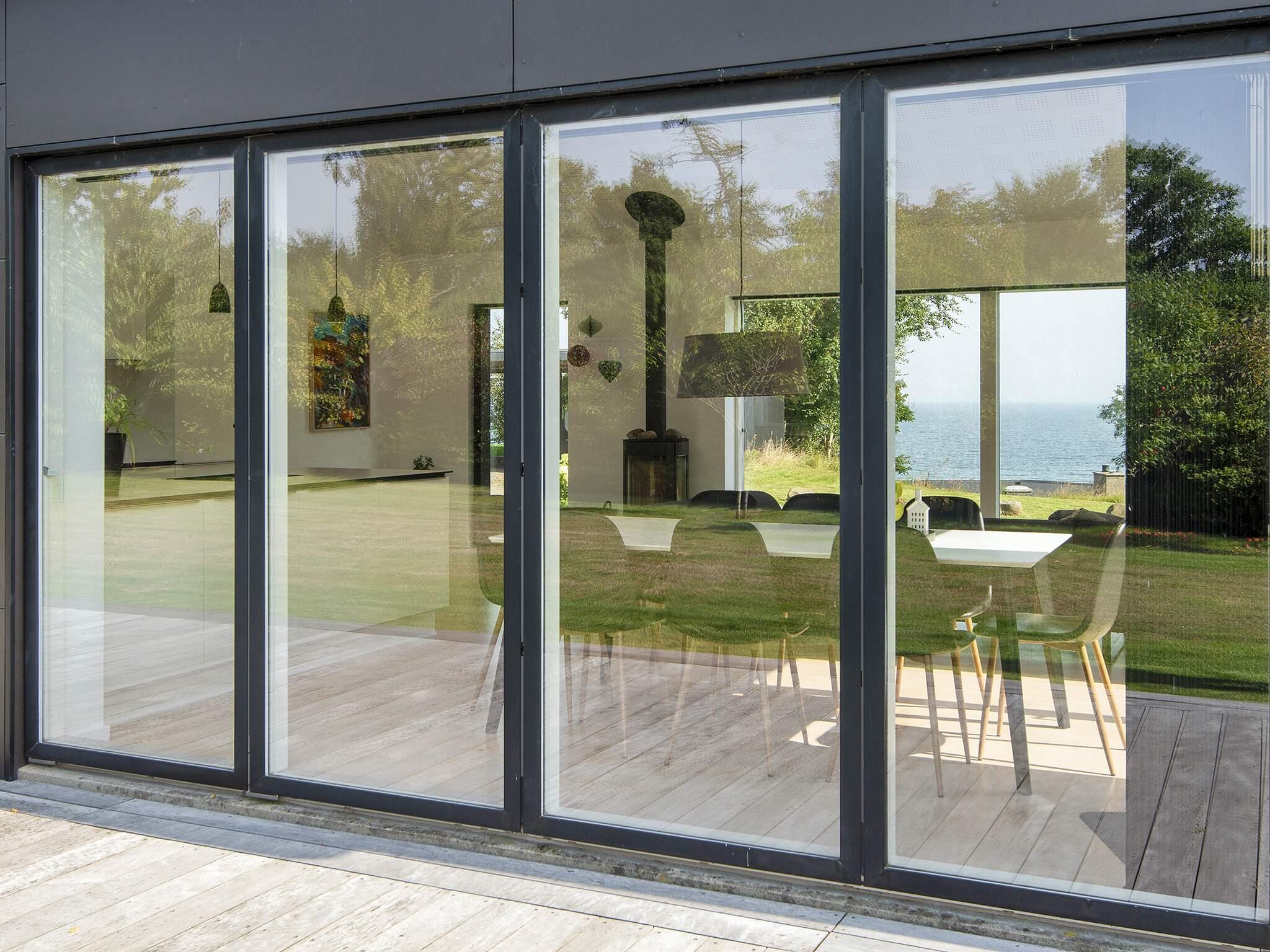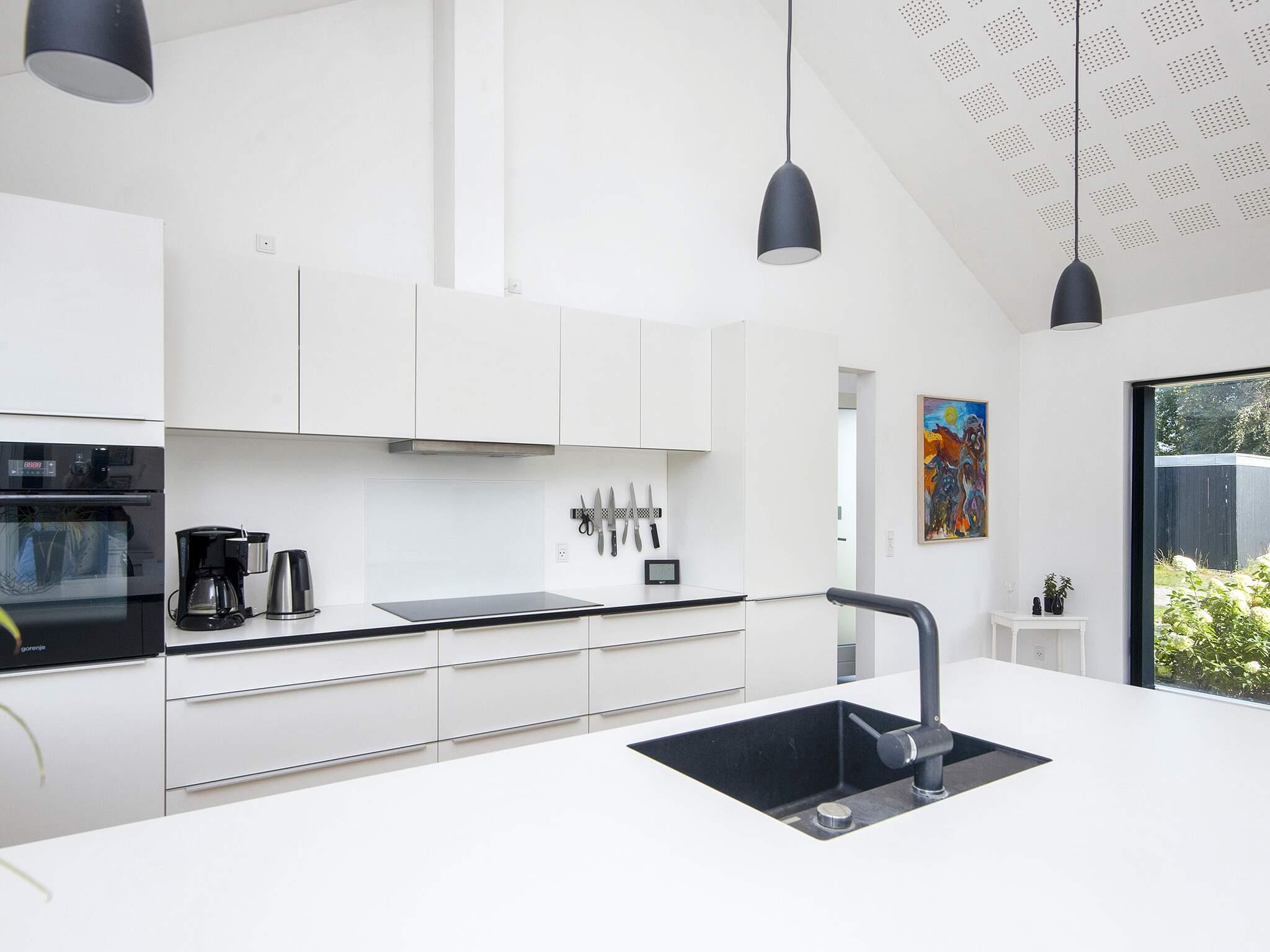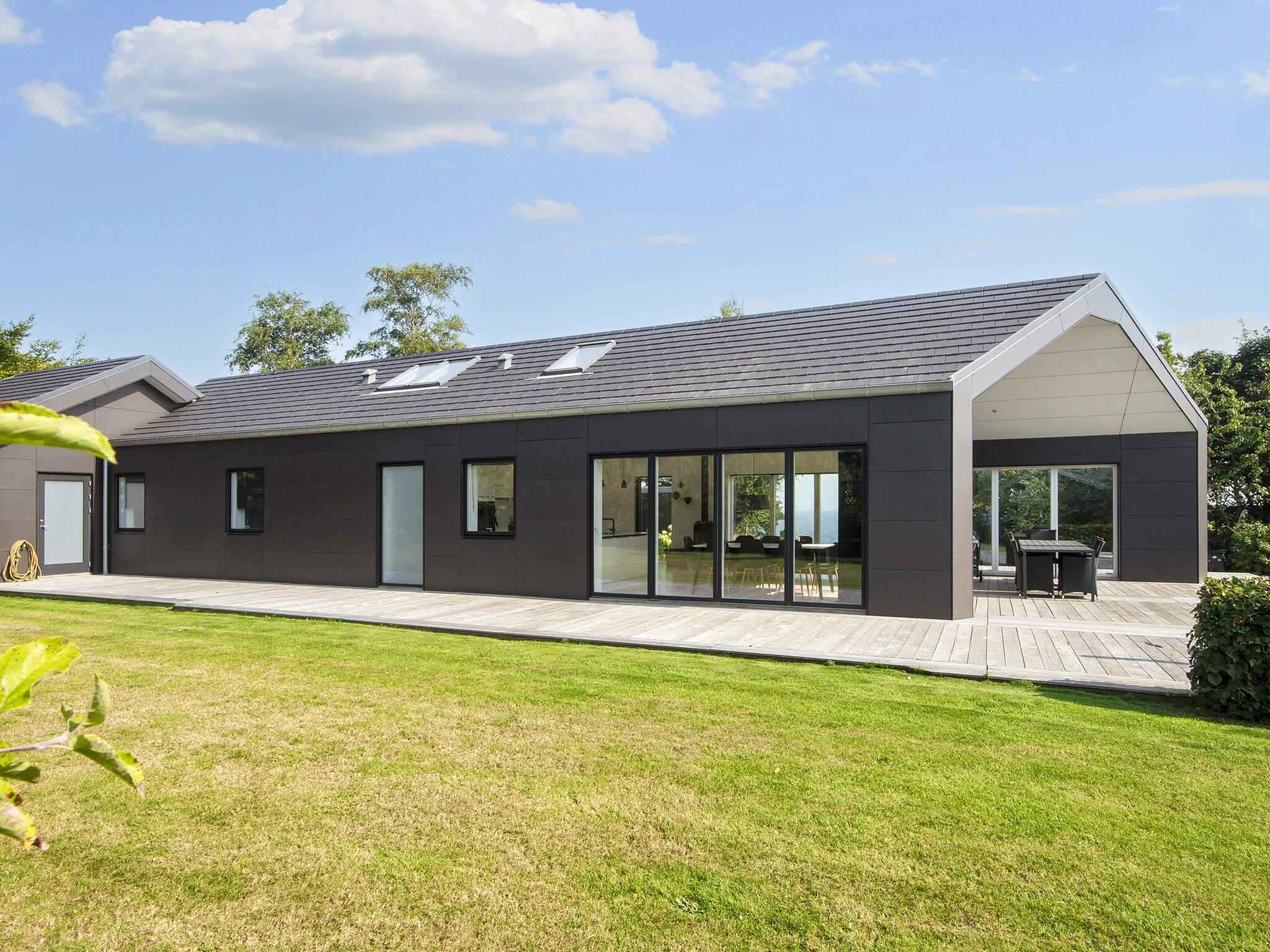 Den åbne stue flyder problemfrit ind i køkkenet og skaber et lyst, luftigt rum til madlavning, spisning og socialt samvær. Højt til loftet og store vinduespartier fylder indretningen med naturligt lys, hvilket fremhæver det stilrene design og skaber en følelse af åbenhed. Fra stuen kan du træde direkte ud på en rummelig terrasse, ideel til udendørs måltider, slappe af i solen eller blot nyde den friske havbrise.