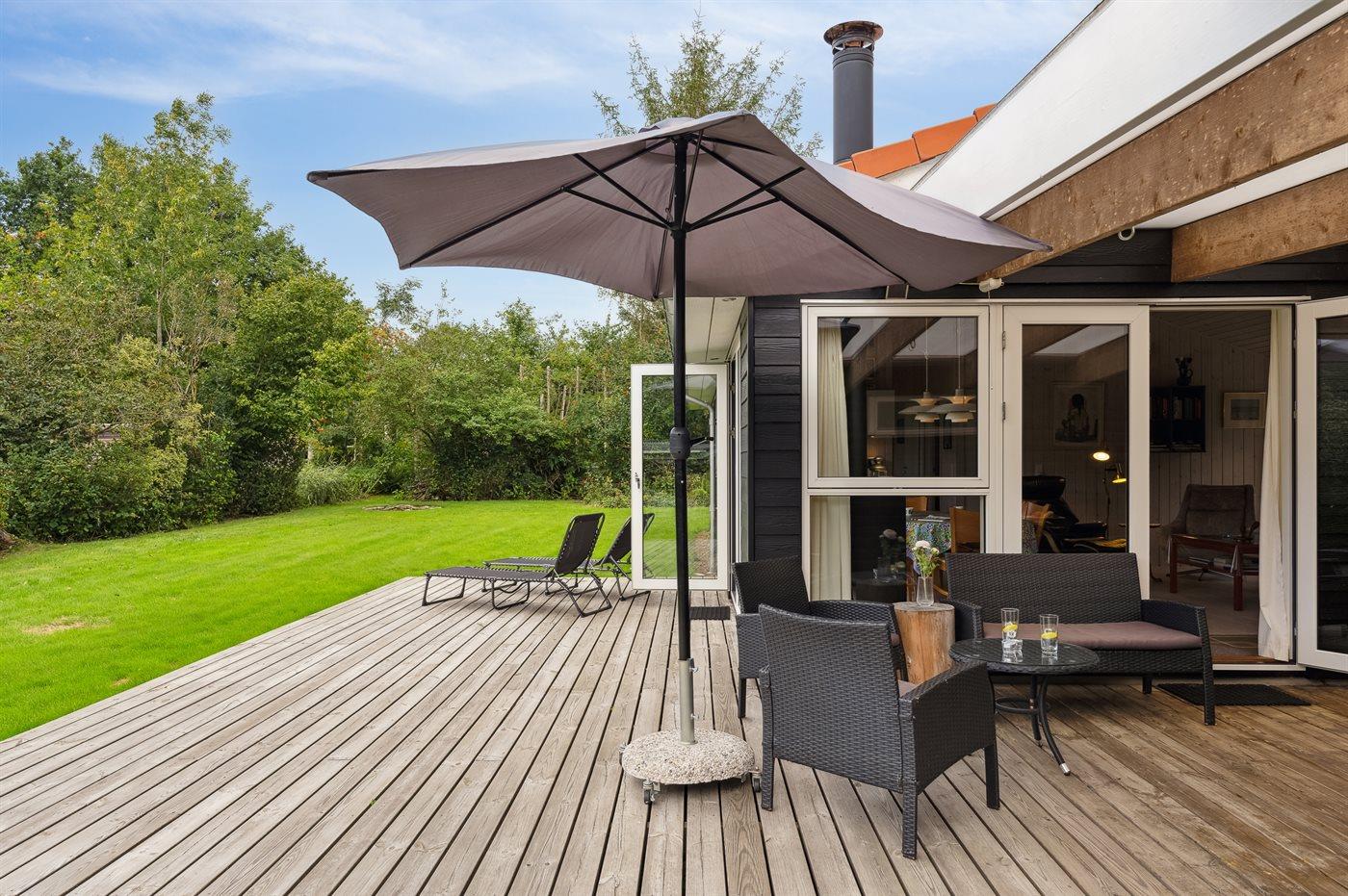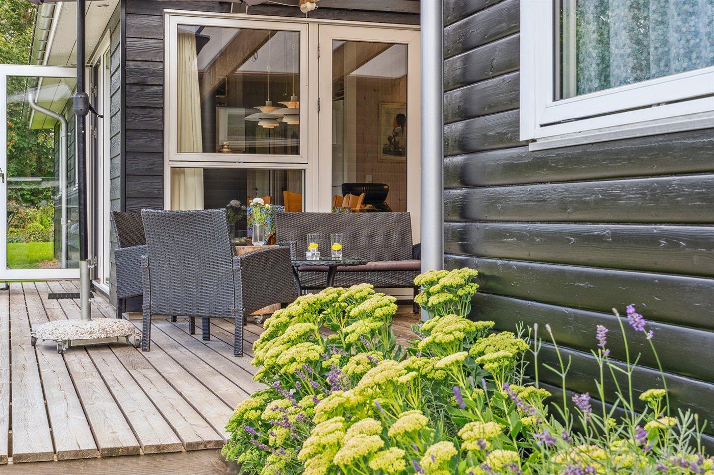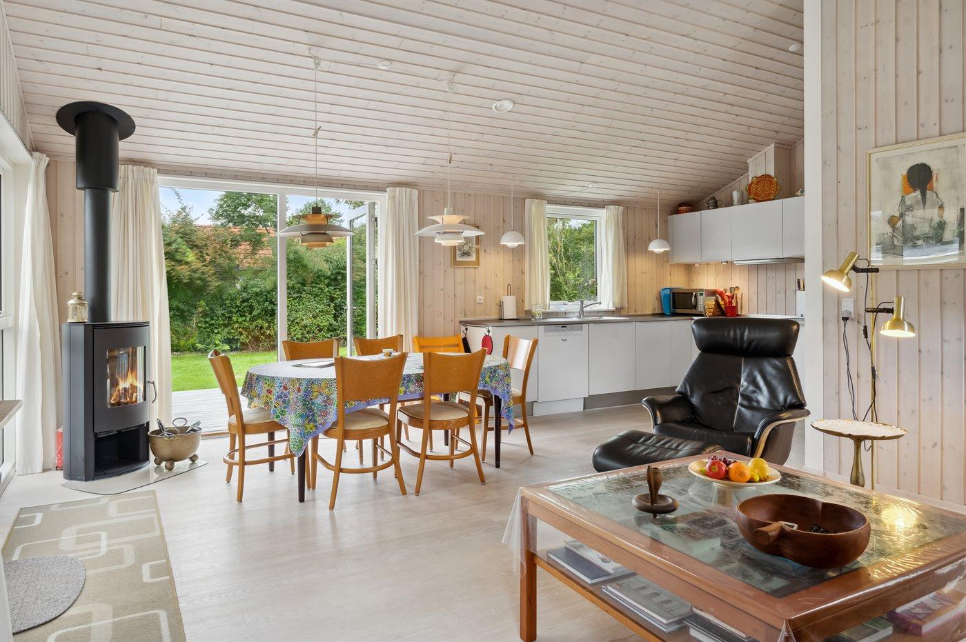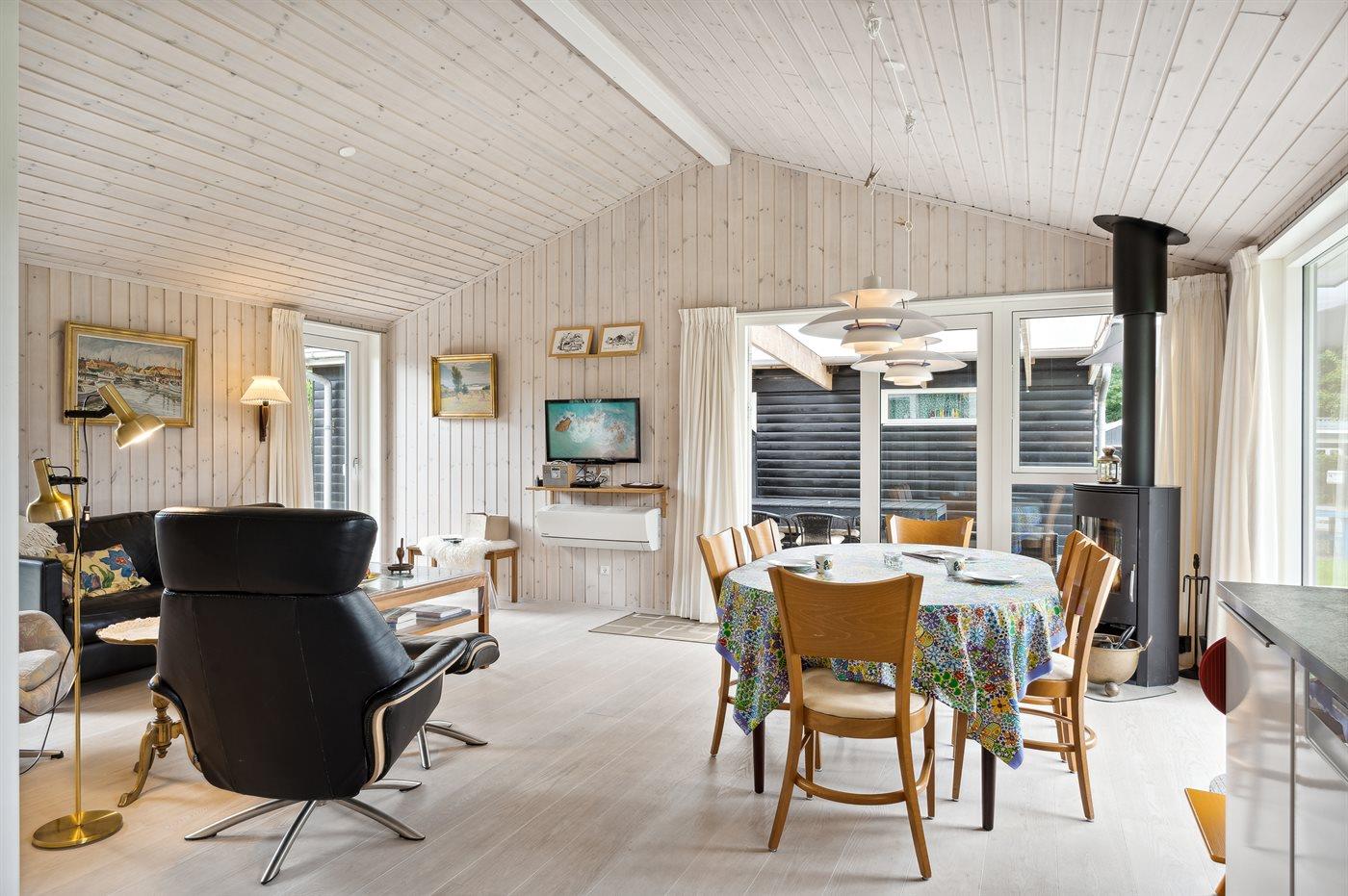 Sommerhuset fremstår lyst og moderne og med en rigtig god indretning, som passer godt til f.eks. en familie. To af sovepladserne findes i den hyggelige alkove, som kommer i forlængelse af køkken/alrummet. Sommerhuset ligger ganske ugeneret på den store grund og terrasserne er ganske skønne og delvist overdækket. Her findes terrasser på begge sider af sommerhuset, så både morgensolen og eftermiddagssolen kan nydes.