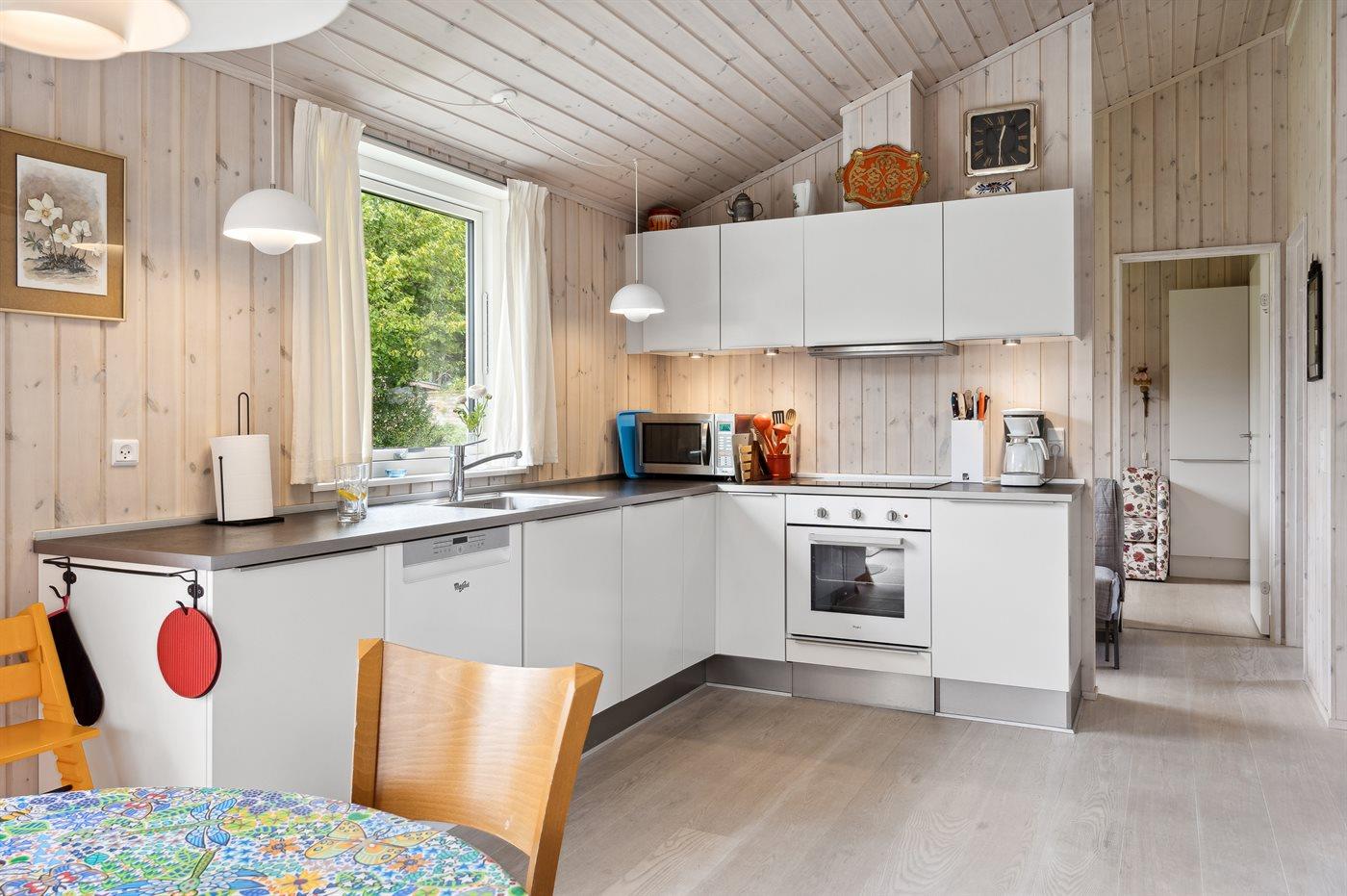 Køkkenet er udstyret med 1 køleskab. Der er 4 induktionskogeplader, varmluftovn, mikrobølgeovn samt opvaskemaskine.