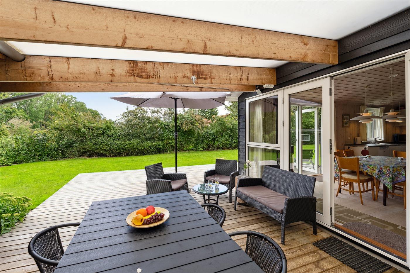 Lyst og moderne sommerhus fra 2014 ved Rude Strand med kort afstand til børnevenlig sandstrand og skønne terrasser.