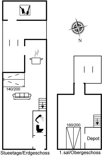 Bemærk, at de to af sovepladserne er på en sovesofa i stuen, og at trappen til 1. salen ikke er velegnet til gangbesværede. Der er enkelte steder i huset, hvor der er begrænset loftshøjde.