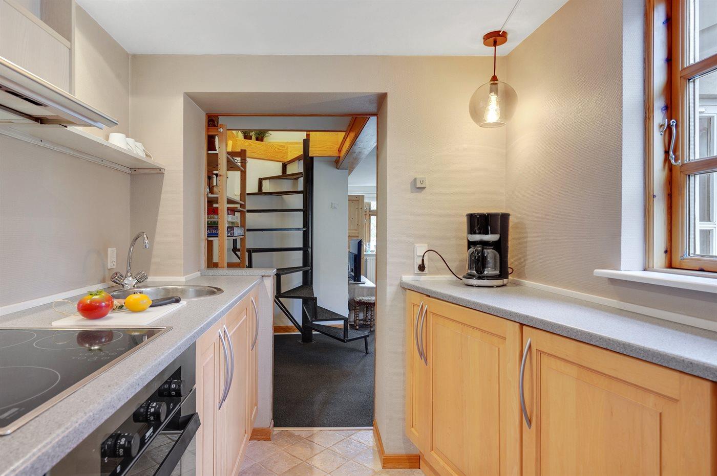 Køkkenet er udstyret med 1 køleskab. Der er 4 keramiske kogeplader, varmluftovn, mikrobølgeovn Der er gulvvarme i køkkenet.