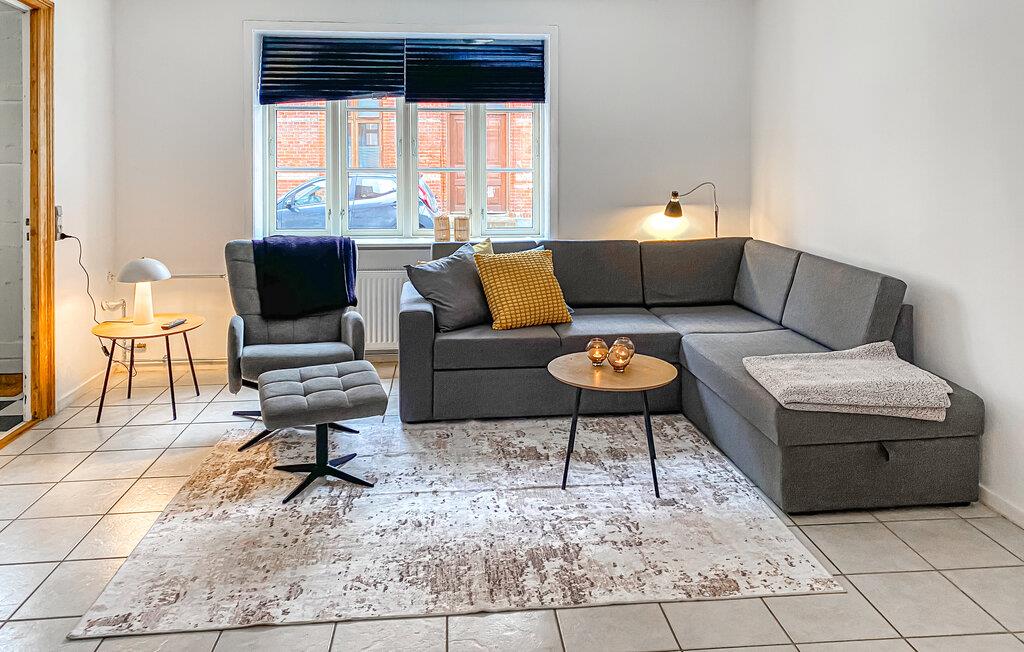 Nyd kombinationen af ??murstensfacaden og det moderne interiør. Slap af i den store hjørnesofa og brug opholdsstuen til hyggelige aftener foran fjernsynet. En lænestol komplementerer siddeområdet og skaber en skøn oase. Den åbne spisestue giver jer gode rammer til fælles måltider. Find sammen her og planlæg jeres udflugter over en kop kaffe. Tilbered jeres måltider i det moderne køkken. Den lange bordplade og de enkle apparater gør det nemt at lave mad selv. De store vinduer lukker masser af naturligt lys ind og tilbyder udsigt over de omkringliggende karakteristiske huse.