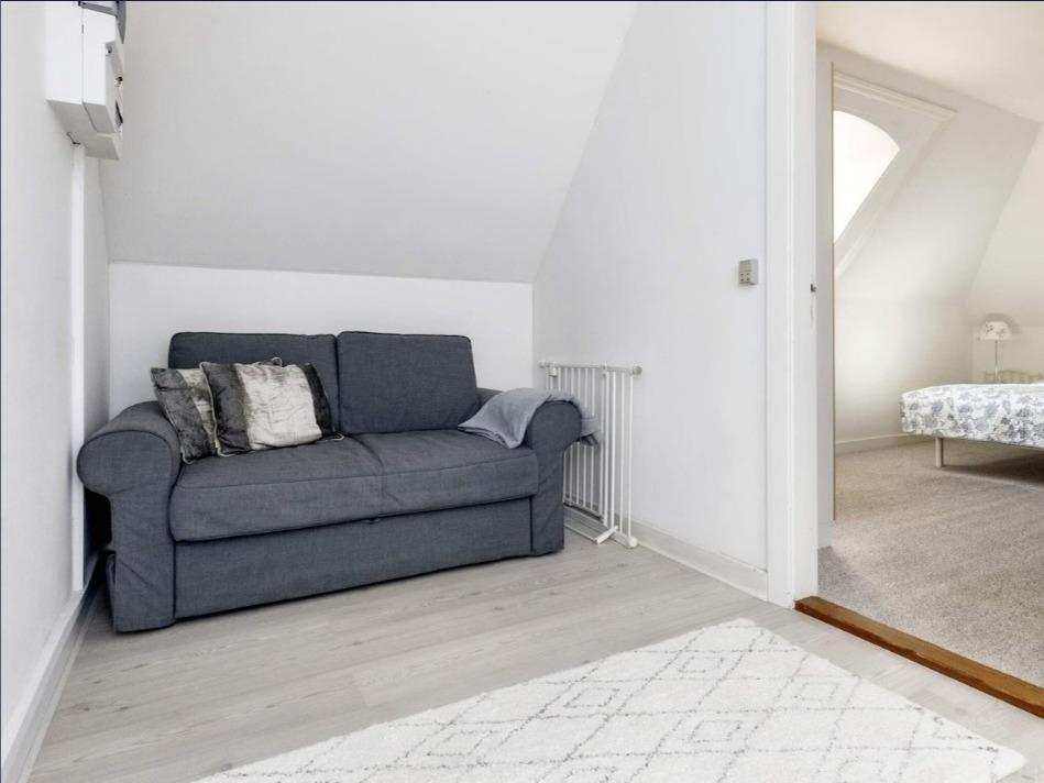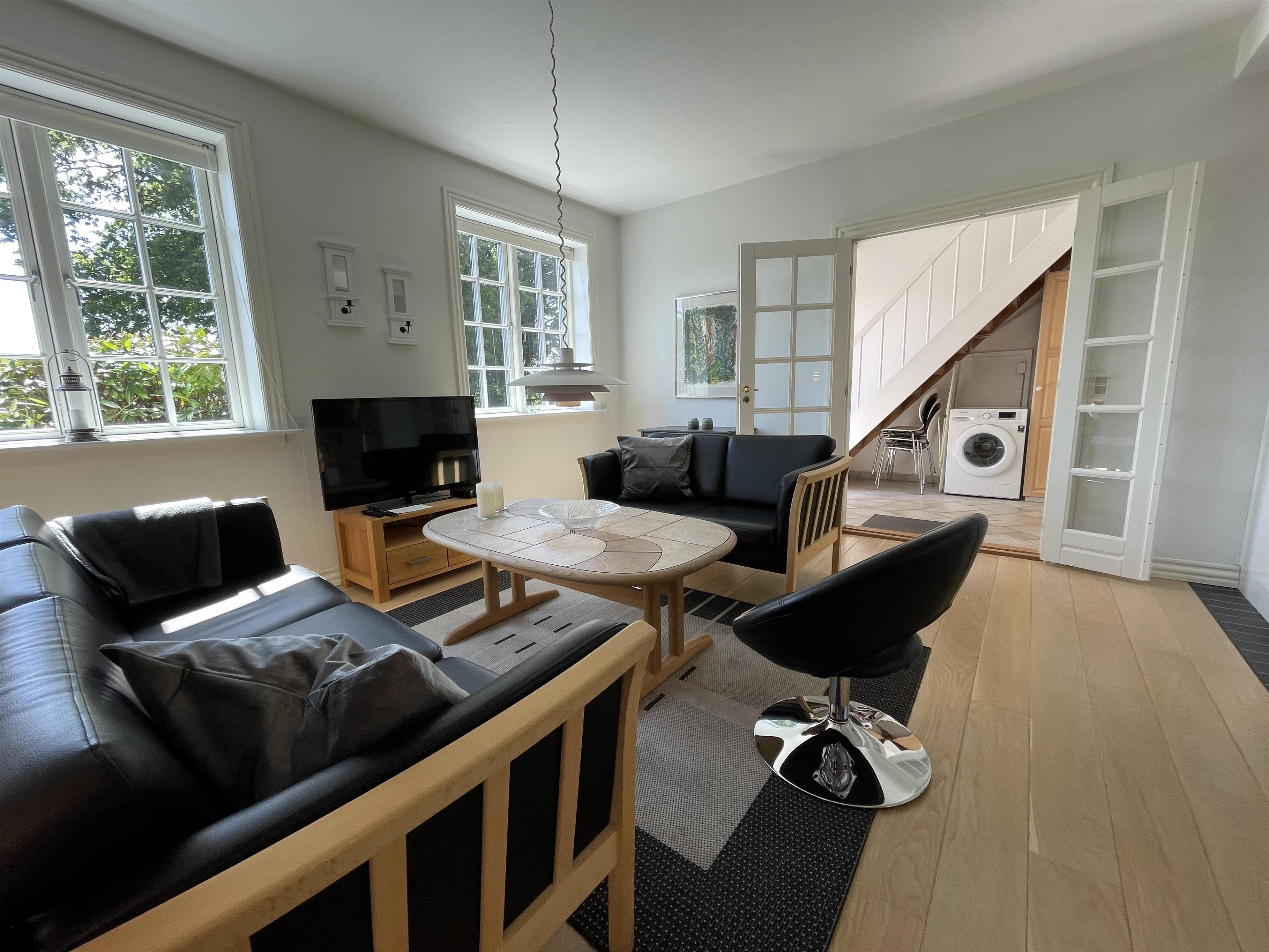 Lejligheden er renoveret i 2015 og fremtræder lys og moderne. Den indeholder et utroligt fint og veludstyret køkken, så der er god mulighed for selv, at lave mad, som kan nydes ved det hyggelige spisebord, hvorfra der gennem sprossevinduerne er udsyn til en smuk "gammel" have. Derudover er der en sofagruppe i læder, sofabord og tv, som kan benyttes, når dagen går på hæld, og I har lyst til at trække jer indenfor. I entréen er en trappe, der fører op til soveværelserne. Der er 2 soveværelser med enkeltsenge, som i begge rum kan skubbes sammen til en dobbeltseng, hvis man ønsker det. På repos står en sovesofa, der giver mulighed for en ekstra soveplads, og der er et godt badeværelse i stueplan.