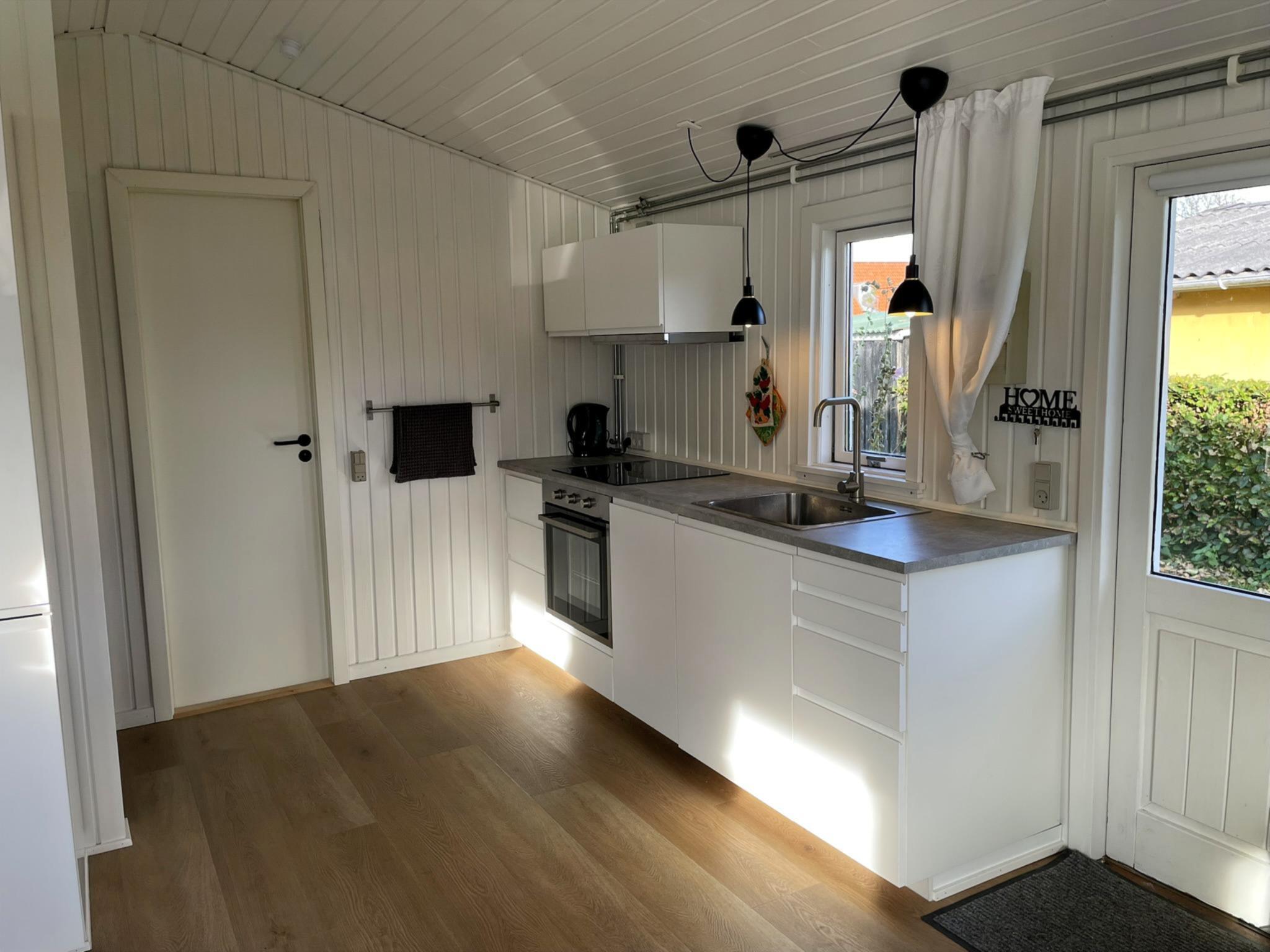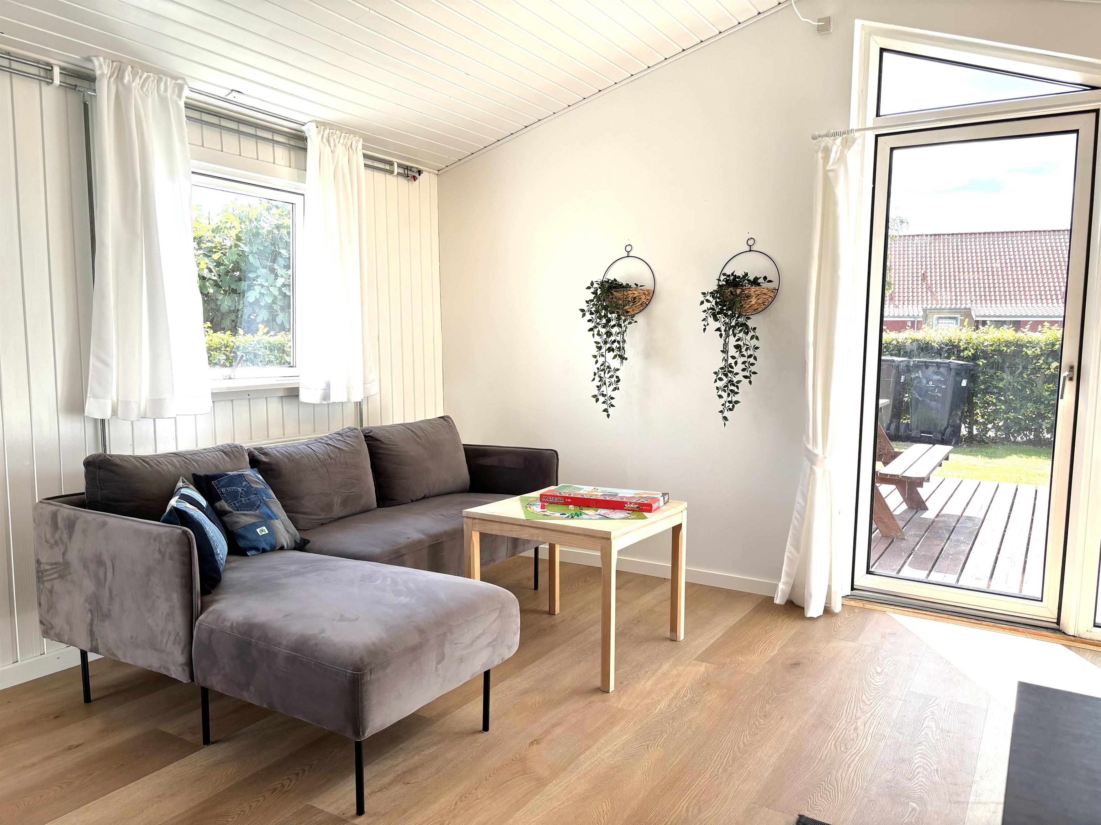 Det lille hus på 32 m² rummer et dejligt lyst køkkenalrum, et mindre soveværelse samt badeværelse, med vaskemaskine.