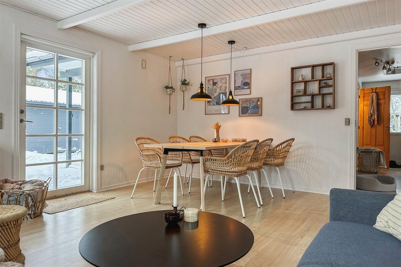 Dejligt og velholdt sommerhus i træ beliggende på en naturgrund med sand, lyng og fyrretræer samt bålsted. Stor og delvist overdækket terrasse med diverse havemøbler og kuglegrill (til kul). Huset er bygget i 1984 og senest moderniseret i 2021 med malede lofter og vægge samt delvis ny møblering. Således fremstår huset moderne og pænt. Huset er smagfuldt og hyggeligt indrettet. Den separate køkkenafdeling er udstyret med bl.a. opvaskemaskine. Opholdsstuen har direkte udgang til terrassen og indeholder bl.a. Smart-TV (Yousee app + 4 tyske kanaler), Sonos bluetooth-højtaler og stereoanlæg. Sovepladserne er fordelt på 3 lyse soveværelser; 1 med dobbeltseng og 2 med hver 2 enkeltsenge - alle senge er i god bokskvalitet. Dejligt badeværelse med bruseniche og gulvvarme. Dobbelt parkeringsplads på grunden. Der findes desuden udendørs bruser. Stort fællesareal med havudsigt ved Holsterodde med bl.a. gynger. Bemærk: Adgang til børneværelse gennem soveværelse eller fra terrassen.