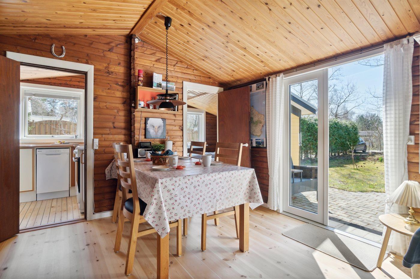 Velindrettet mindre sommerhus beliggende på en blind vej, på en grund omgivet af træbevoksning, nær vandet og skøn badestrand. Der er indrettet overdækket terrasse i carporten med eftermiddags- og aftensol.