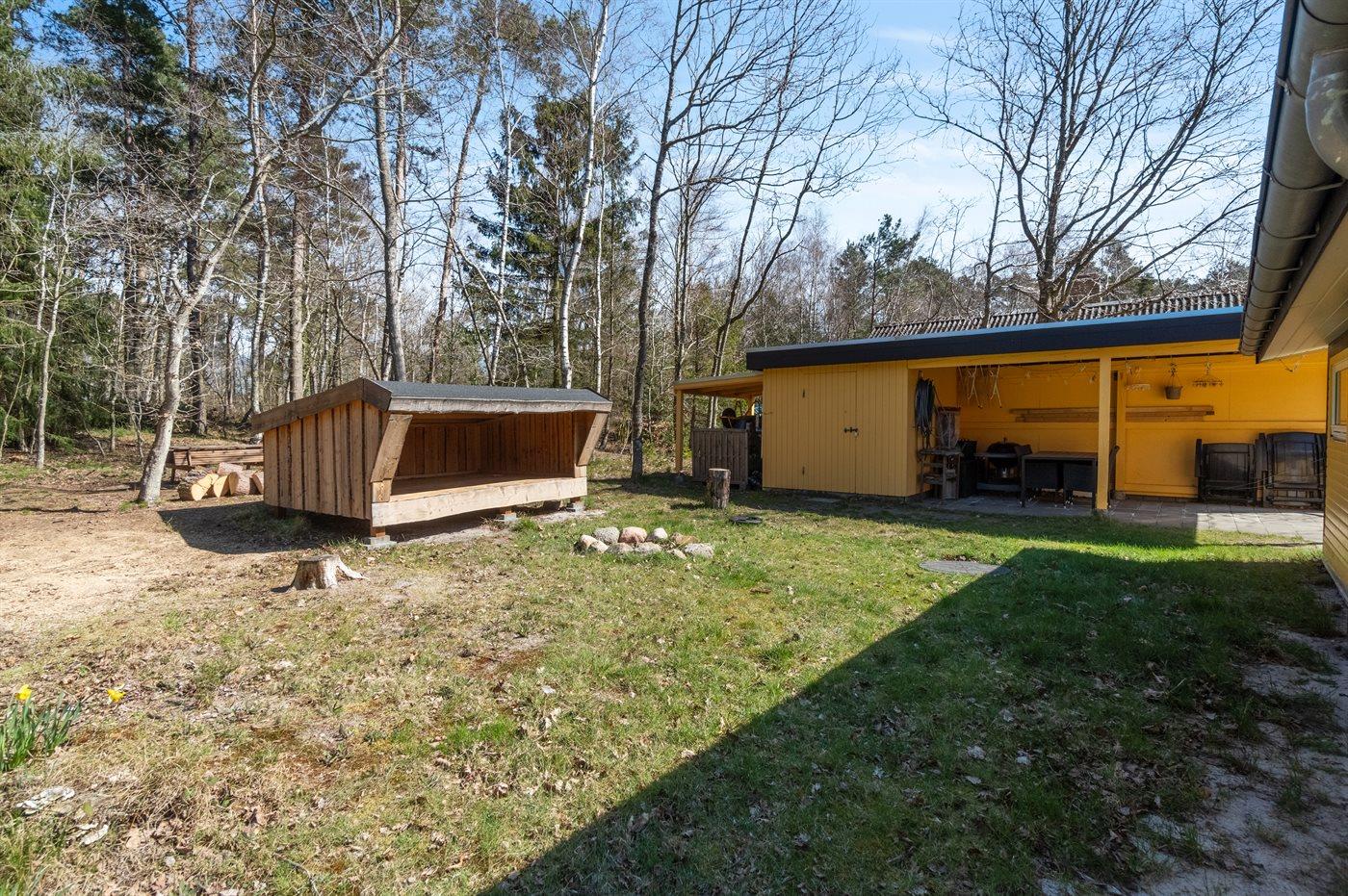 Ferieboligen er beliggende på en 1200 m² stor naturgrund. Der er 700 m til havet. Nærmeste forretning er beliggende i en afstand af 3000 m. Der er en golfbane i en afstand af 3000 m. Til ferieboligen hører 18 m² terrasseareal. Desuden er der overdækket terrasse. Gynge. Shelter til 4 personer. Udendørs bruser med varmt og koldt vand. Der er carport til rådighed. Der er installeret stik til opladning af elbil. Type 2 stik. Parkering ved ferieboligen.