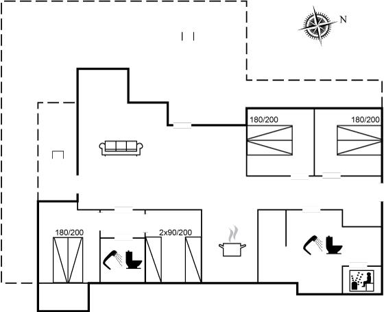 Der er 2 badeværelser med bruseniche og 2 toiletter I saunaen er der mulighed for afslapning.