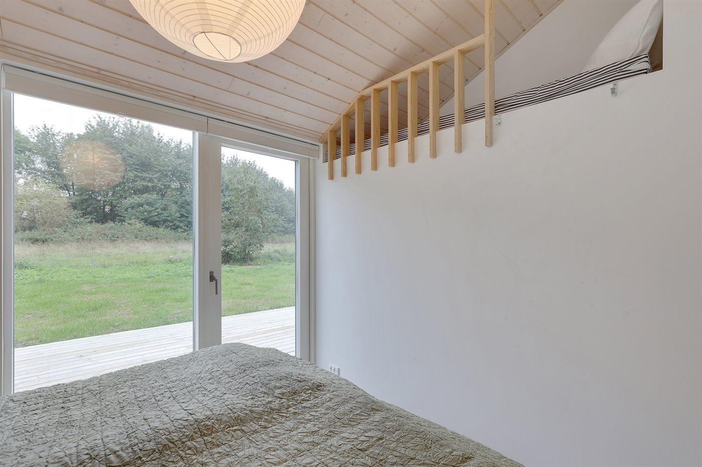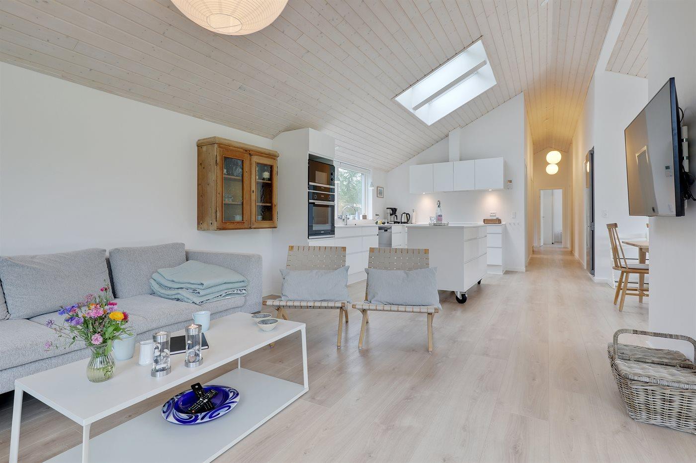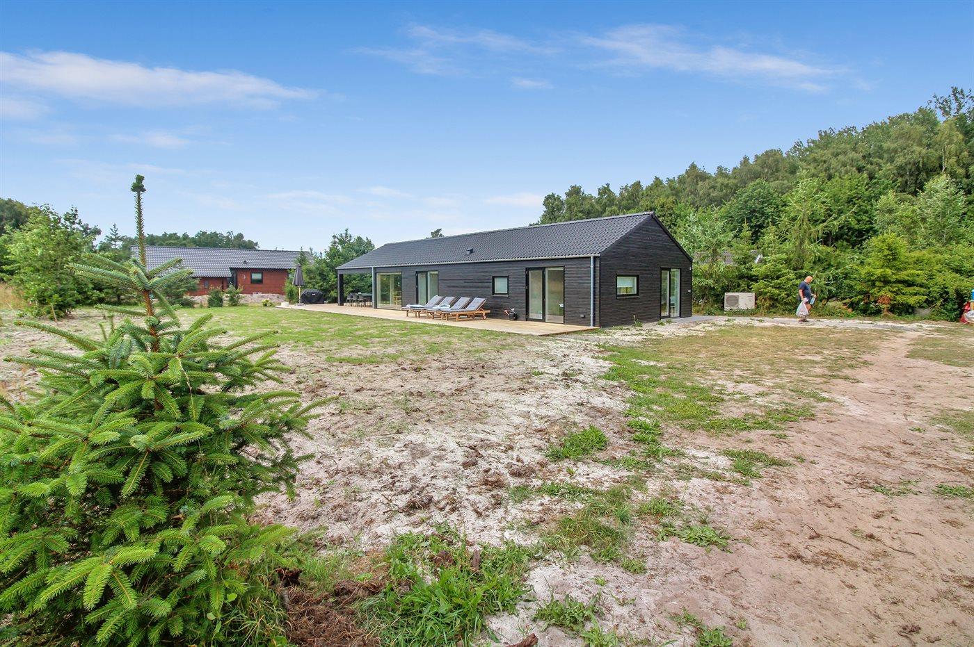 Helt nyt sommerhus fra 2021, omgivet af træterrasser, velbeliggende på lukket sidevej i et roligt feriehusområde nær sandstrand, røgeri og Michelin-restaurant. Huset er indrettet lyst og indbydende med alkove i opholdsstuen.