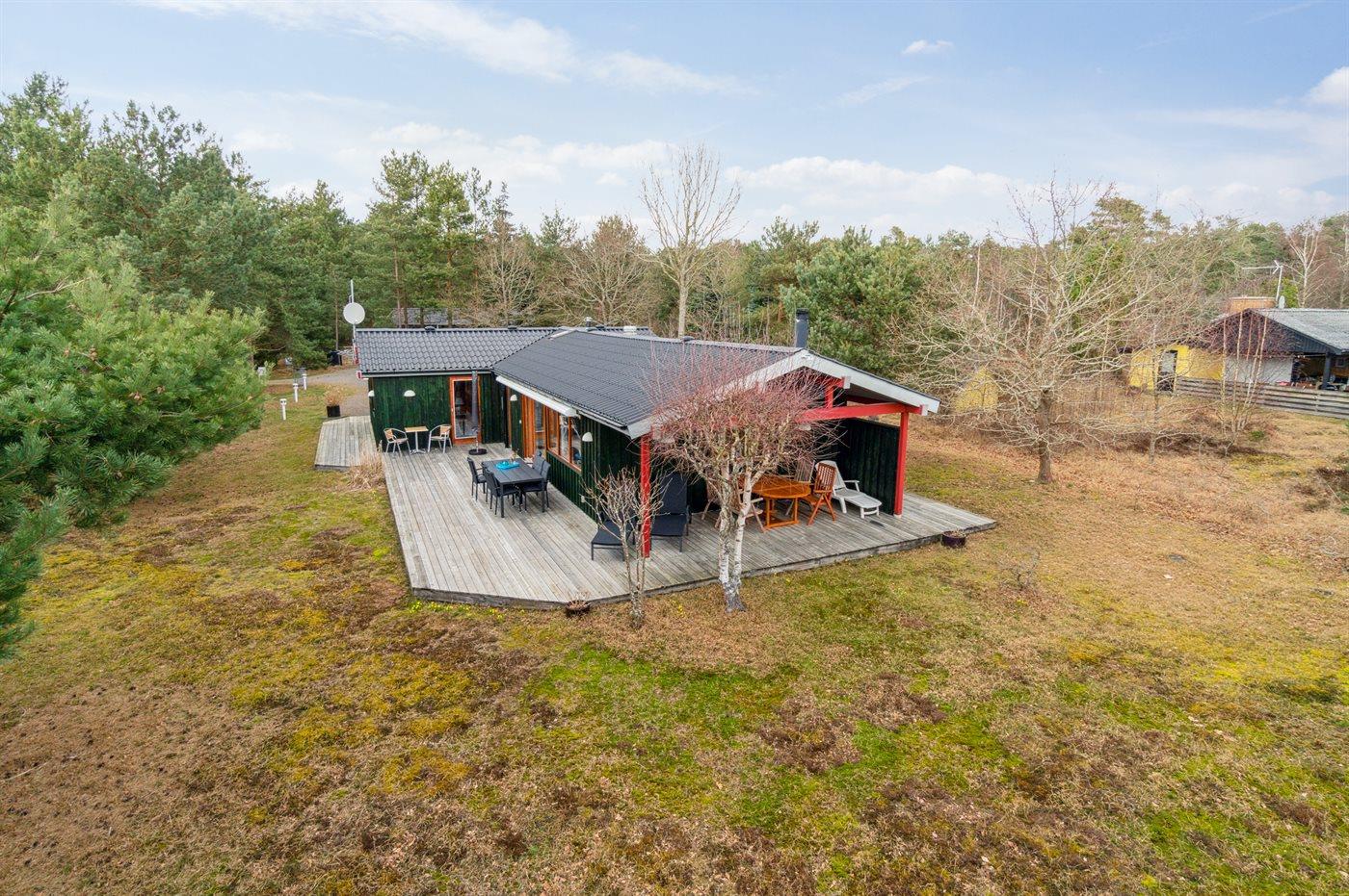 Et særdeles velholdt sommerhus beliggende på en grund med let bevoksning. Huset er omgivet af store træterrasser, hvor I kan nyde udelivet med en god bog eller et måltid i det fri. Ejer sørger løbende for vedligehold af den skærmende bevoksning af træer, således at der opnås de bedste læ- og solforhold på den store træterrasse.