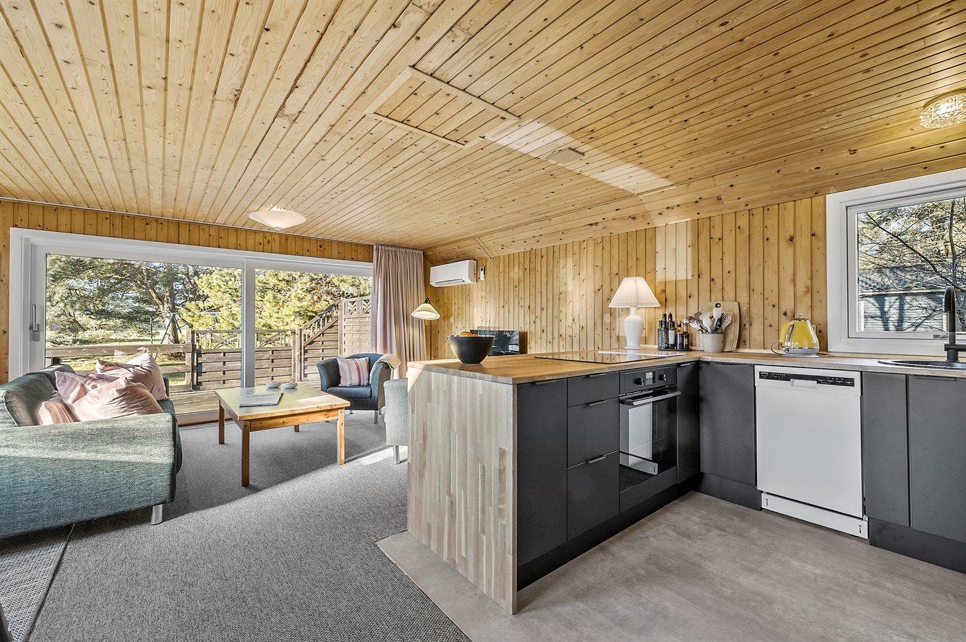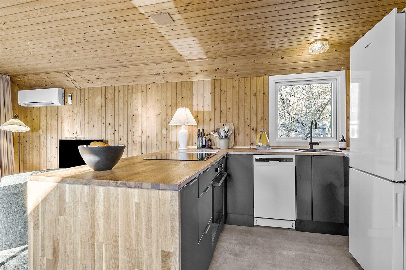 Køkkenet er udstyret med 1 køleskab. Der er 4 keramiske kogeplader, varmluftovn samt opvaskemaskine.