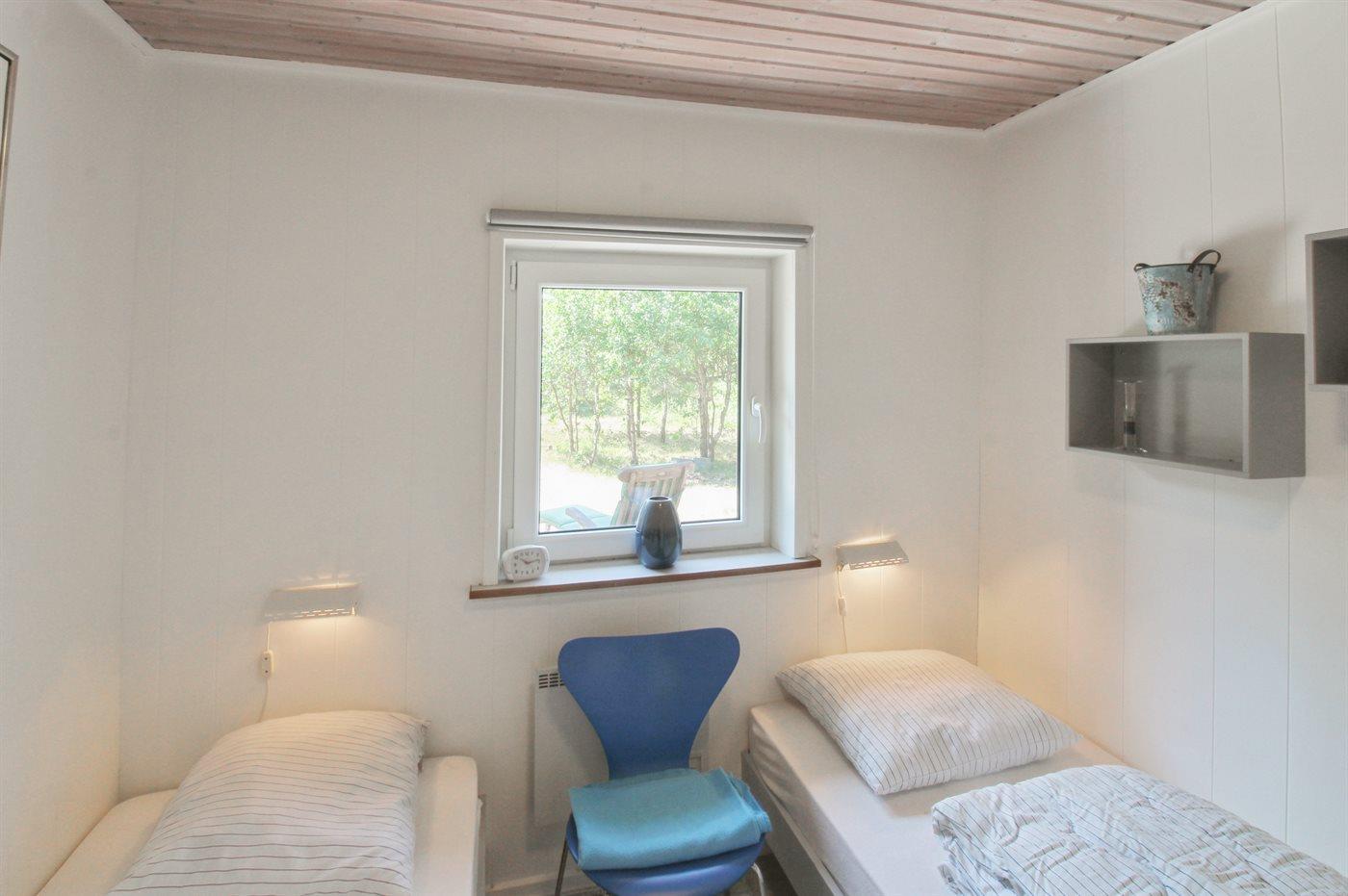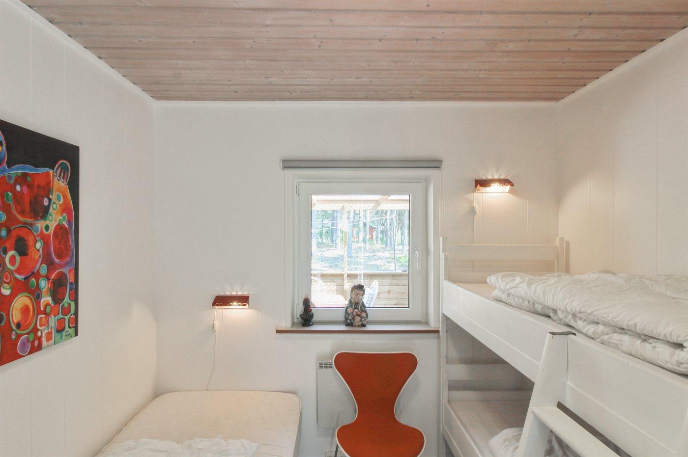 Der er i alt 4 soveværelser. Sovepladserne fordeler sig på: 2 sovepladser i dobbeltseng. 5 sovepladser i enkeltsenge. 2 sovepladser i køjeseng. Derudover er der 1 stk. barneseng.