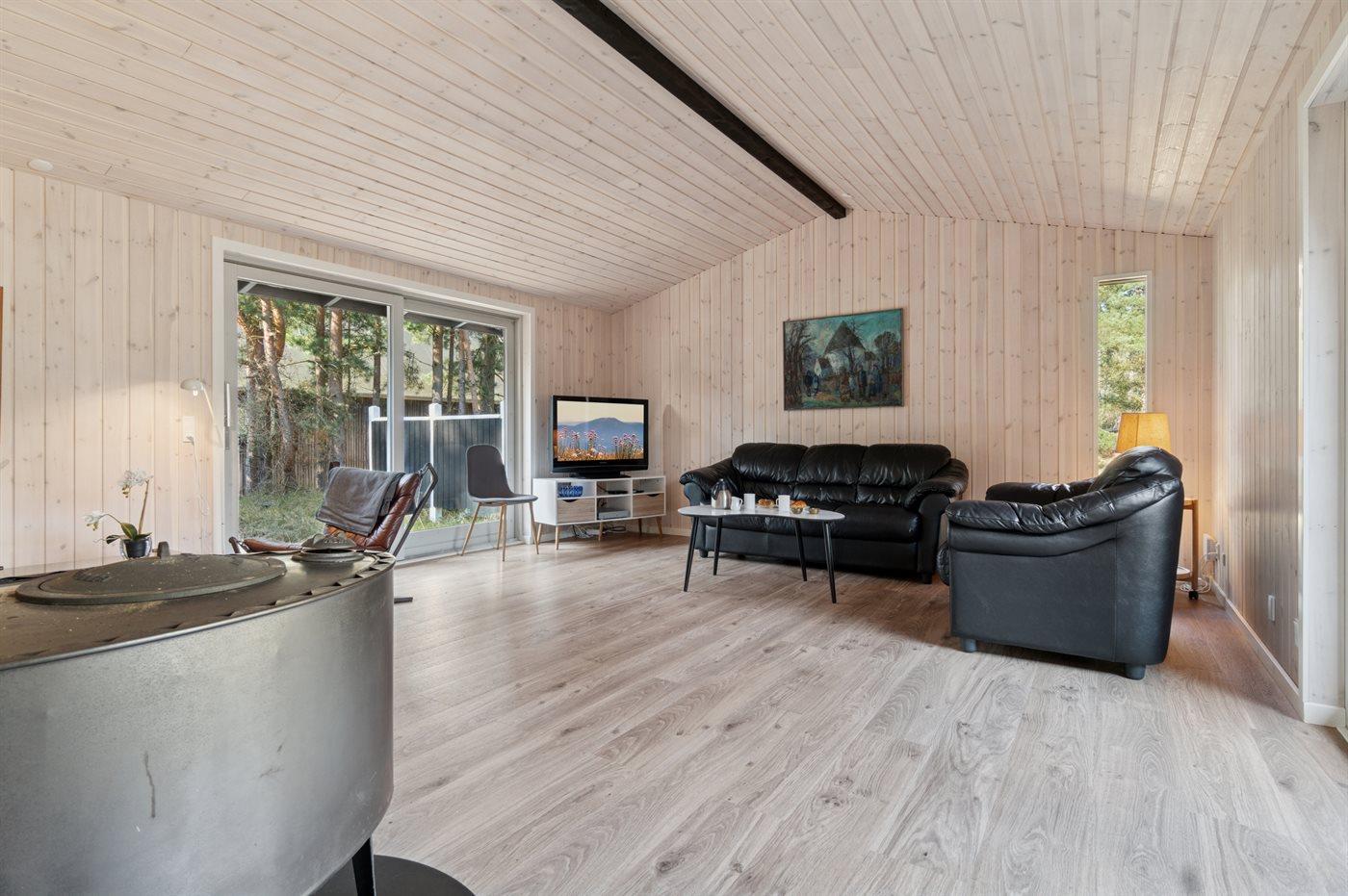 Hyggeligt sommerhus i Vestre Sømarken nær sandstrand og skov med flere terrasser og brændeovn.