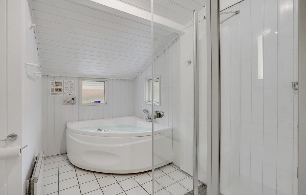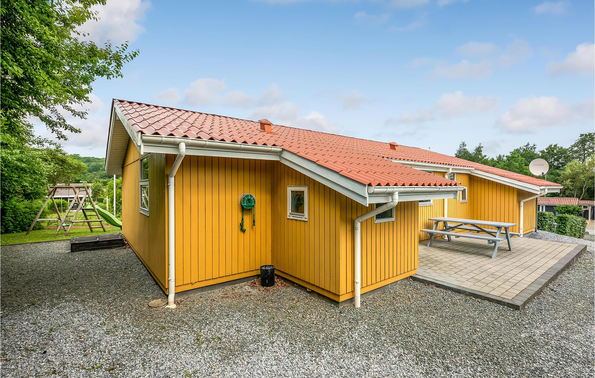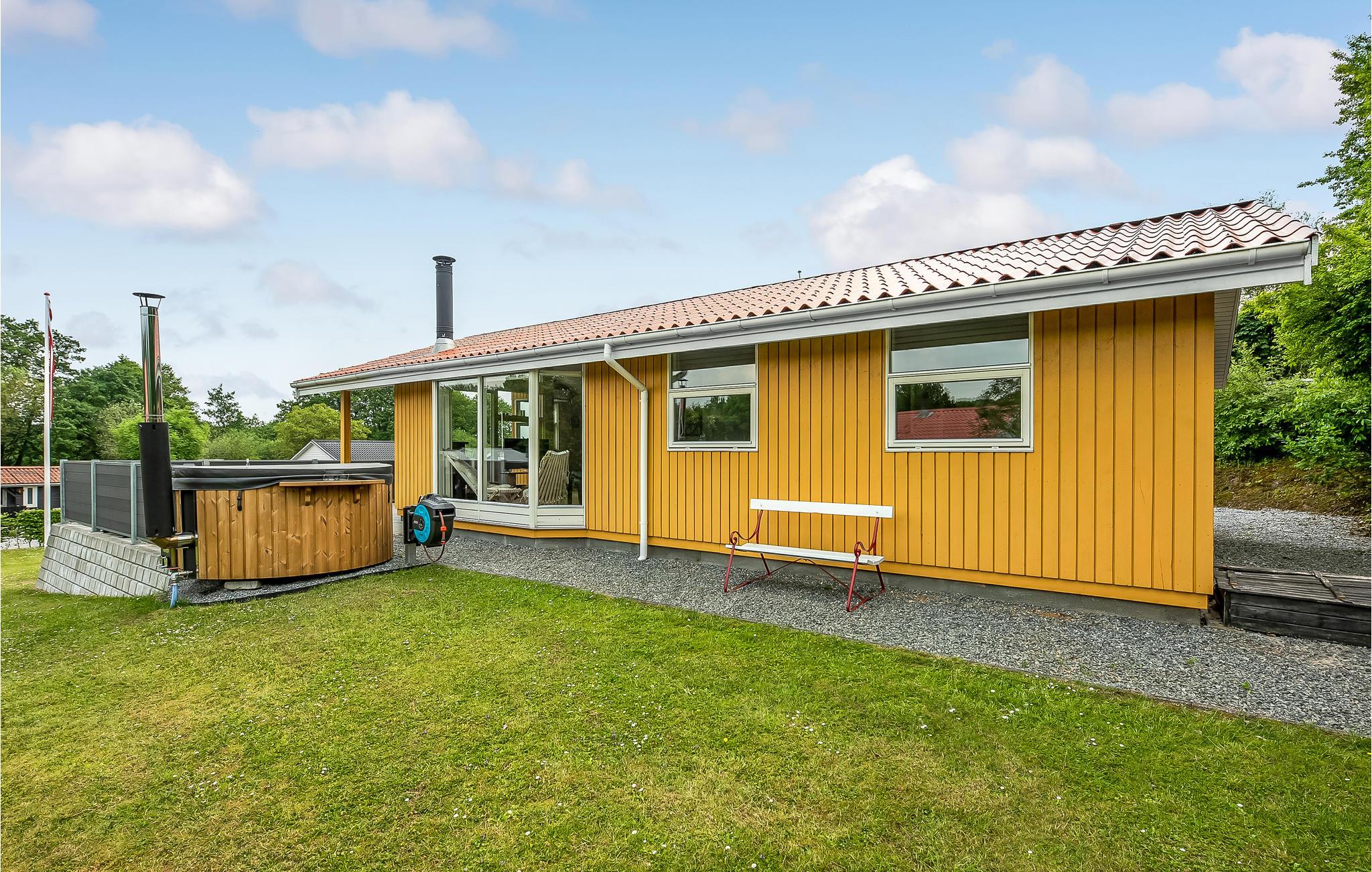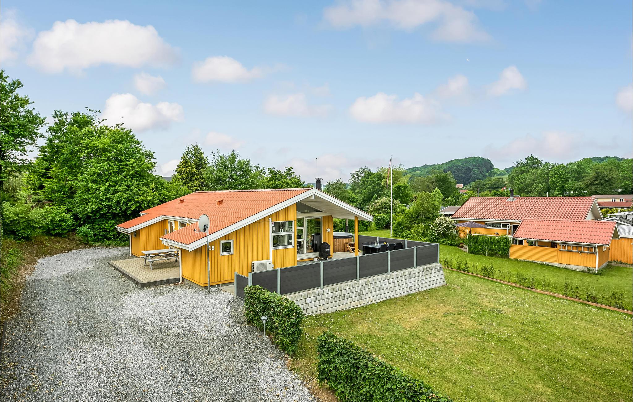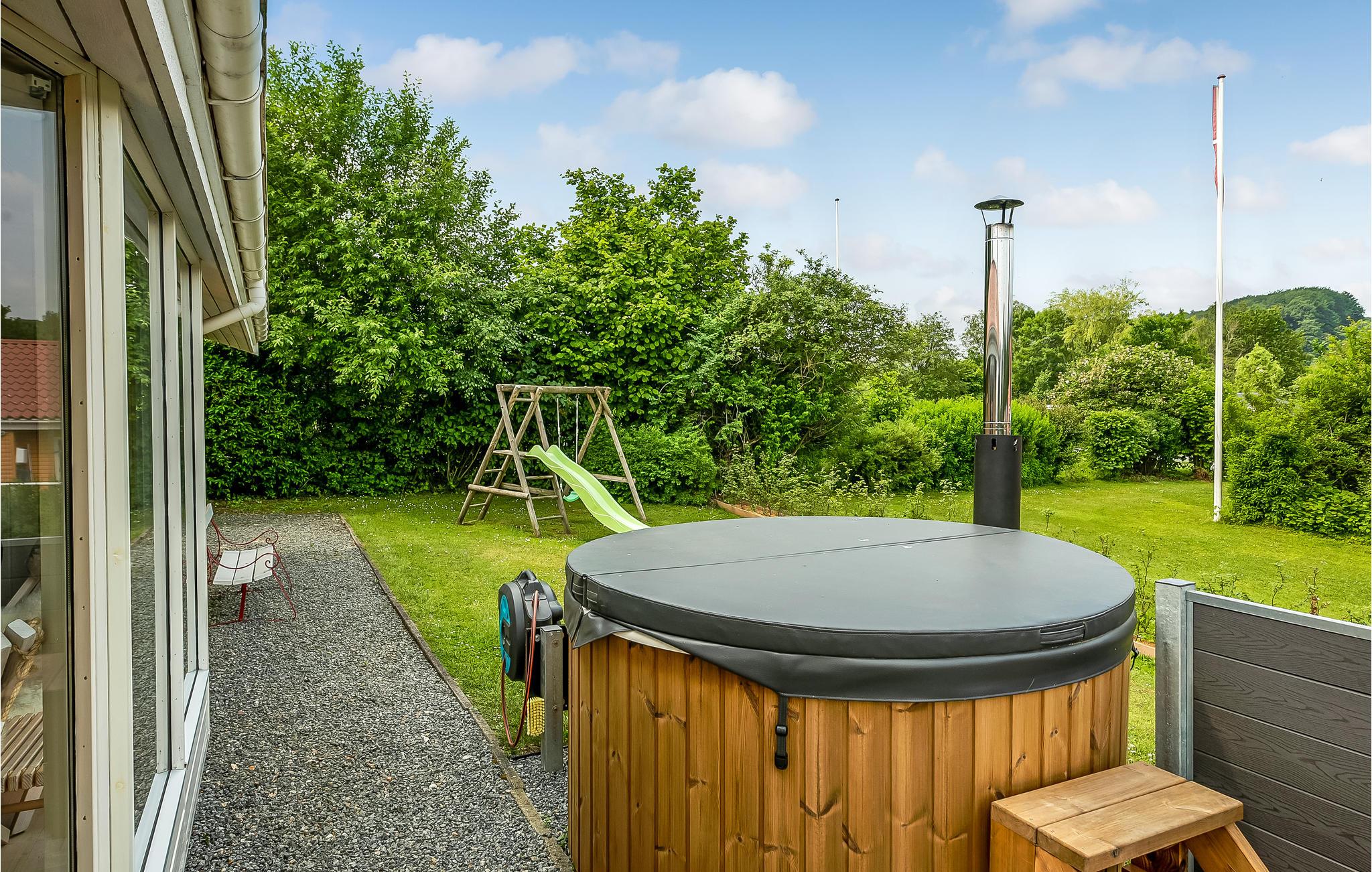 Sommerhuset er indrettet med opholdsstue, spisestue og køkken i åben forbindelse, fra spisestuen er der adgang direkte ud på den delvis overdækkede terrasse, hvor I kan sidde og nyde udsigten og frokosten i det gode vejr. I huset findes tre soveværelser hvoraf de to har dobbeltsenge, og i det tredje er der to sovepladser i køjesenge til de unge. I det store badeværelse er der ydermere et dejligt spabad, hvor kroppen kan få lidt massage af de bløde bobler. Sommerhusets anden terrasse ligger på modsat side, så I kan altid finde en solplet eller lidt skygge. På grunden kan børnene hygge sig på gyngen eller i sandkassen, mens de voksner slapper af i vildmarksbadet for 6 personer.