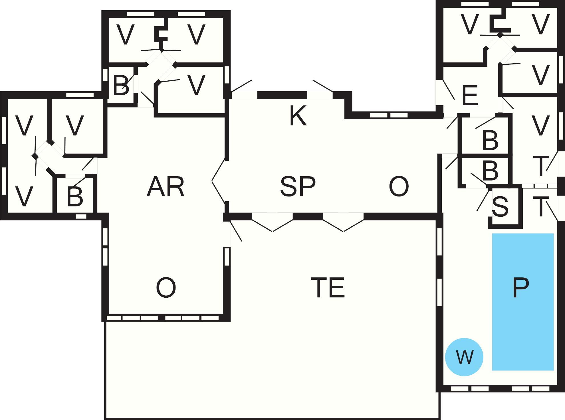 Huset er yderst rummeligt og velproportioneret, bygget op omkring to separate soveområder. Hvert område har et badeværelse, og der er et ekstra badeværelse forbundet til poolområdet. I alt er der tre badeværelser, som alle har gulvvarme. Huset opvarmes med elvarme og en energibesparende varmepumpe.