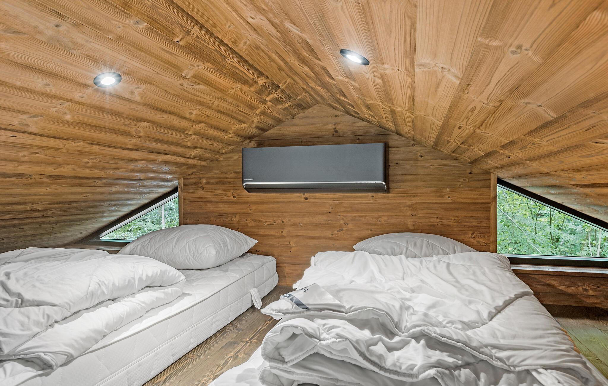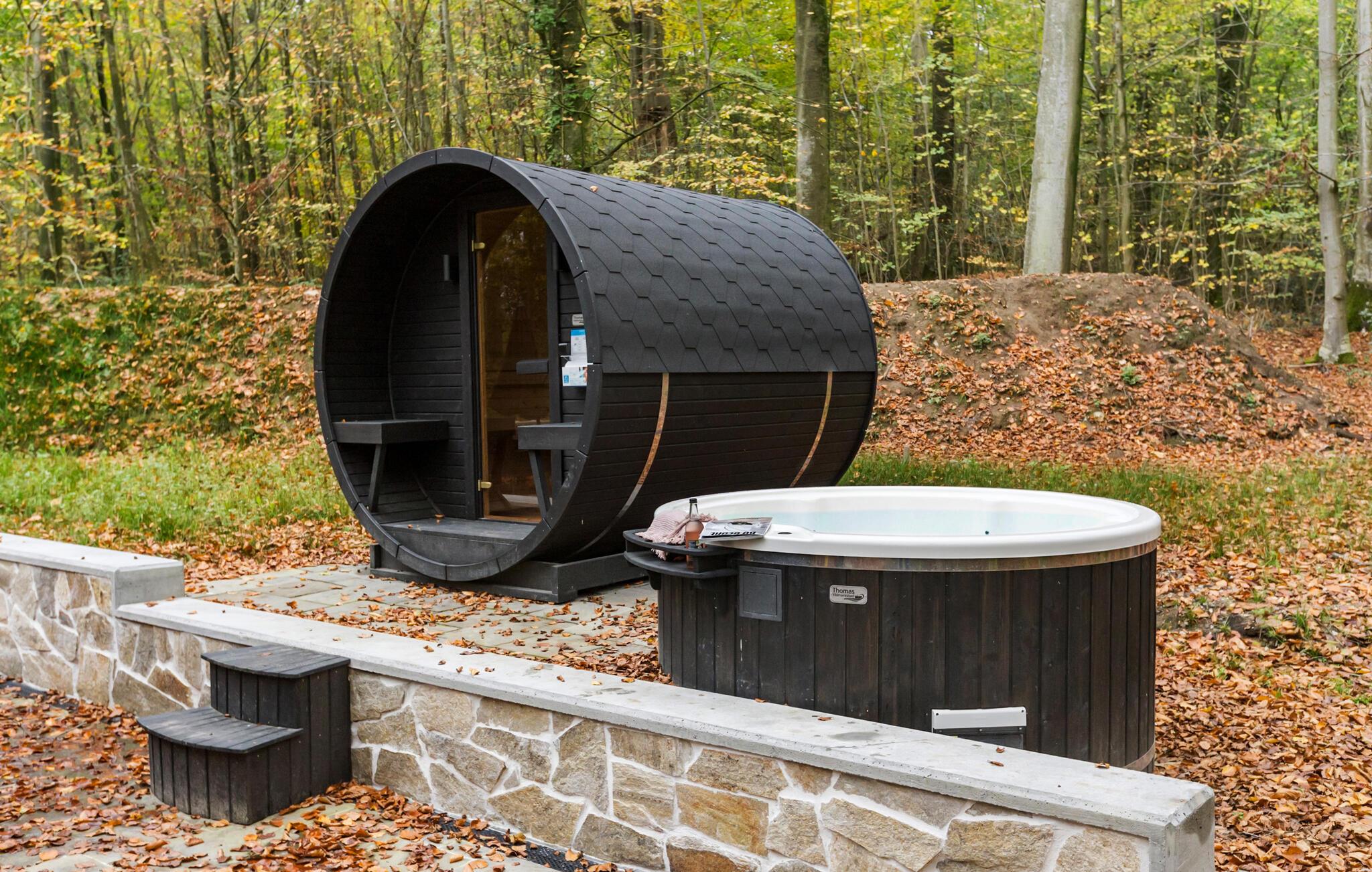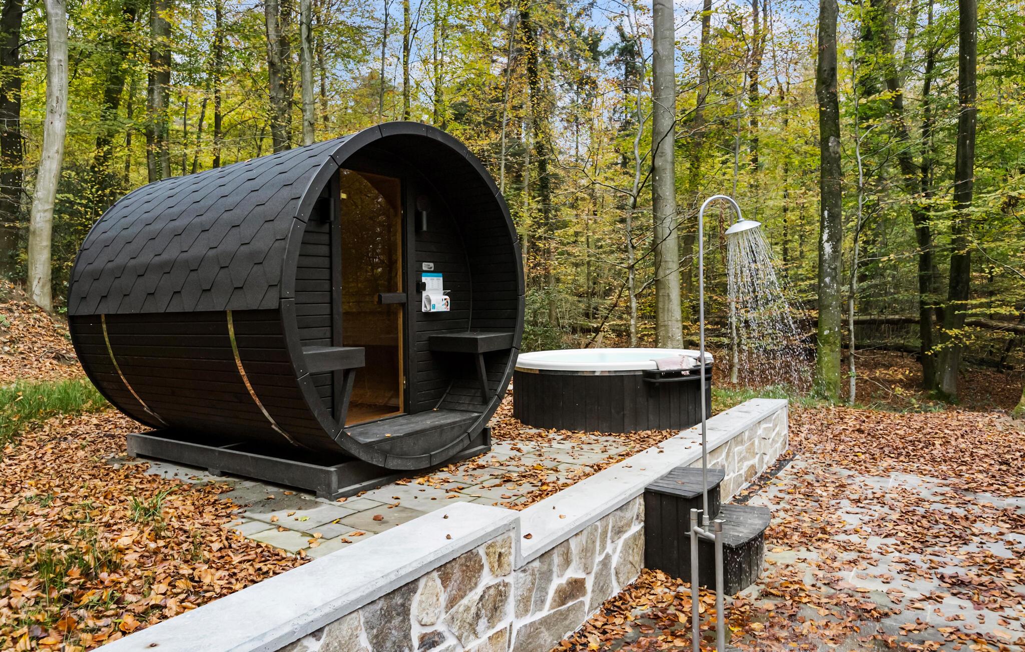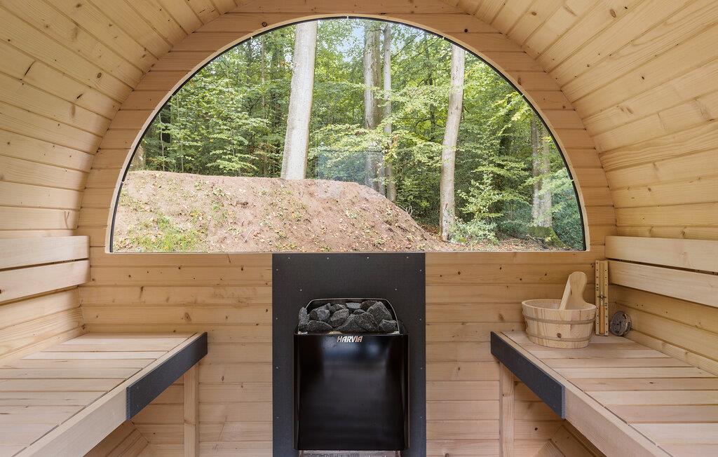 Til afslappende wellness-øjeblikke står der en ekstern sauna til rådighed. Brug saunaen og læg hverdagens bekymringer bag jer. Frisk jer op under udendørsbruseren eller nyd det varme finske træbad i det fri, omgivet af fredelig natur.