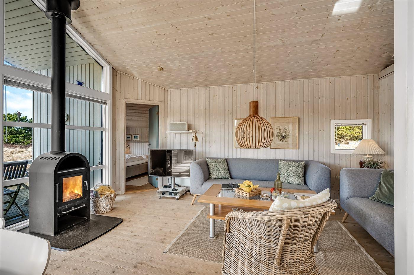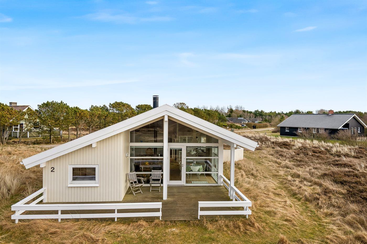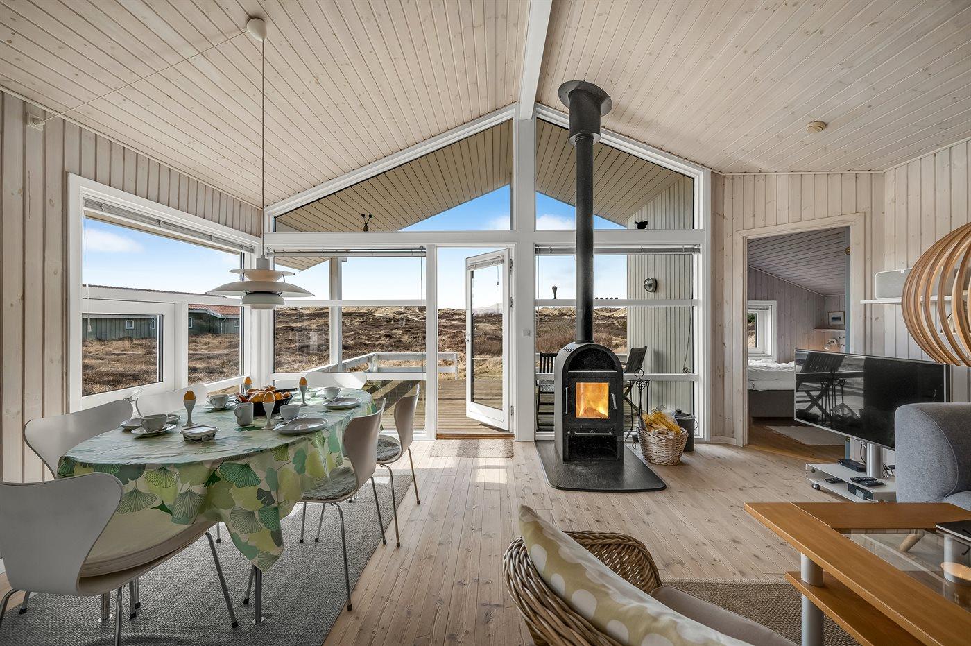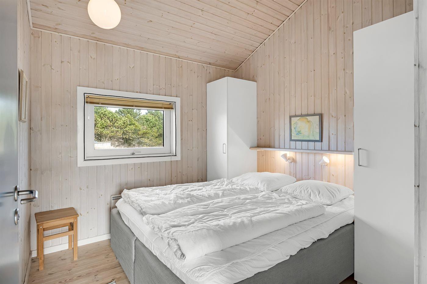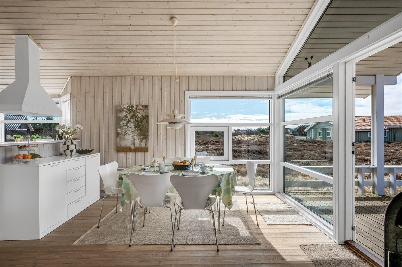 Virkelig skønt lyst feriehus med smagfuld og hyggelig indretning. Huset er meget smukt beliggende i kanten af store fredede natur- og klitarealer og indbyder til hygge og afslapning for hele familien. Der er 3 soverum, som fordeler sig på 2 værelser med dobbeltseng og 1 værelse med enkelt senge. Huset har derudover hems med 2 madrasser. Badeværelse med spa og sauna. Køkken med opvaskemaskine og mikroovn. Både åben og overdækket terrasse.