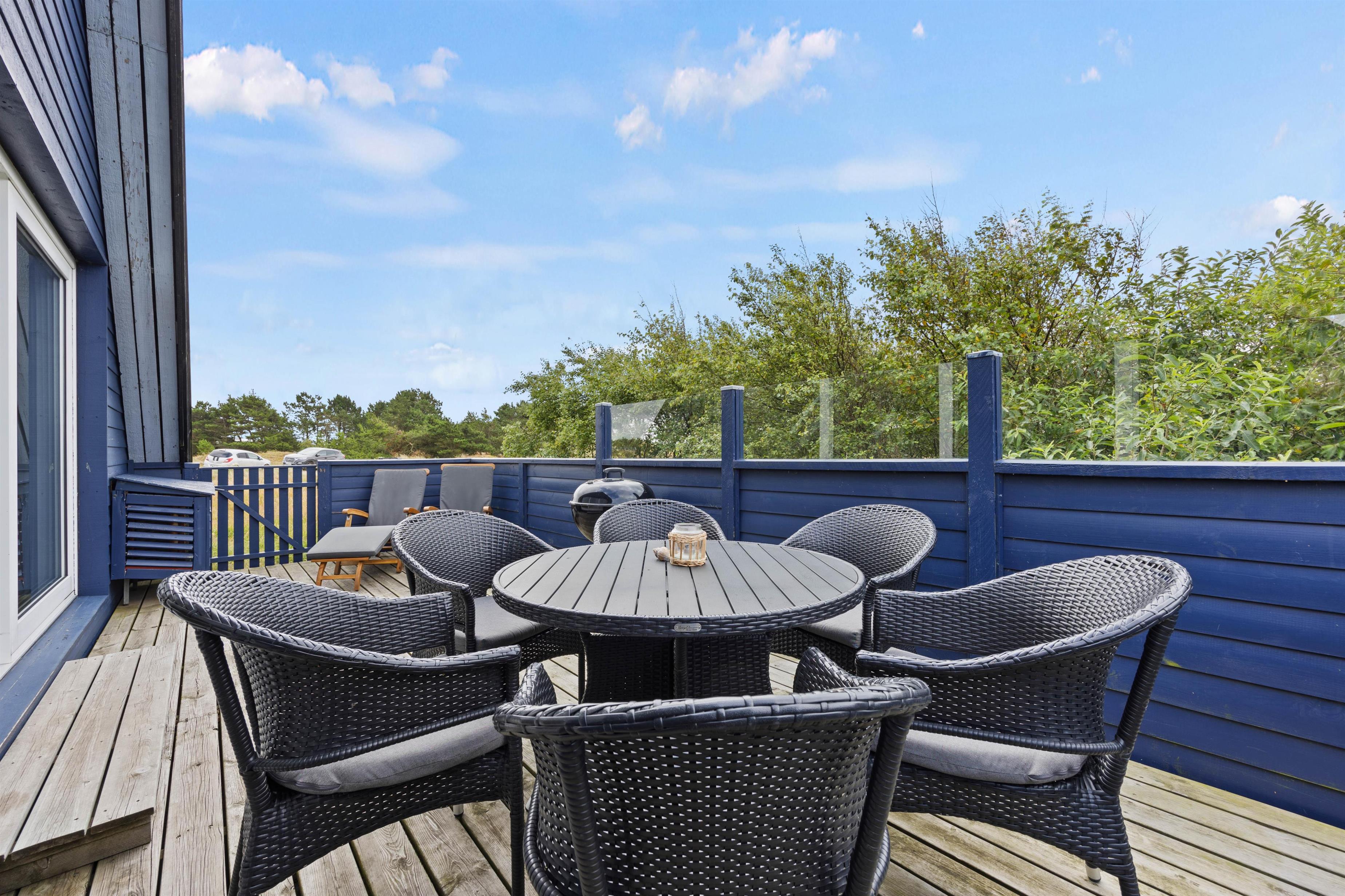 Udendørs har I en skøn terrasse, som I kan søge mod på de dage, hvor vejret er helt i top. Her kan I sætte jer godt til rette i havemøbler og liggestole, mens I nyder ferien og solen. Terrassen er lukket, og derfor vil I sagtens kunne have jeres hund med herud, uden at den tager ud på opdagelse på egen hånd.