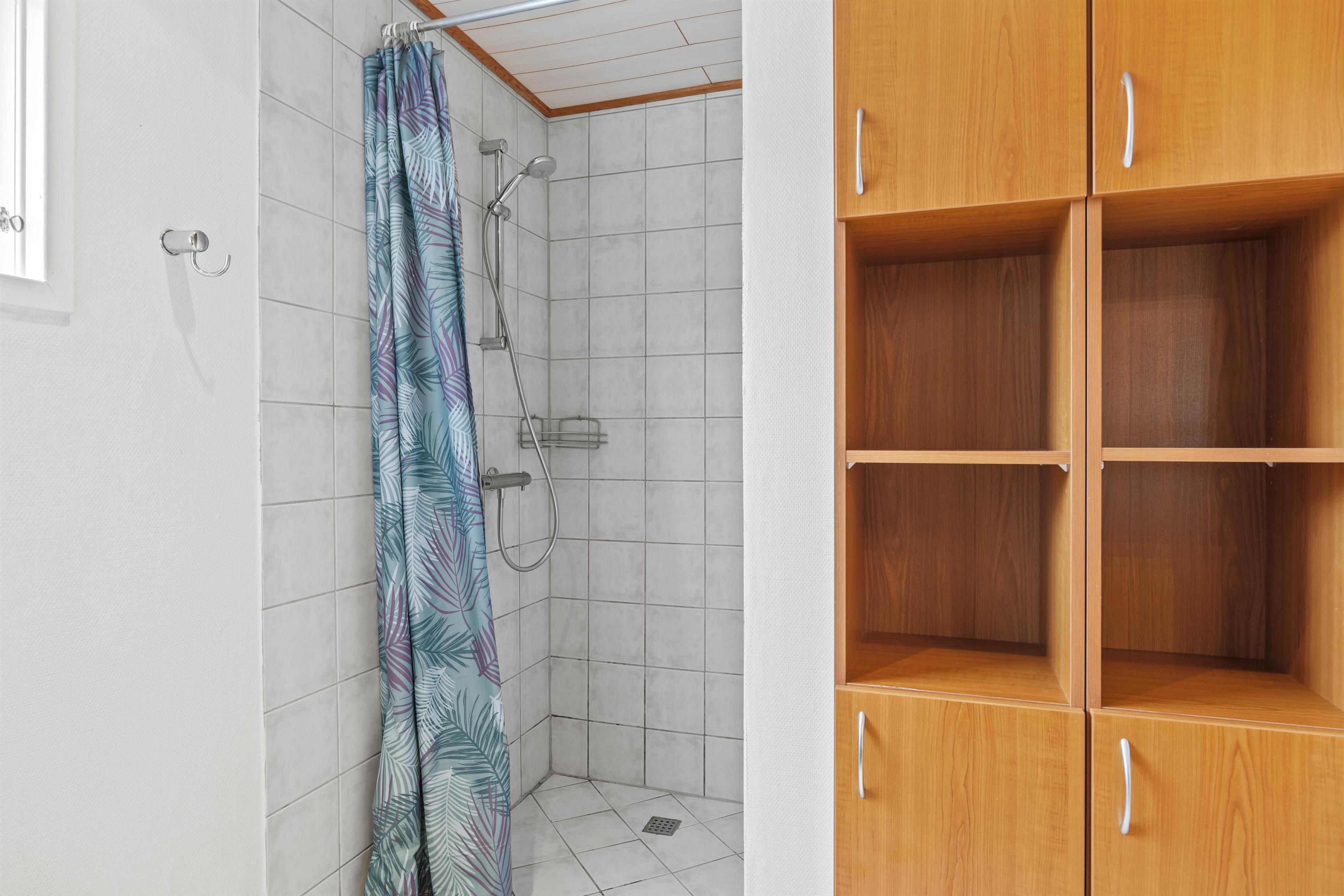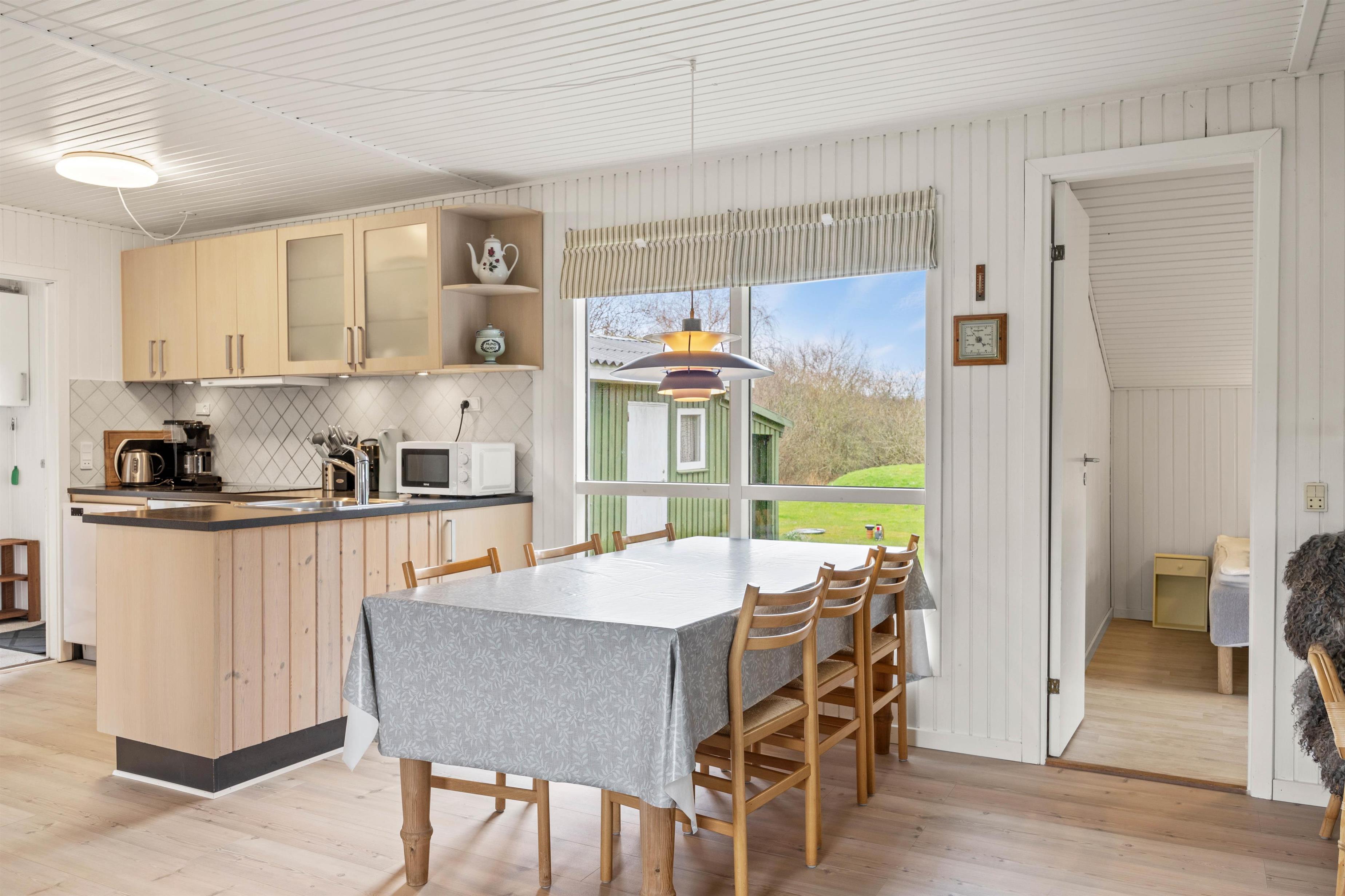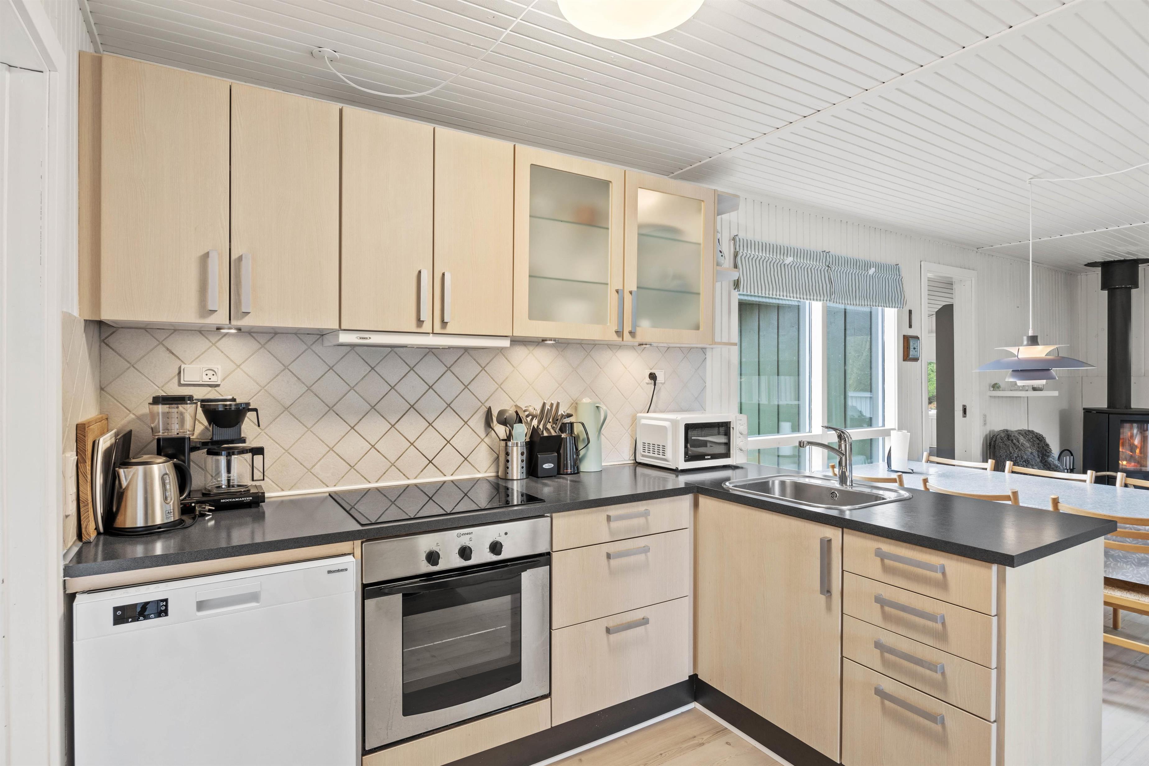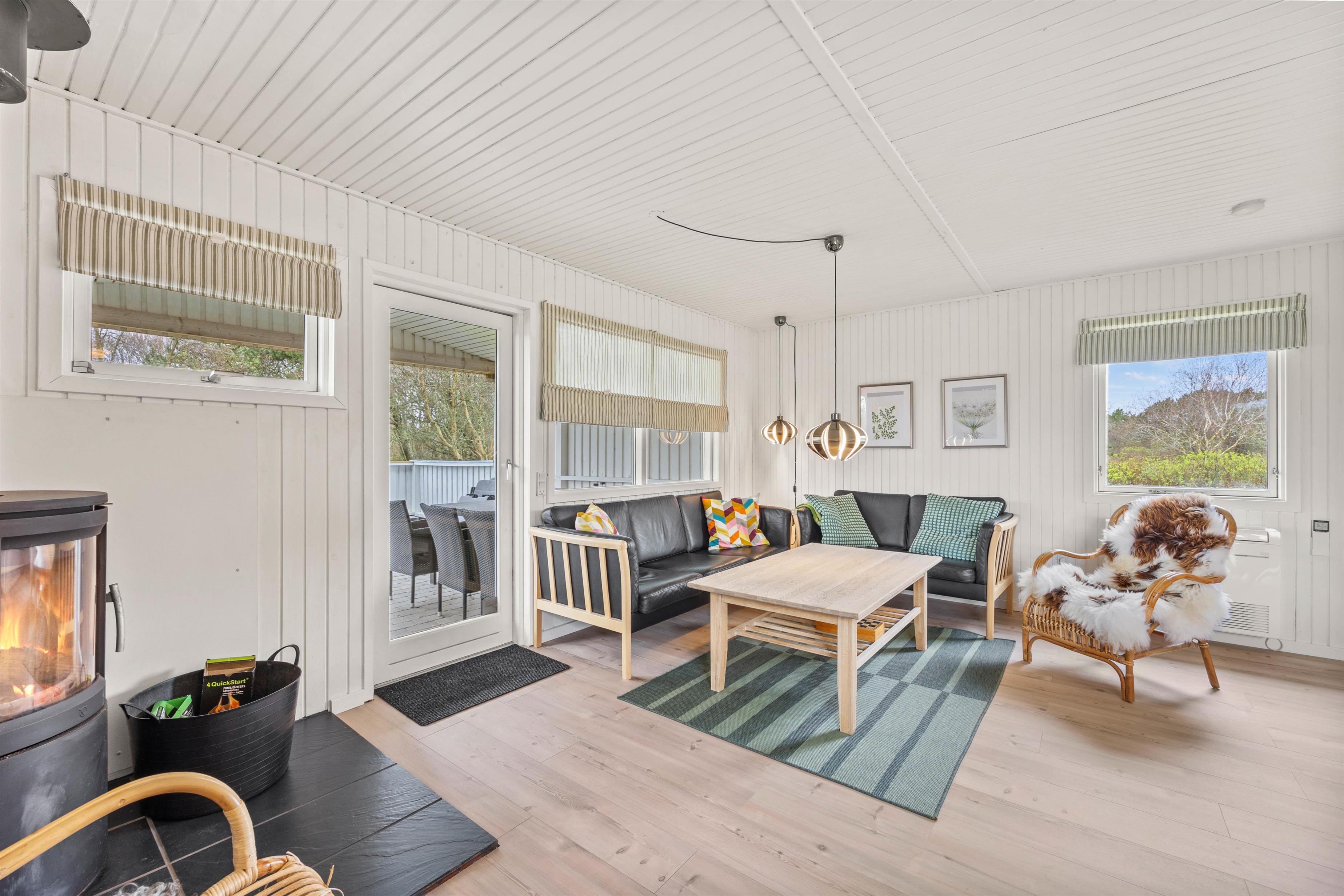 Hjertet af sommerhuset er det store alrum, hvor det funktionelle køkken med opvaskemaskine og mikrobølgeovn ligger i åben forbindelse til spiseplads samt opholdsstuen. Stuen er indrettet med komfortable møbler, hvor I kan tænde op i brændeovnen og sætte jer til rette og mærke roen indfinde sig, mens flammernes skyggedans fylder rummet.
