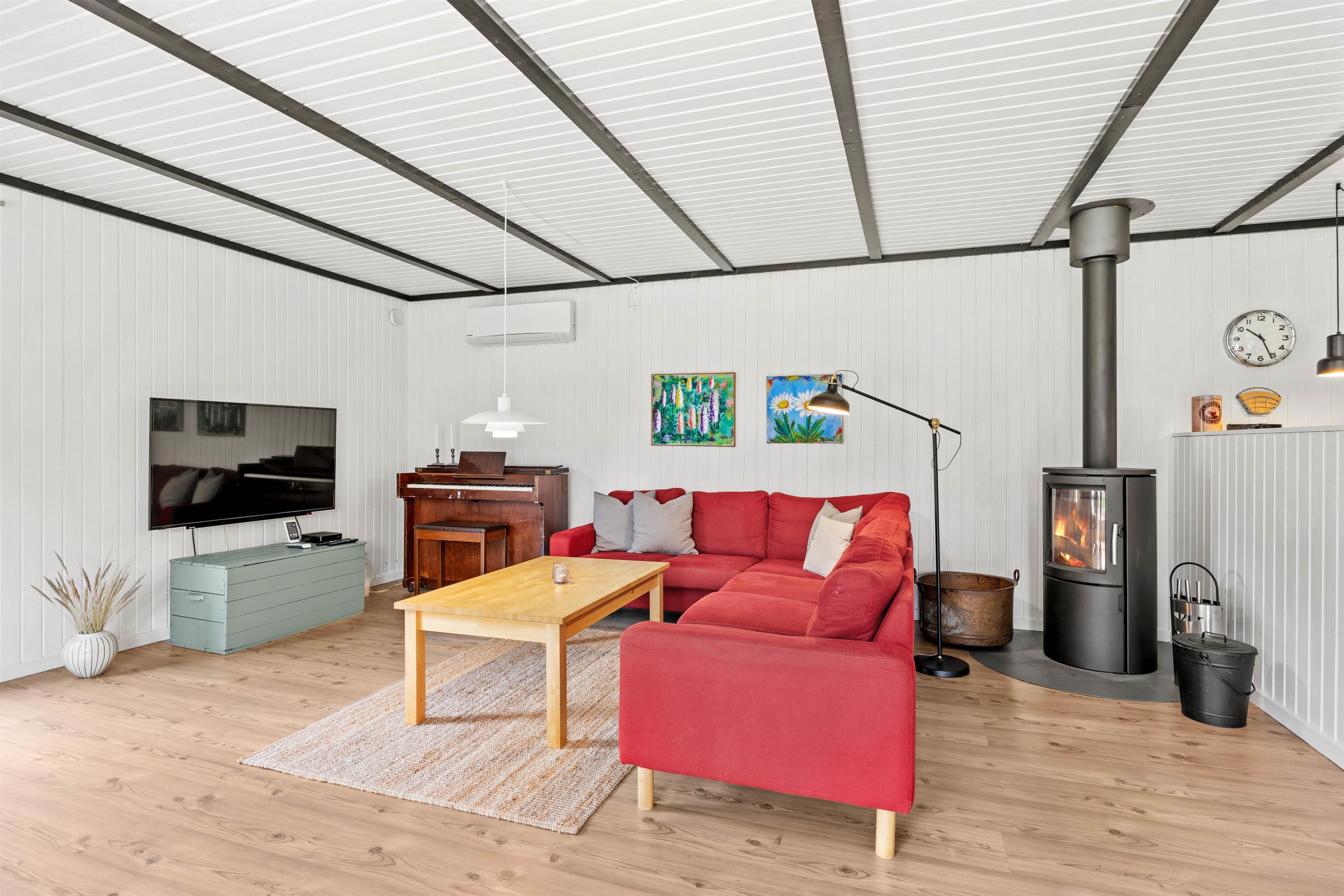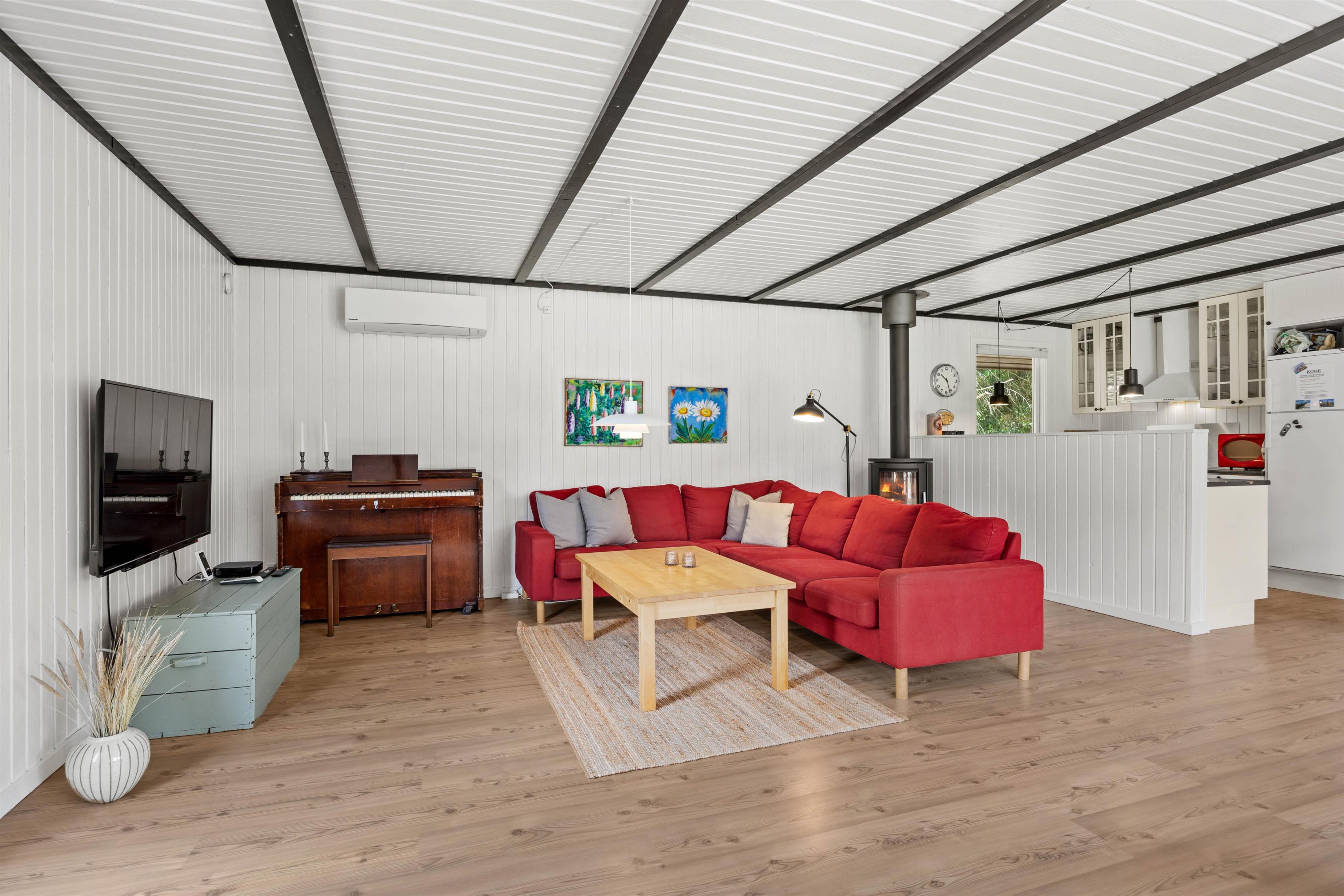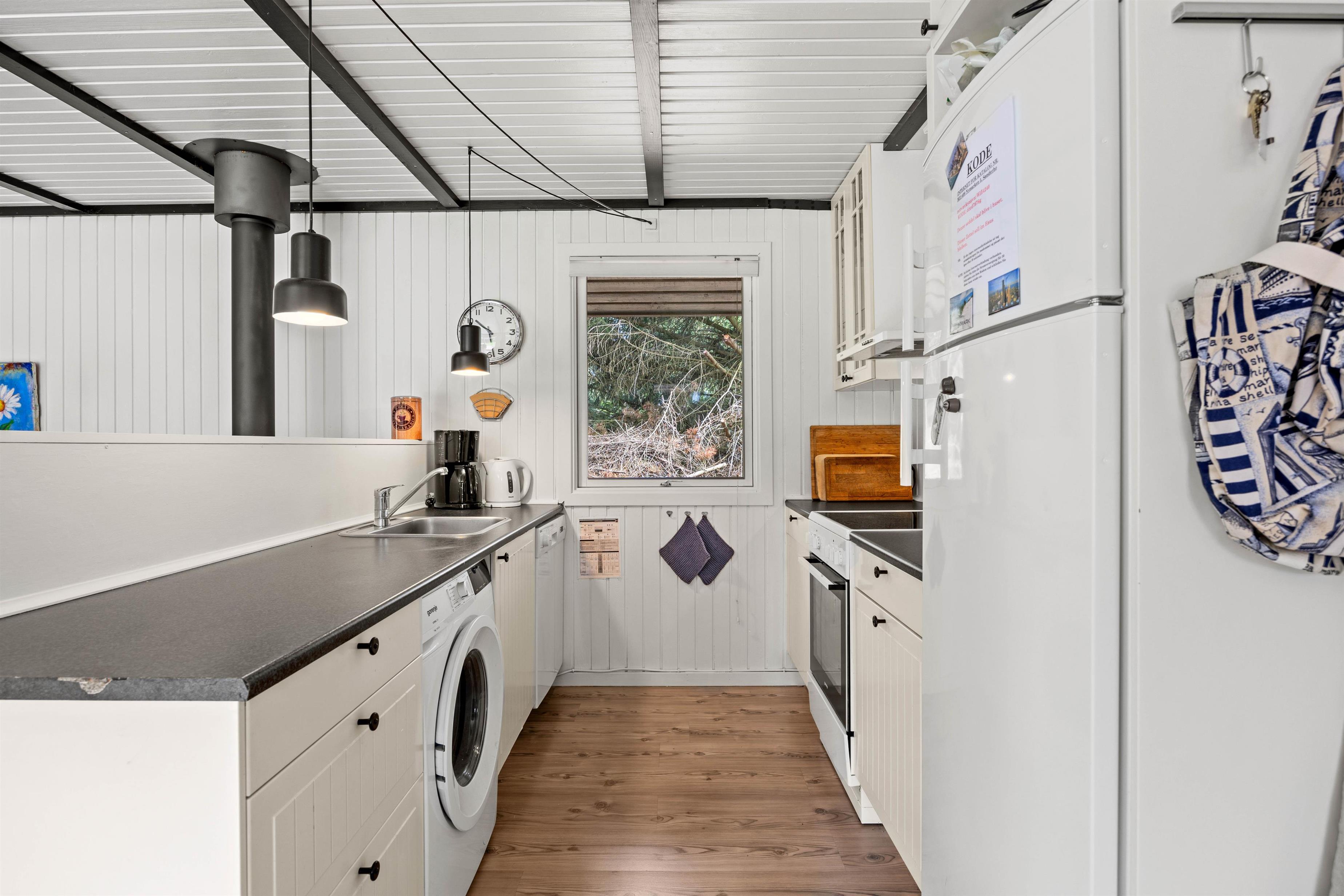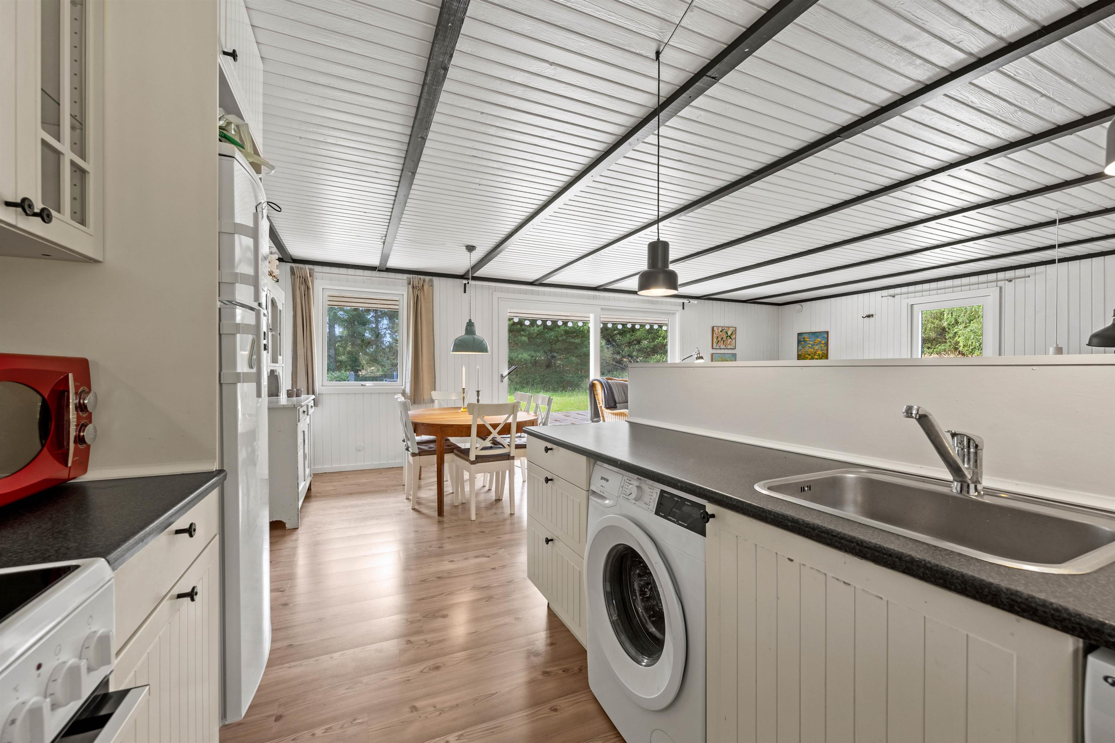 Sommerhuset på Nymarken 5 er renoveret i 2024, og feriestemningen mærker I straks i den lyse og moderne indretning. I opholdsområdet sørger brændeovnen for behagelig varme på kølige aftener. I kan slappe af i sofaen, trække jer tilbage med en god bog eller arrangere en filmaften. Køkkenet indeholder alt, hvad I behøver for at forkæle hinanden med lækre hjemmelavede måltider, blandt andet mikroovn og opvaskemaskine. Den omkostnings- og energibesparende varmepumpe sørger for behagelige temperaturer i sommerhuset.