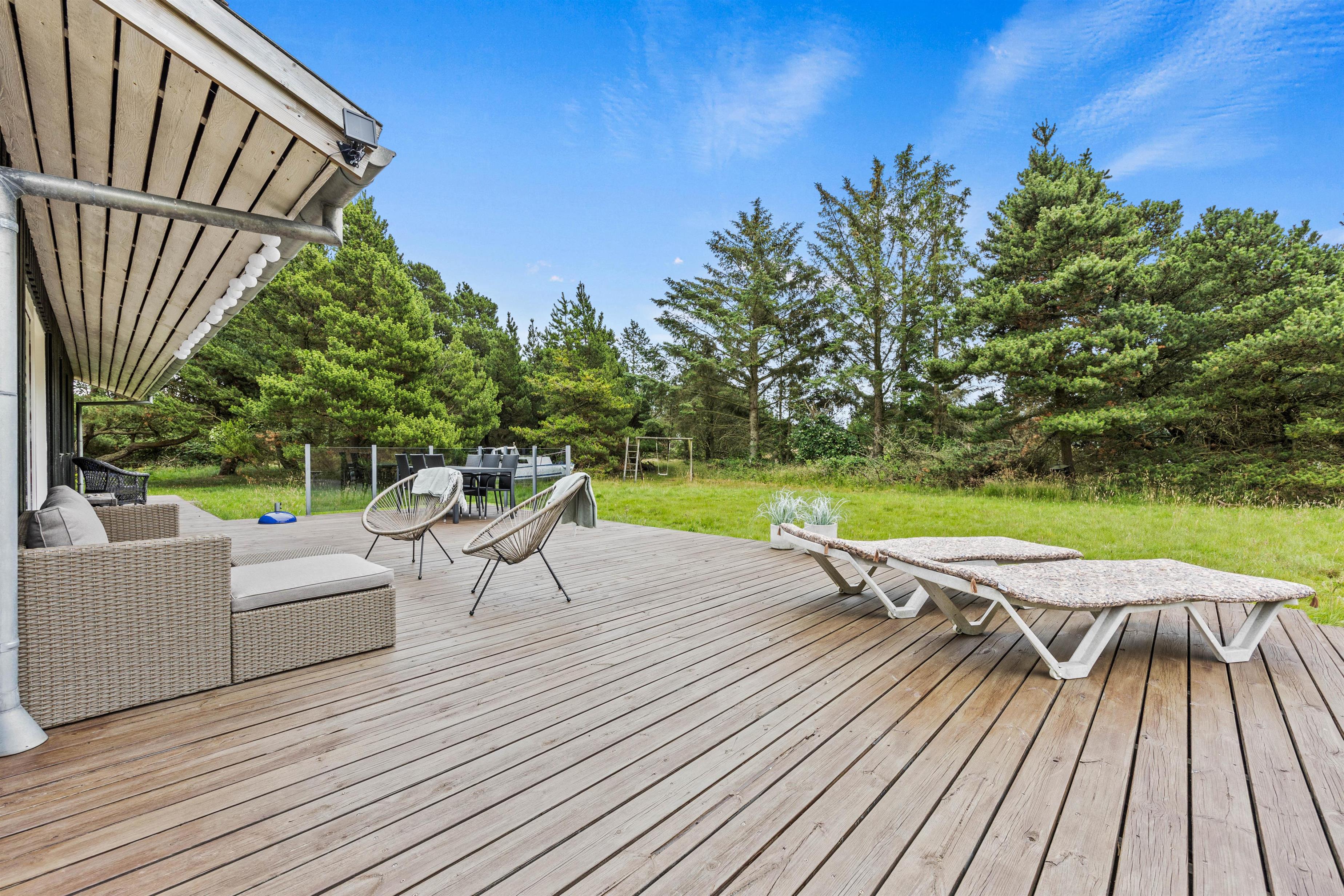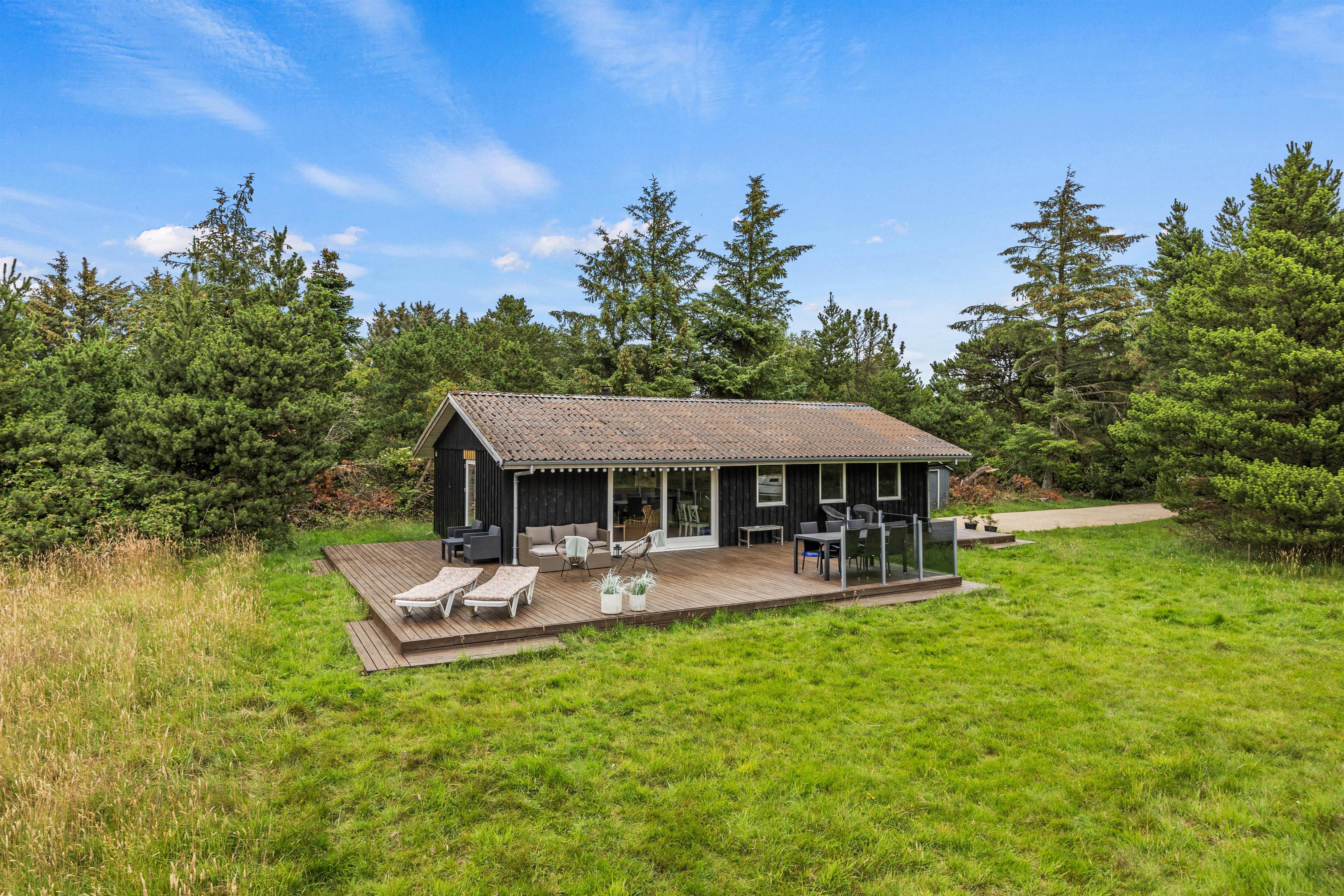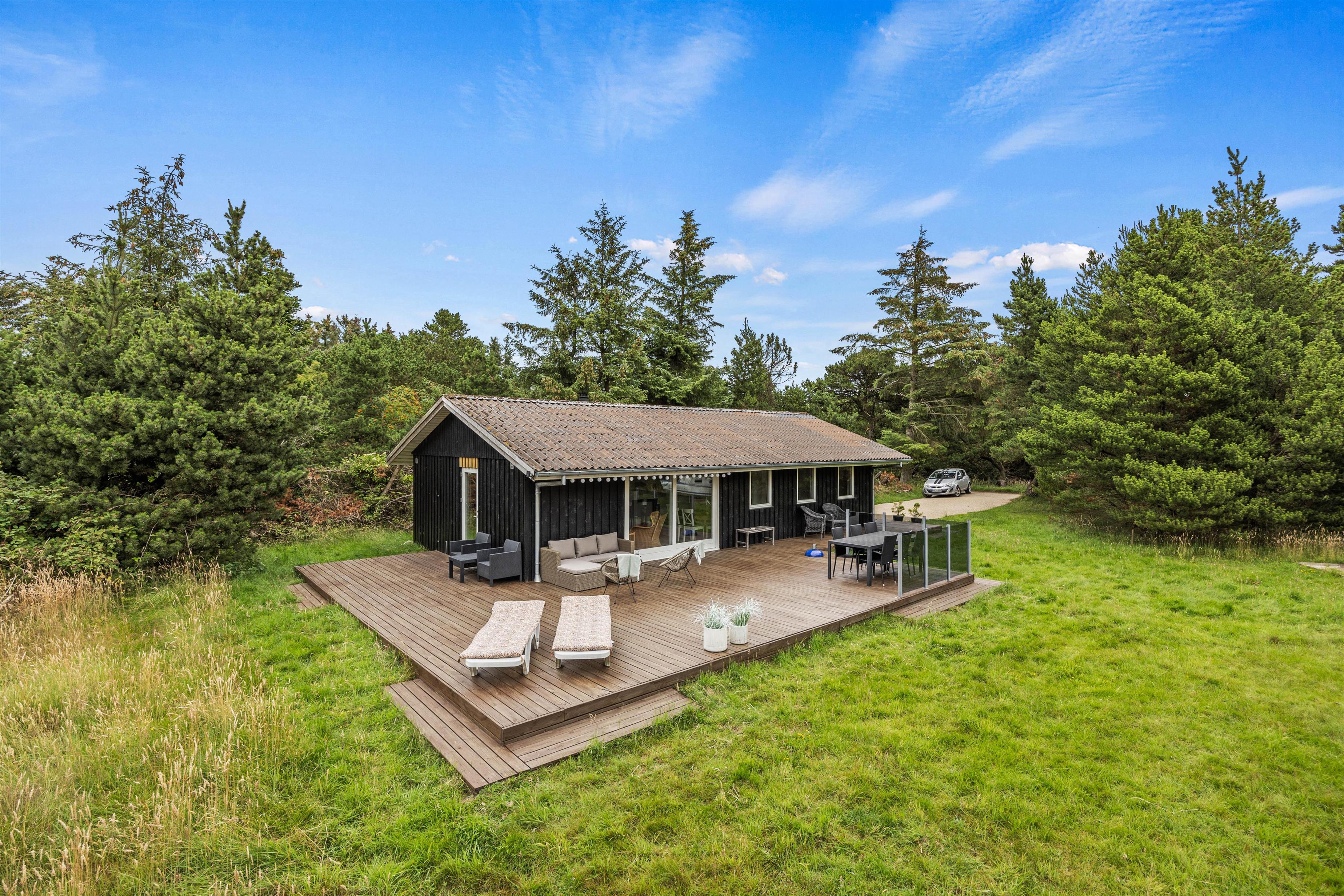 Den godt 2500 kvm store naturgrund med plæne omgiver sommerhuset og giver jer masser af muligheder for ophold i det fri. På den åbne terrasse kan I solbade i de komfortable liggestole eller trække jer tilbage i havemøblerne. Tænd op i grillen til aften og nyd et lækkert grillmåltid sammen, imens skyggerne bliver lange.