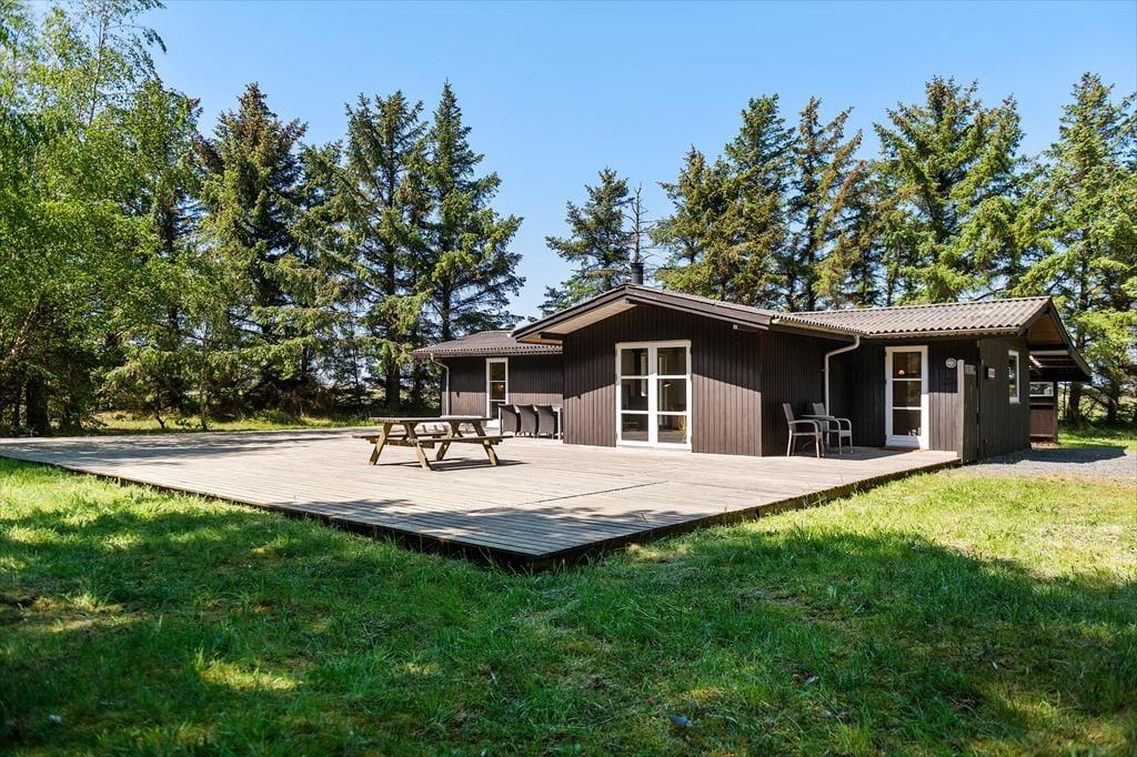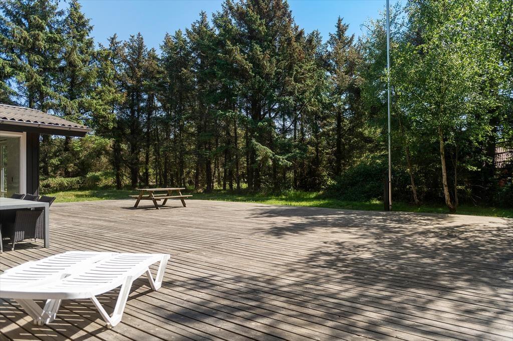 Rundt om den store naturgrund knejser høje nåletræer, så de er både med til at give læ og skærme udearealerne af. Har I ikke andet på programmet, kan du og din familie sagtens blive her det meste af dagen, når vejret er godt: På græsplænen kan børnene lege og måske endda overtale de voksne til at være med til at spille bold eller kaste med frisbee. Træterrassen er særdeles stor, så både store og små har masser af plads til solbadning, kortspil ved havebordet og velduftende måltider, der bliver tilberedt på grillen.