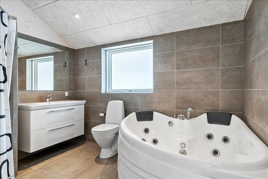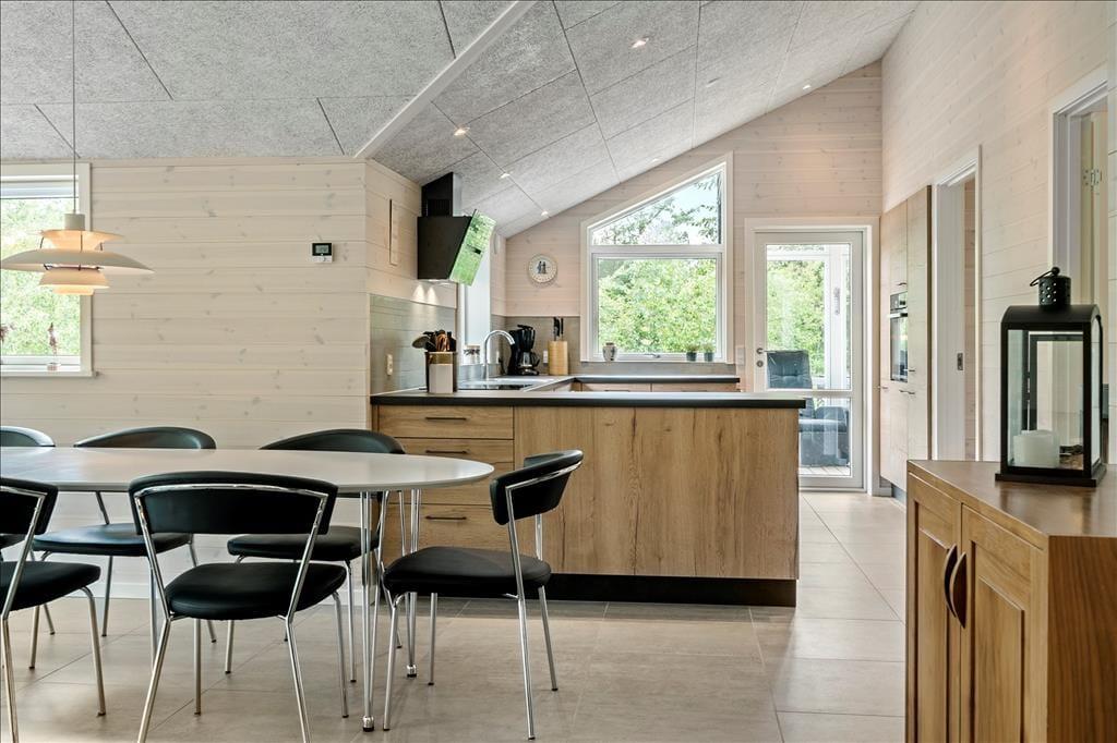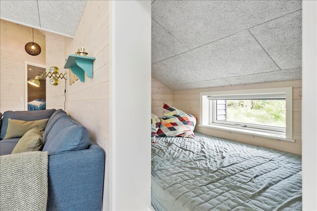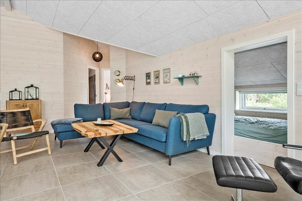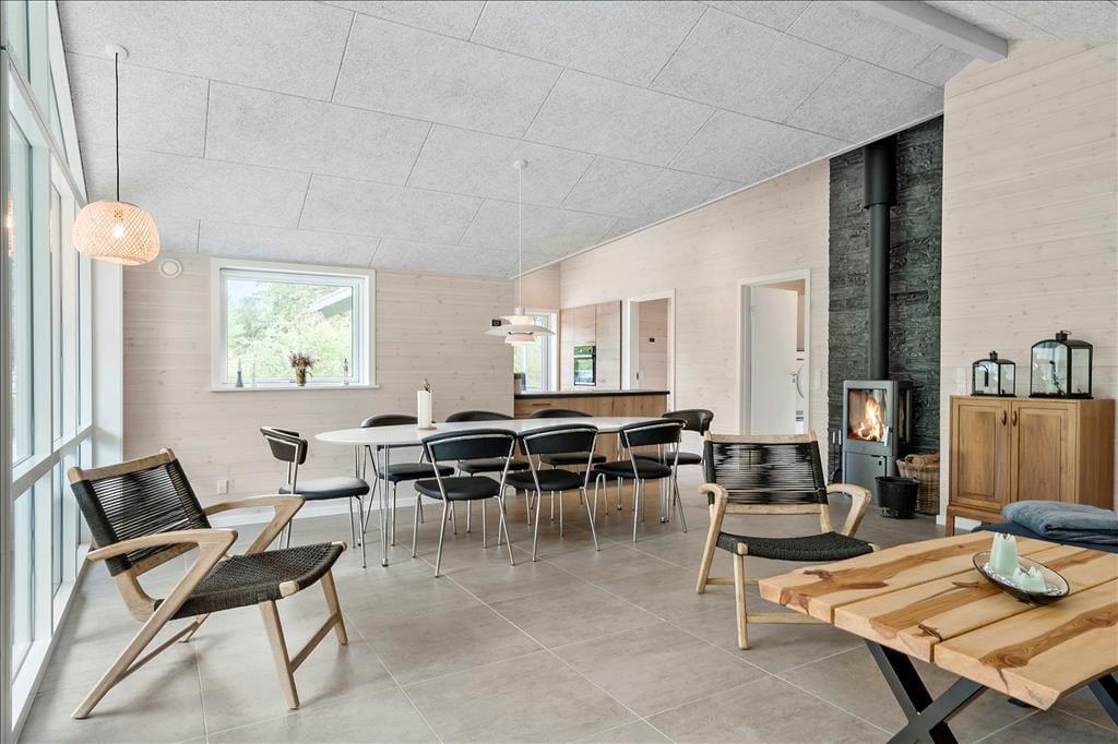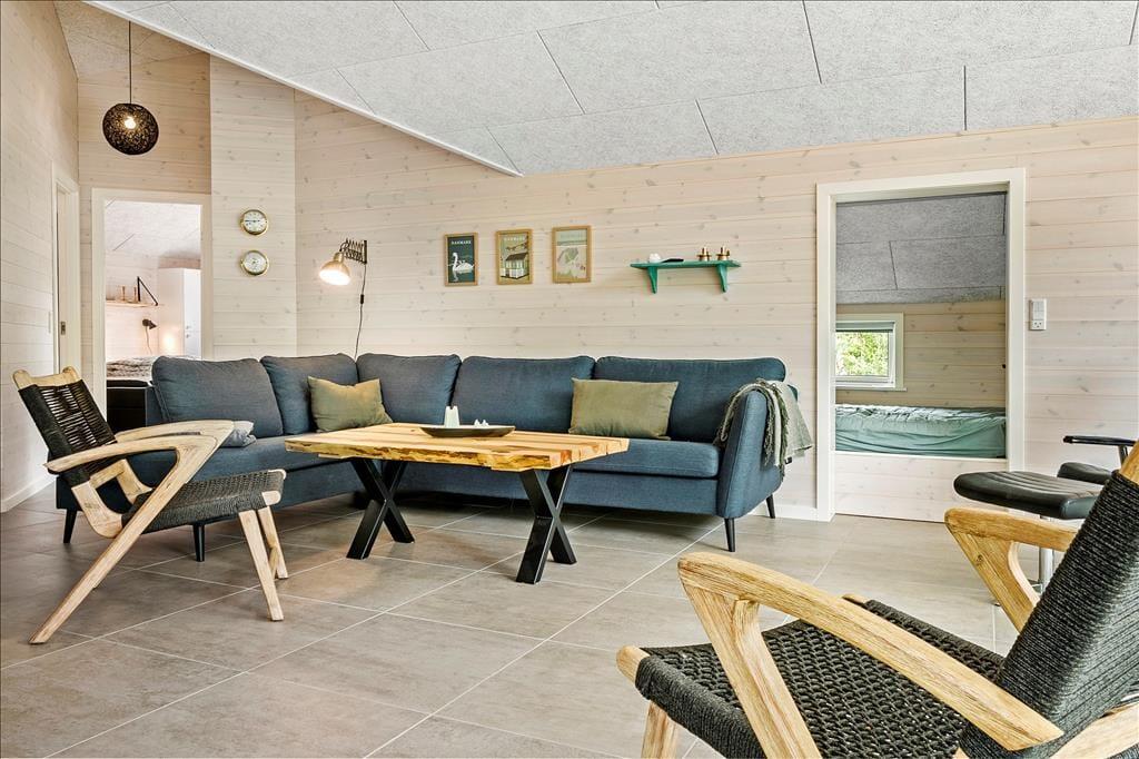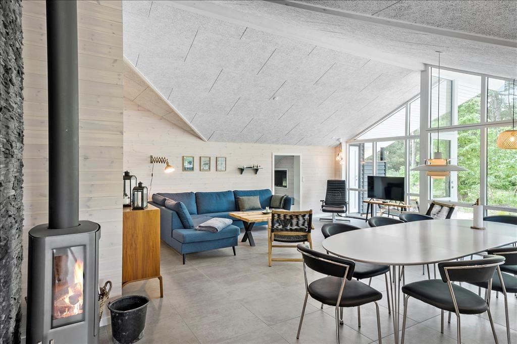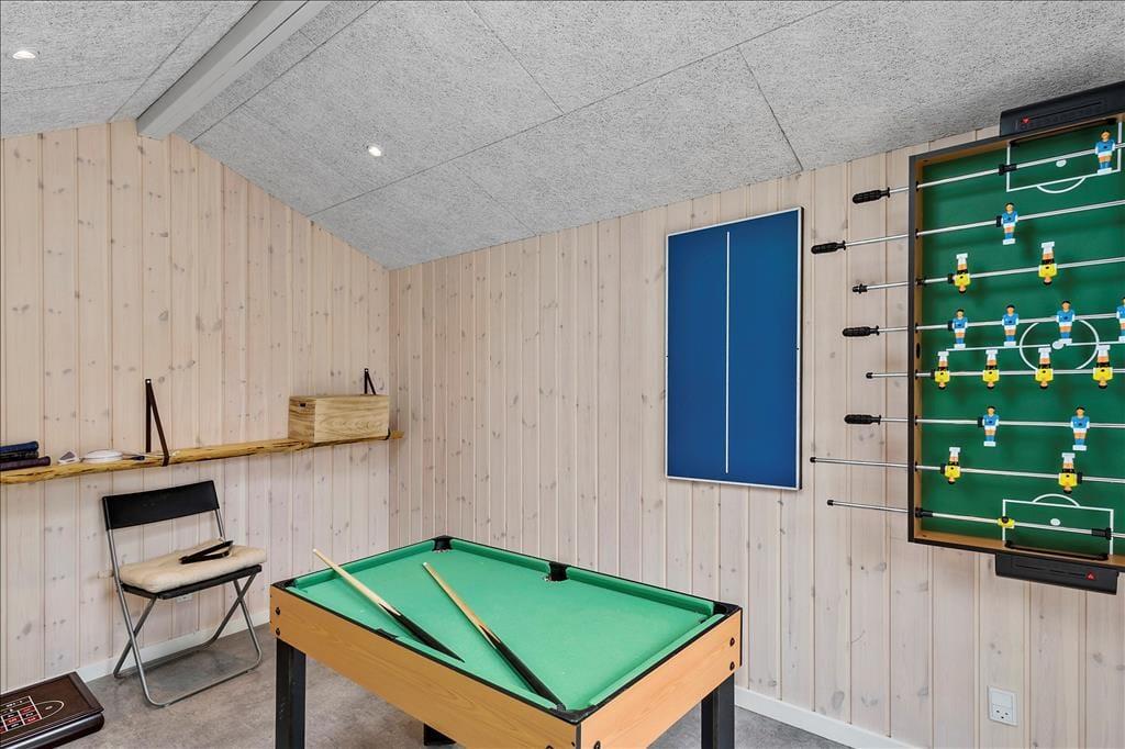 Med et nyopført kvalitetshus som dette er rammerne om de indendørs hyggestunder både flotte og komfortable. Alle rum er indbydende indrettet, og akustiklofterne, trævæggene og det gode lysindfald bidrager til den behagelige og charmerende sommerhusatmosfære. I opholdsrummet har I god plads til at samles, både i det flotte åbne køkken, omkring spisebordet ved brændeovnen og i sofaafdelingen. En alkove med dobbeltseng ligger i forbindelse med stuen, som også har direkte forbindelse til tre gode soveværelser, så alt i alt er der sengepladser til otte personer i huset. En entré med vaskemaskine og tørretumbler hører med til planløsningen foruden to badeværelser, hvoraf det ene er udstyret med både sauna og spabad. Det er med andre ord perfekt til en tilbagelænet pause – og hvis I er mere i humør til lidt sjov og ballade, kan I smutte over i aktivitetsrummet, hvor I kan spille bordfodbold, bordtennis og andre spil i miniformat.