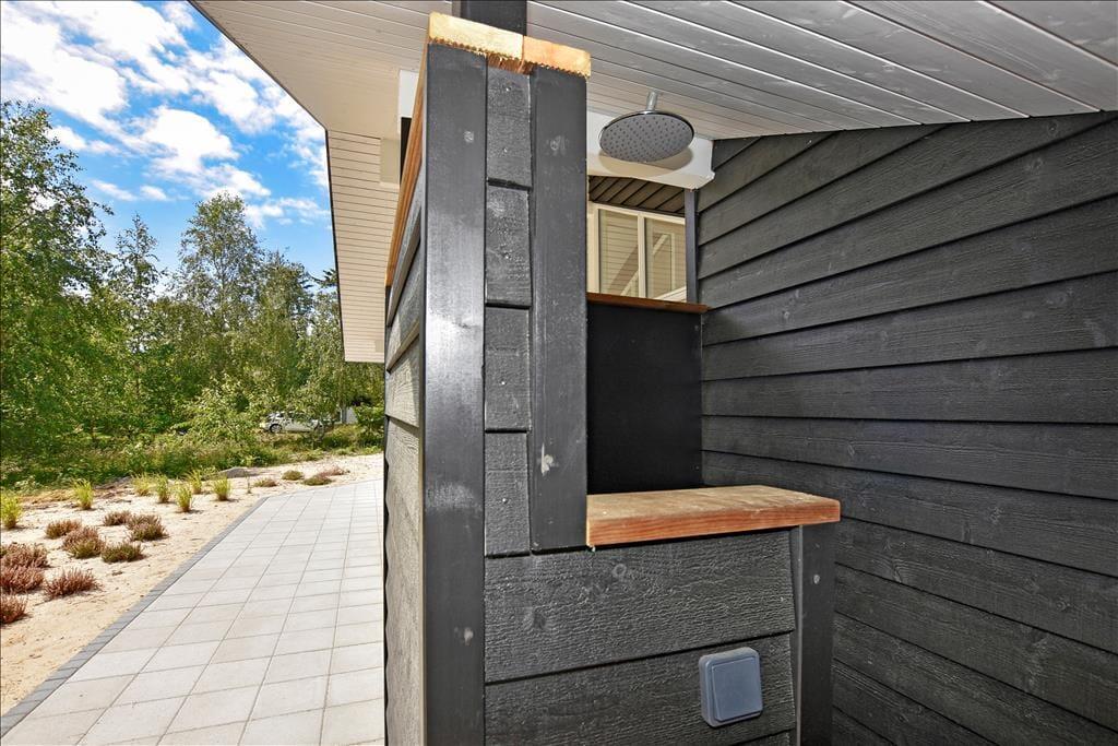 Hele vejen rundt om sommerhuset breder et flisebelagt terrasseområde sig. Her er både åbne, overdækkede og afskærmede arealer, så det er nemt at finde den helt rette opholdsplads, uanset om I søger sol, skygge eller læ. Trænger I til at blive frisket op, er der etableret en lækker udendørsbruser lige ved huset, og bliver I sultne, hører der naturligvis en grill med til de tjekkede faciliteter på den 2.500 m² store naturgrund.