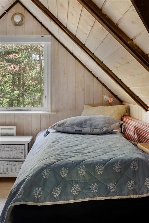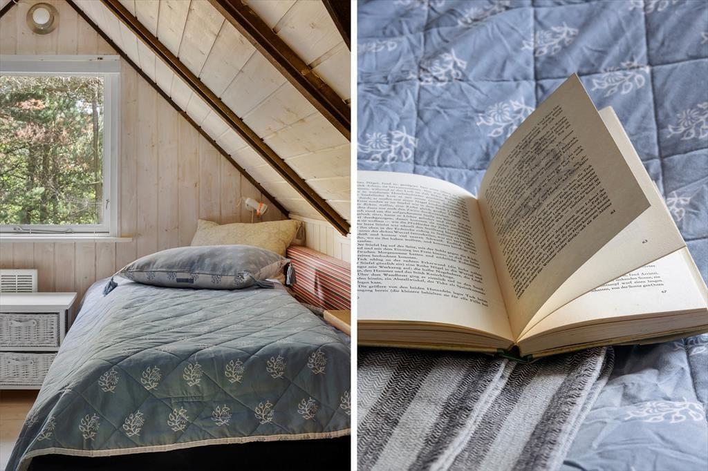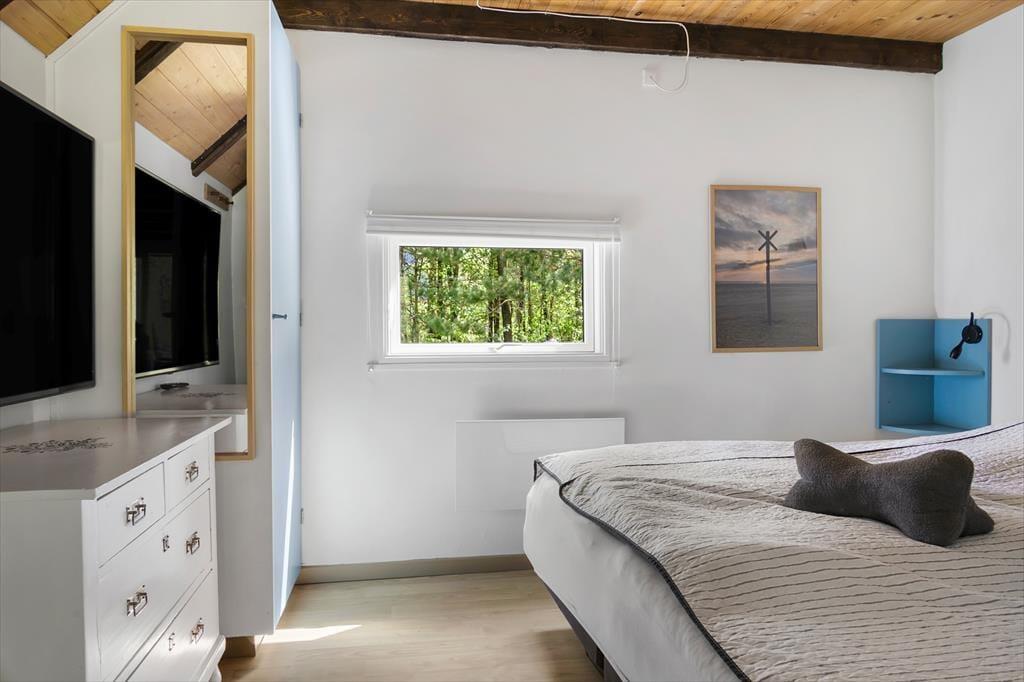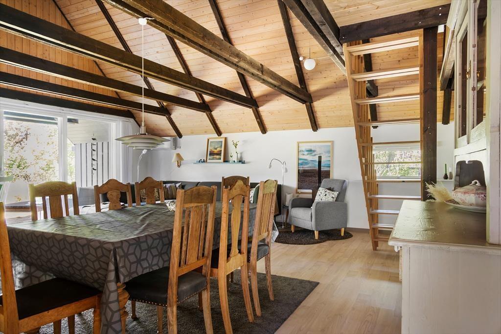Sommerhuset har ligget her i de smukke naturomgivelser siden 1978, og siden opførelsesåret er det blevet pænt vedligeholdt og opdateret. Inden døre er der vaskeægte sommerhusstemning for alle pengene med lyse trævægge, loft til kip med rustikke hanebjælker, komfortabelt møblement og endda en hyggespredende brændeovn i stuen. En varmepumpe sørger for et behageligt indeklima, mens den åbne køkkenafdeling giver dig en god og funktionel base, når der skal kokkereres. Trænger du til at slappe fuldstændig af, kan du benytte dig af saunaen, der ligger i forlængelse af badeværelset i stueplan. Og hvis varmen gør dig døsig, kan du tage en velfortjent middagslur på et af sommerhusets tre soveværelser, hvoraf to er placeret på førstesalen.
