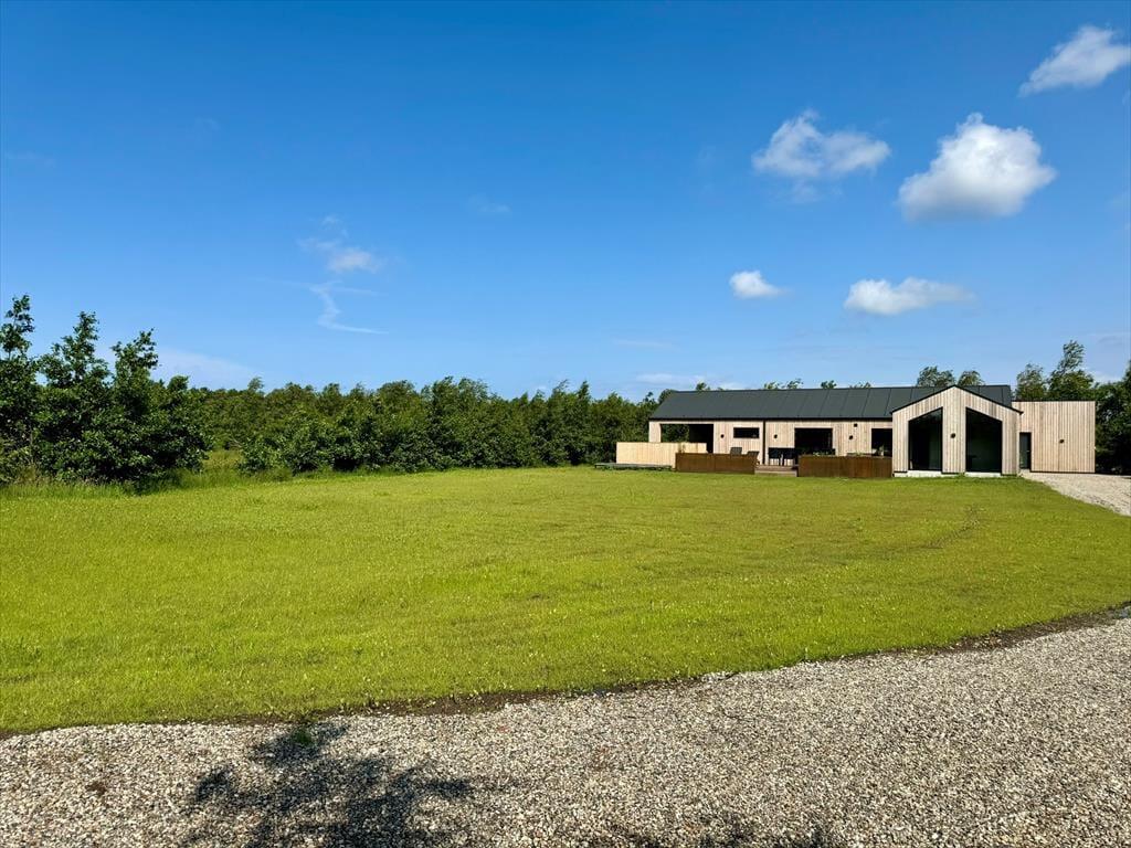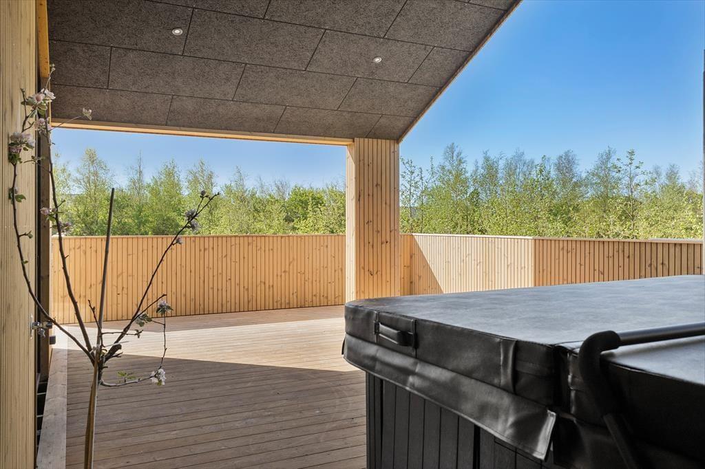 Sommerhuset ligger på en 2850 m² stor naturgrund. Fra stuen har I direkte adgang til en stor og delvist overdækket terrasse, og her finder I et lækkert spabad, så I kan slutte dagen af på rolig vis, når I er færdige med at grille og spille havespil på græsplænen.
