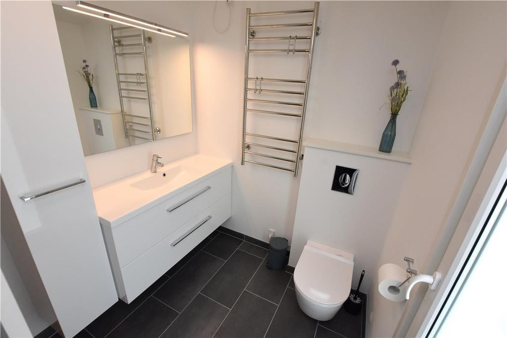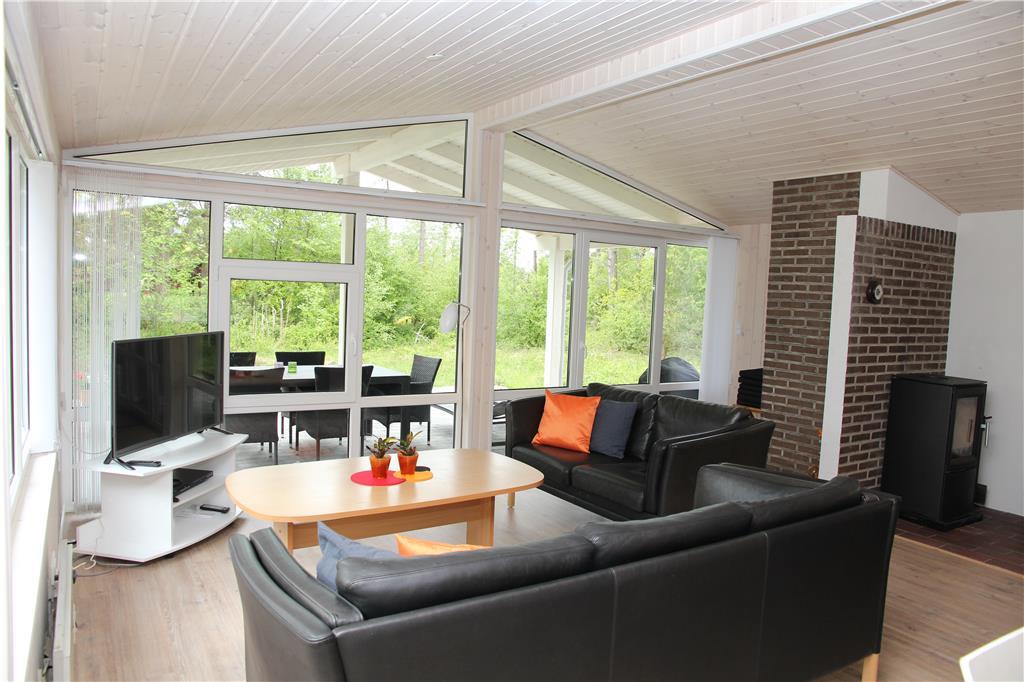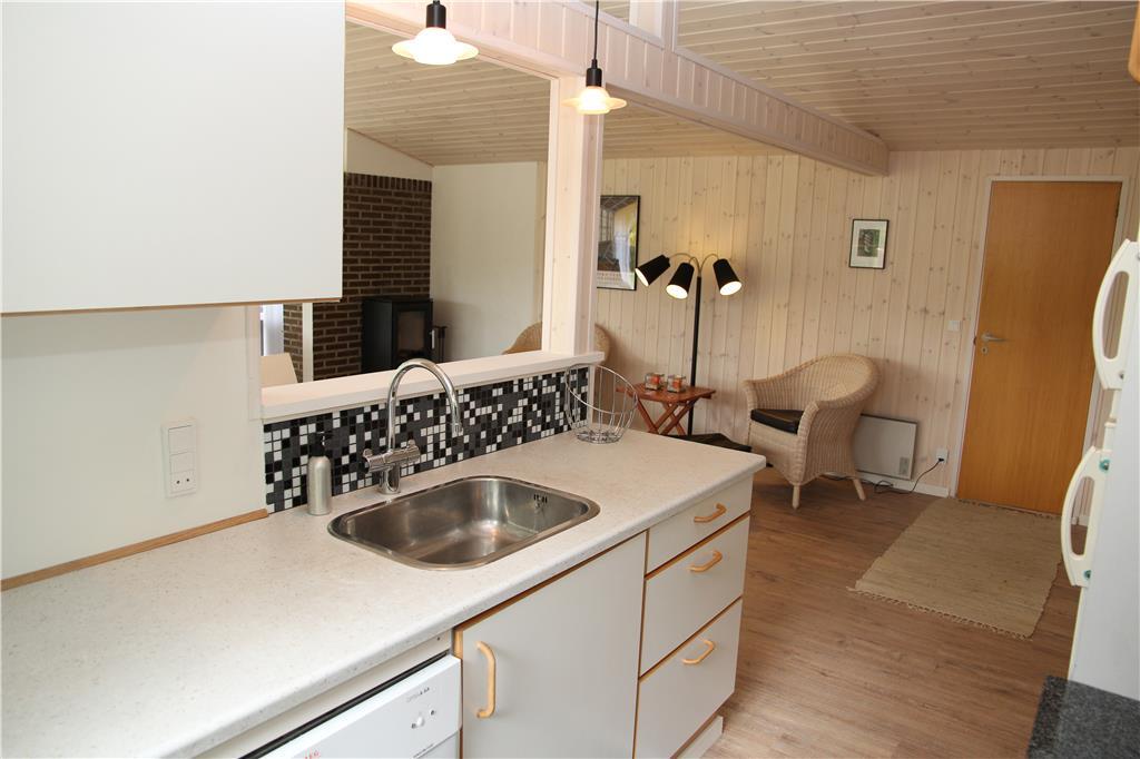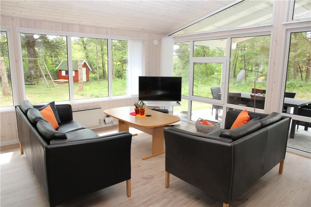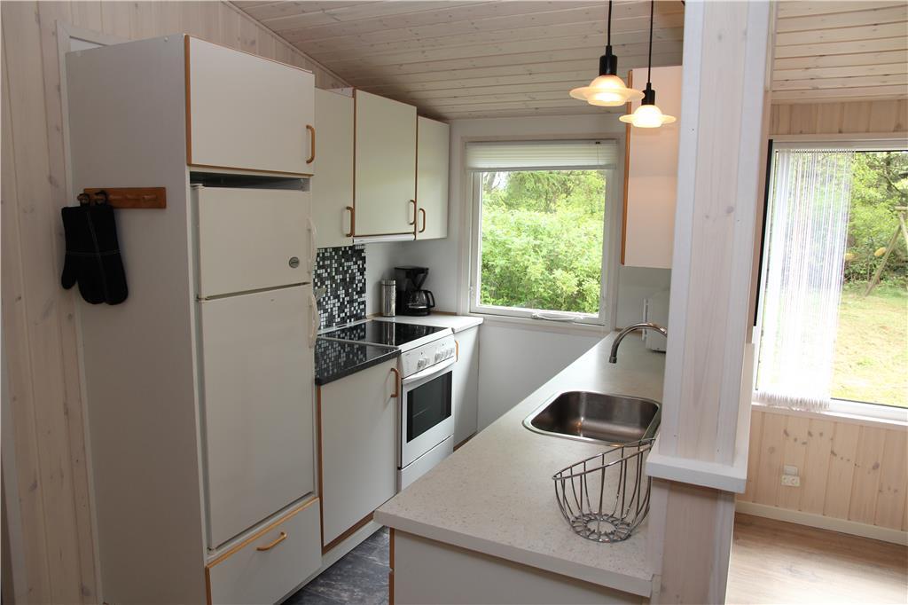 Sommerhuset bærer navnet ’Jenle’, der betyder enlig på vestjysk – og selvom du bor i et veletableret sommerhusområde, giver udsigten til grundens træer og grønne bevoksning dig fornemmelsen af, at du bor helt ugeneret i et skovbryn. Omgivelserne kan i fulde drag nydes inde fra huset, især fra stuen, som er udstyret med store vinduespartier. Ligesom resten af rummene fremstår opholdsrummet lyst og moderne, for sommerhuset blev udvidet i 2015 og senere gennemgribende renoveret i 2019. Stuen er således indrettet med stilfulde møbler, en ny brændeovn og et 42” fladskærms-tv, mens det integrerede køkken giver dig en hyggelig og veludstyret ramme om madlavningen. Tre lyse soveværelser hører også med til planløsningen foruden et lækkert badeværelse, hvor du kan slappe af i saunaen på ægte livsnydermanér.