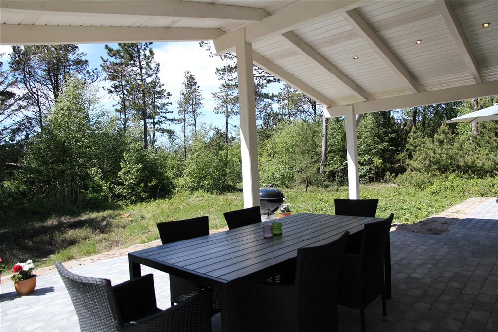 På den 2700 m² store naturgrund er der flere uforstyrrede terrasser at vælge imellem. De er placeret både øst og vest for huset, så dagen lang kan du finde en solrig opholdsplads – eller vælge det overdækkede terrasseområde, hvis du foretrækker skygge. Har du små børn med på ferie, er der både legehus, sandkasse og gyngestativ på grundens græsplæne.