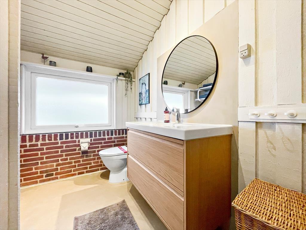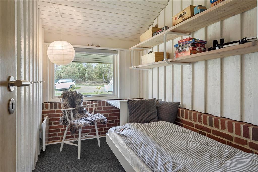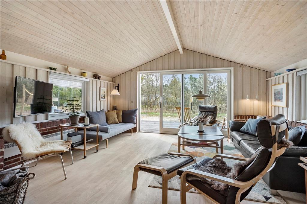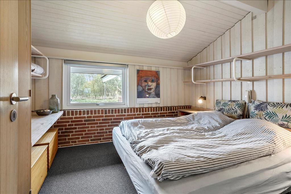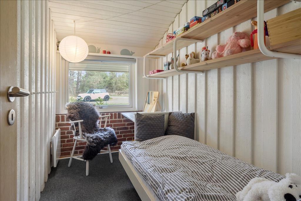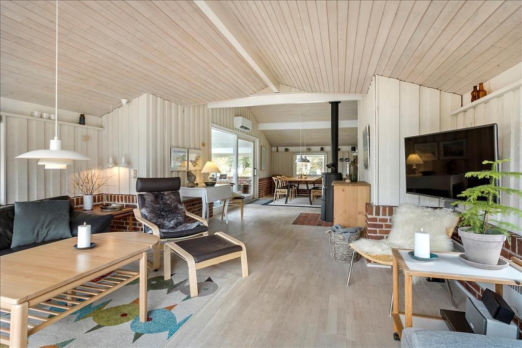 Sommerhusets mange kvadratmeter er fornuftigt fordelt mellem opholdsrum og soveværelser samt praktiske brugsrum som bryggers og badeværelse. Alle rum fremstår lyse og velholdte – inklusiv soveværelset i annekset, der er indrettet med dobbeltseng. I hovedhuset er der desuden fire sovegemakker: To af dem er indrettet med en enkelt seng, mens det tredje rummer to enkeltsenge, og på det største står en dobbeltseng. Når du skal tilbringe tiden sammen inden døre, kan I mødes i opholdsafdelingen, hvor køkken og stue ligger i åben forbindelse. Med gennemstrømmende lysindfald, loft til kip og hvidmalede trælister på væggene er det et lyst og luftigt rum, og brændeovnen er samtidig med til at skrue op for hyggestemningen. Er det køligt udenfor, kan du desuden tage varmepumpen i brug, når I hygger jer inden døre med brætspil, krimilæsning, krydsogtværs og madlavning.