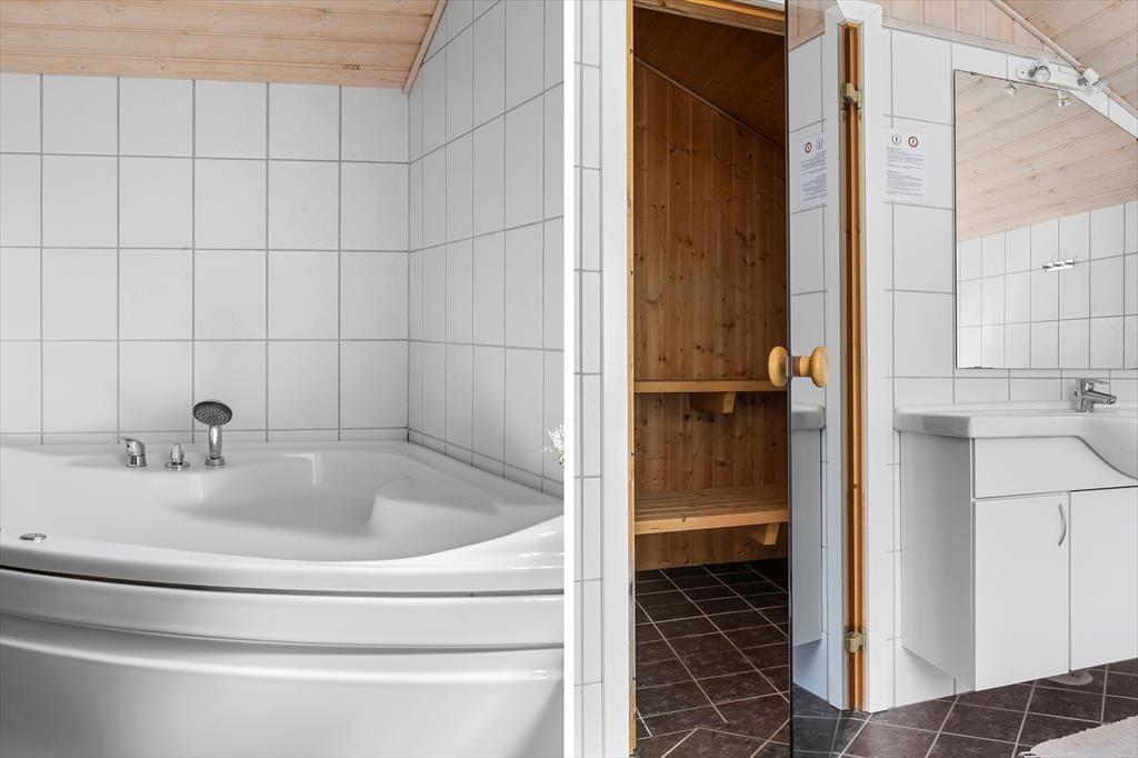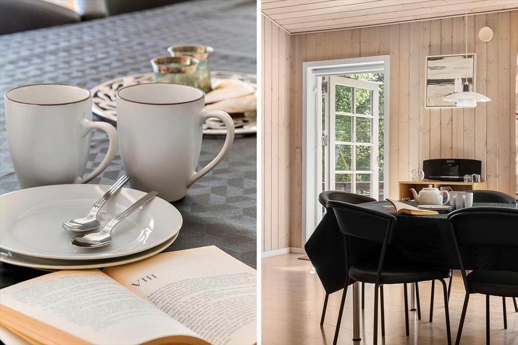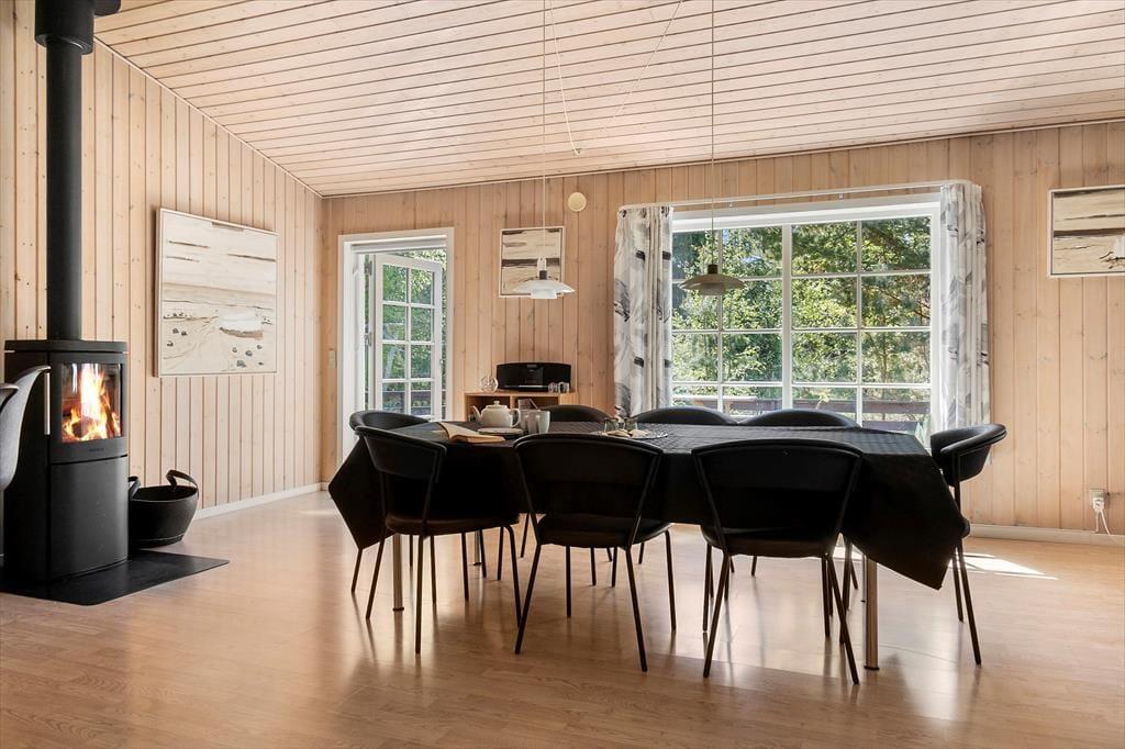 Dette hyggelige sommerhus folder sig ud med en dejlig grund, omkranset af høje træer, der skaber en naturlig afskærmning og giver en privat og fredelig atmosfære. Indenfor byder huset på en varm og indbydende atmosfære, hvor lyse trævægge og store vinduespartier inviterer naturen ind. Forestil dig at sidde foran pejsen med en kop varm kakao, eller ligge på sofaen om sommeren mens lydene fra naturen trænger ind gennem de åbne vinduer. Den velindrettede stue er kombineret med et moderne køkken og fra de komfortable soveværelser kan du vågne op med udsigten til den grønne have. Et af de to badeværelserne er udstyret med spa og sauna, perfekt til afslappende wellnessaftener, hvor du kan lade hverdagens problemer forsvinde i boblerne eller i den dejlige saunavarme.
