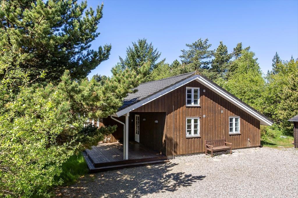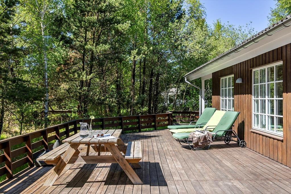 Det private udeareal på denne store, velholdte grund giver talrige muligheder for udendørs hygge. Her er der høje træer, der skaber dejlig læ og skygge, og en shelter, hvor du kan sove under stjernerne, når vejret tillader det. De mange terrasseområder er perfekte til solbadning, afslapning med en god bog eller for at nyde din morgenkaffe foran den grønne baghave. Den store have indbyder til børneleg, med gyngestativ, sandkasse og plads til boldspil eller blot at ligge i liggestolene og lade tankerne flyde. Omgivelserne skaber en fredfyldt ramme for den perfekte ferie, hvor du virkelig kan mærke roen og nyde den friske havluft.