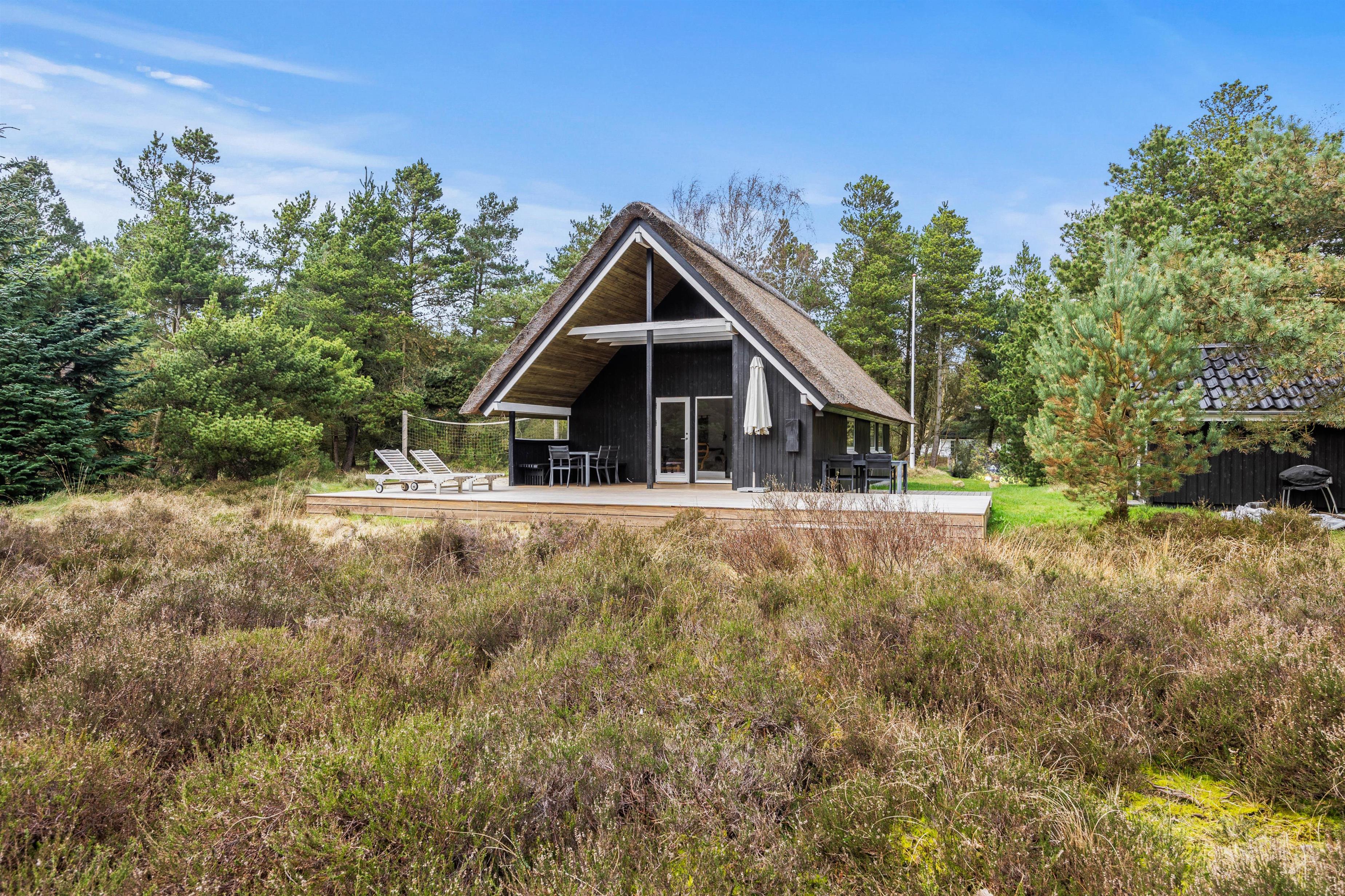 Allerede udefra ser der hyggeligt ud på Rylen 7 ved Sønderstrand med det stråtækte feriehus, træterrasse og opvokset fyrrebeplantning. Man føler feriestemningen straks, man træder ind ad døren. De lyse gulve og hvidmalede, træbeklædte vægge og lofter giver en dejlig lys og let stemning. I stuen kan I slappe af i hjørnesofaen eller trække jer tilbage med en god bog. Eller I kan se en god film via chromecast. Det åbne køkken indeholder alt, hvad I behøver for at tilberede lækre måltider, som serveres ved spisebordet med den hyggelige bænkekrog. Der er badeværelse med brusekabine i sommerhuset, samt vaskemaskine og tørretumbler, så I kan opfriske garderoben eller håndklæderne i løbet af ferien. Den omkostnings- og energibesparende varmepumpe sørger for behagelige temperaturer i feriehuset.