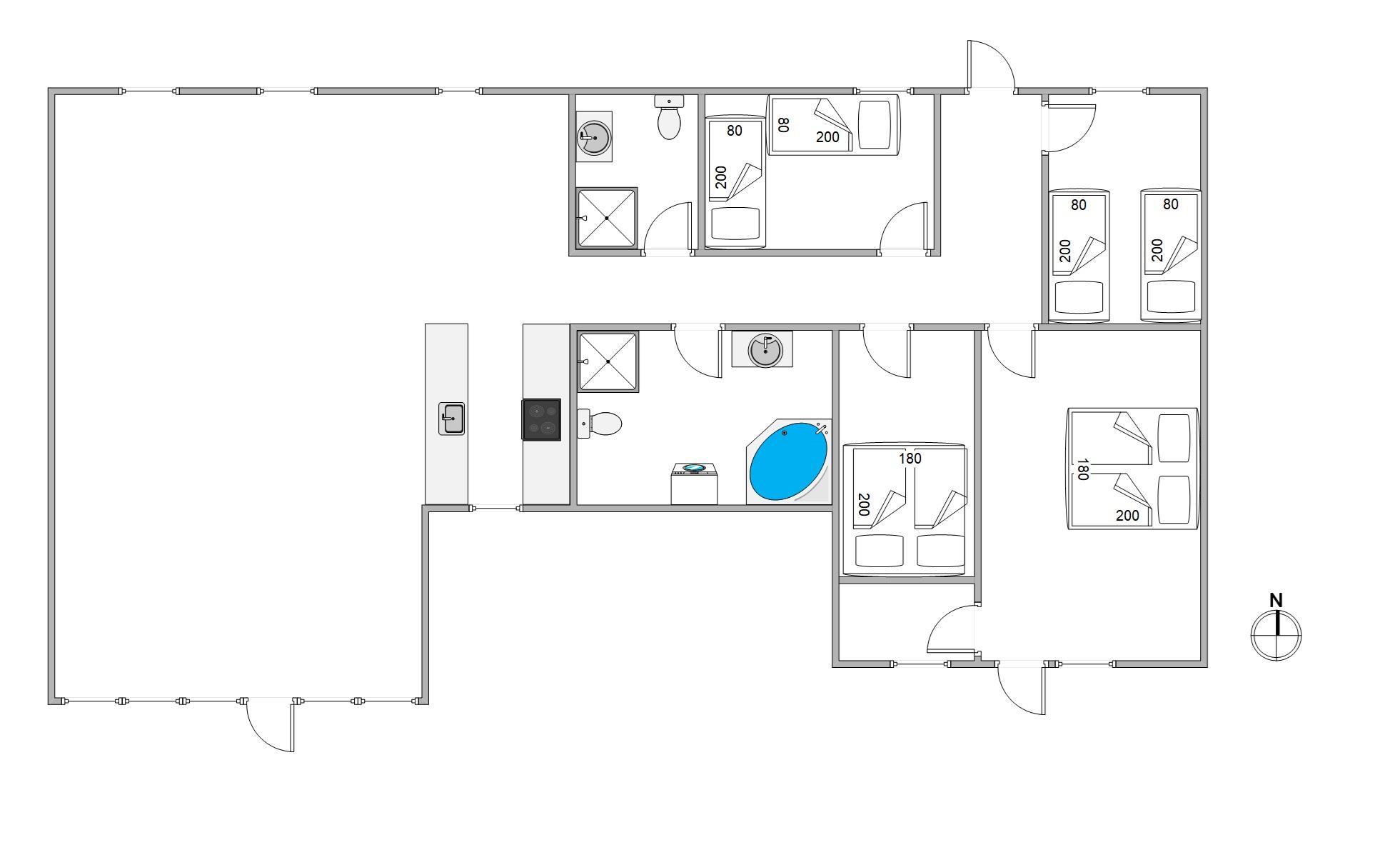 Samlingspunktet i det fantastiske feriehus er det store åbne plan. I kan lave mad sammen i det åbne køkken, tilbringe hyggelige timer ved spisebordet og runde aftenerne af i sofaområdet. Der er flere siddemuligheder, så alle gæster kan finde en hyggelig plads. Takket være den energibesparende varmepumpe kan du altid opretholde en behagelig temperatur i rummet. Der er ikke lang kø foran badeværelserne, da der er 2 badeværelser med gulvvarme til rådighed. Efter en lang gåtur på stranden kan du få varmen og slappe af i husets spabad, som ligger i det store badeværelse.