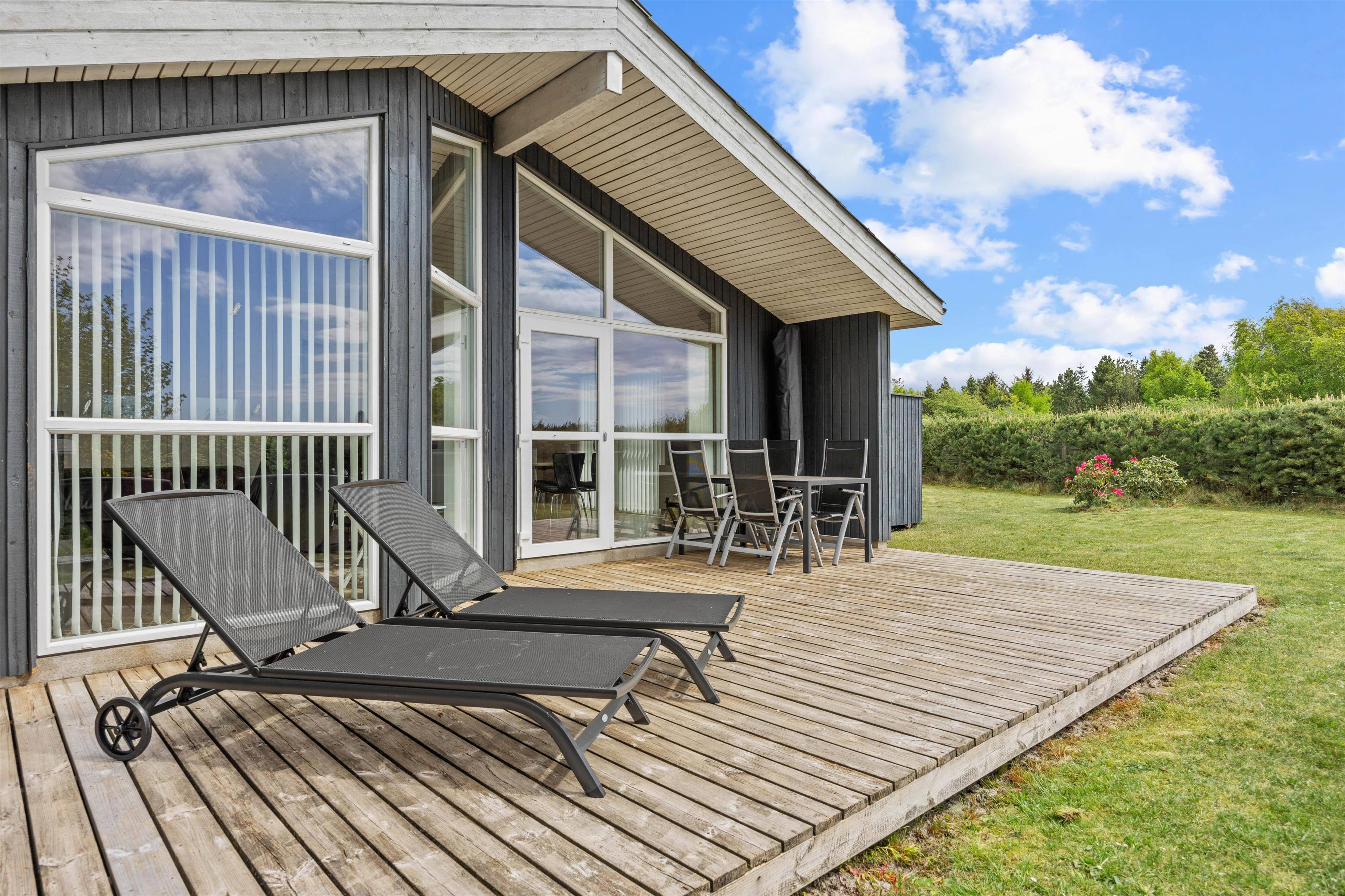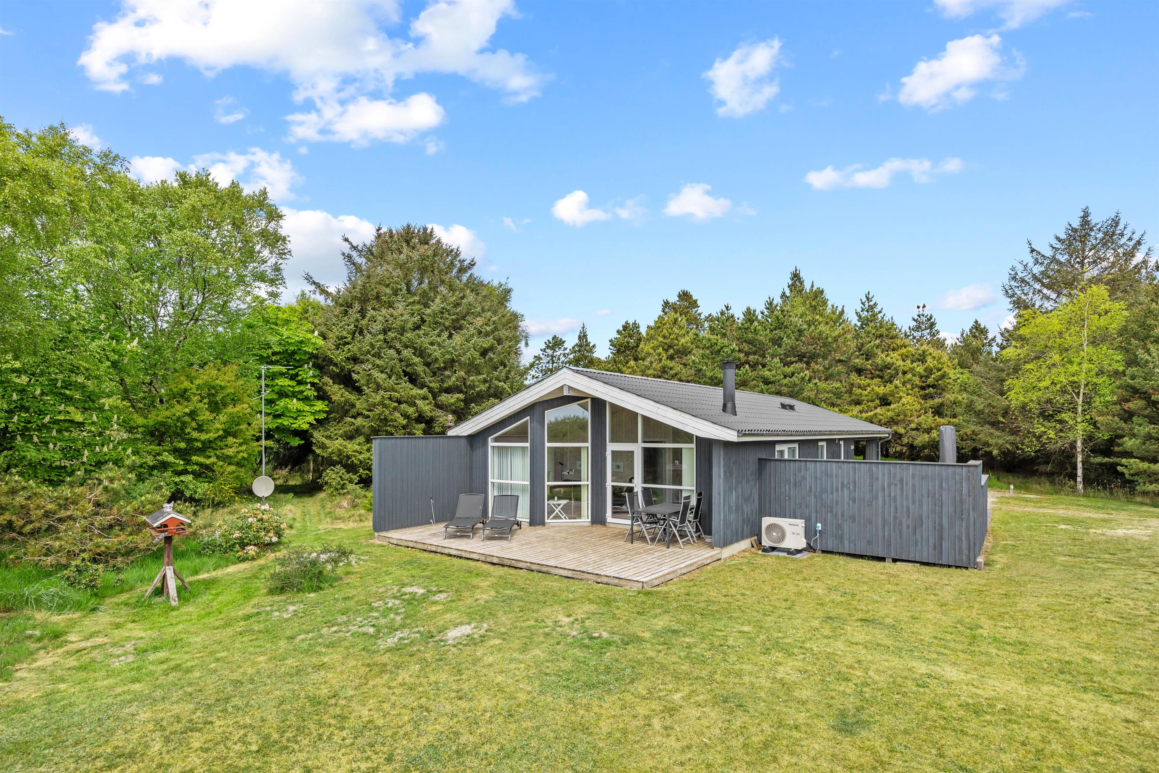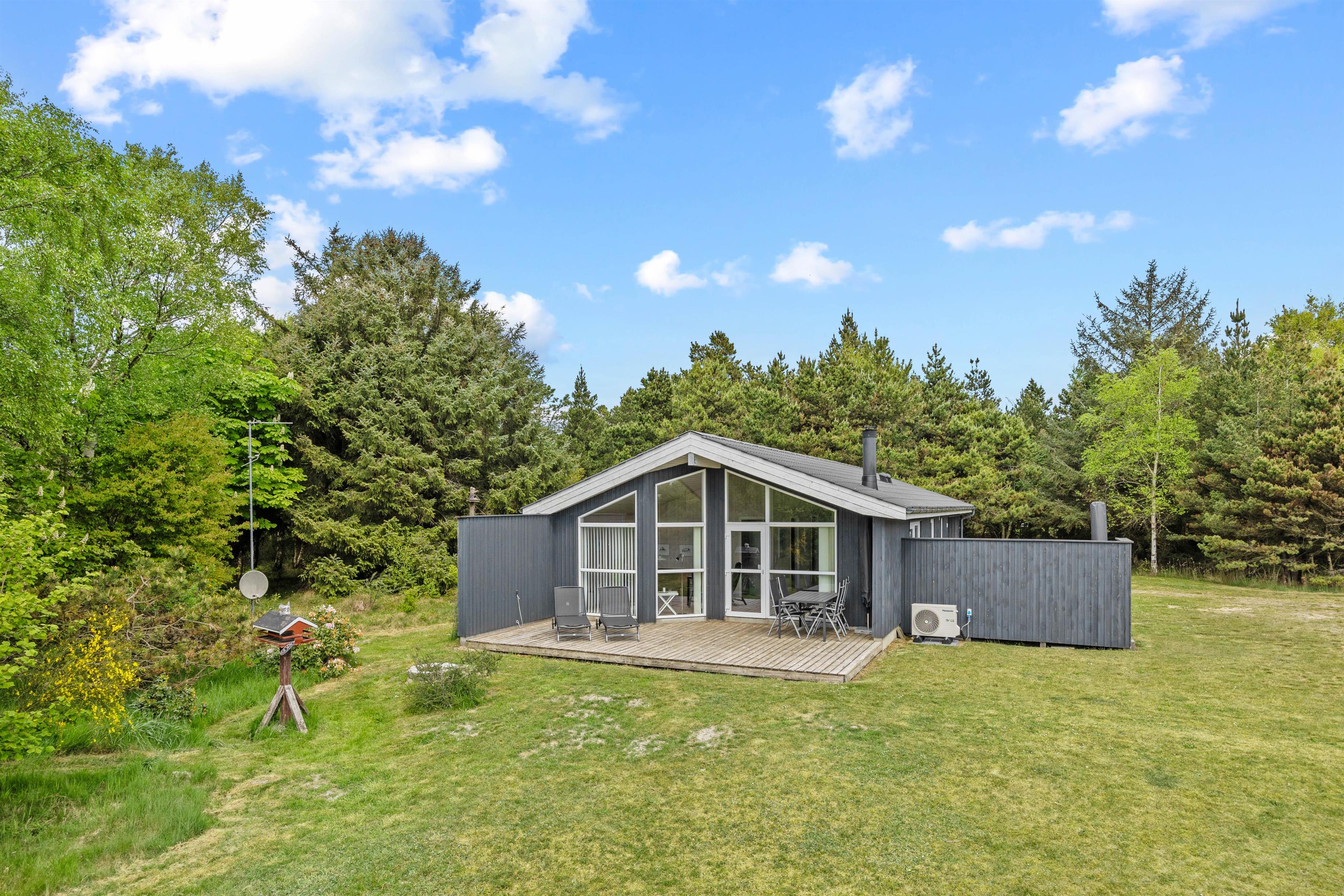 Feriehuset er beliggende på en stor grøn naturgrund, og her er et dejligt terrasseområde, som indbyder til hygge, afslapning og dejlige solskinstimer – havemøblerne står klar til jer.
